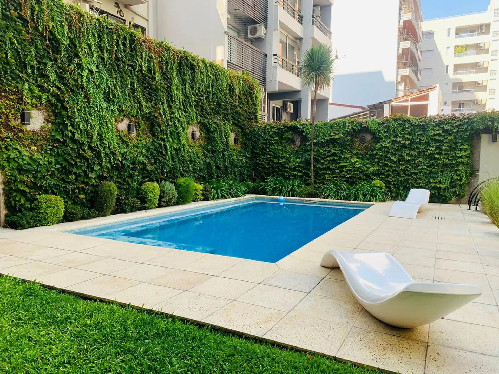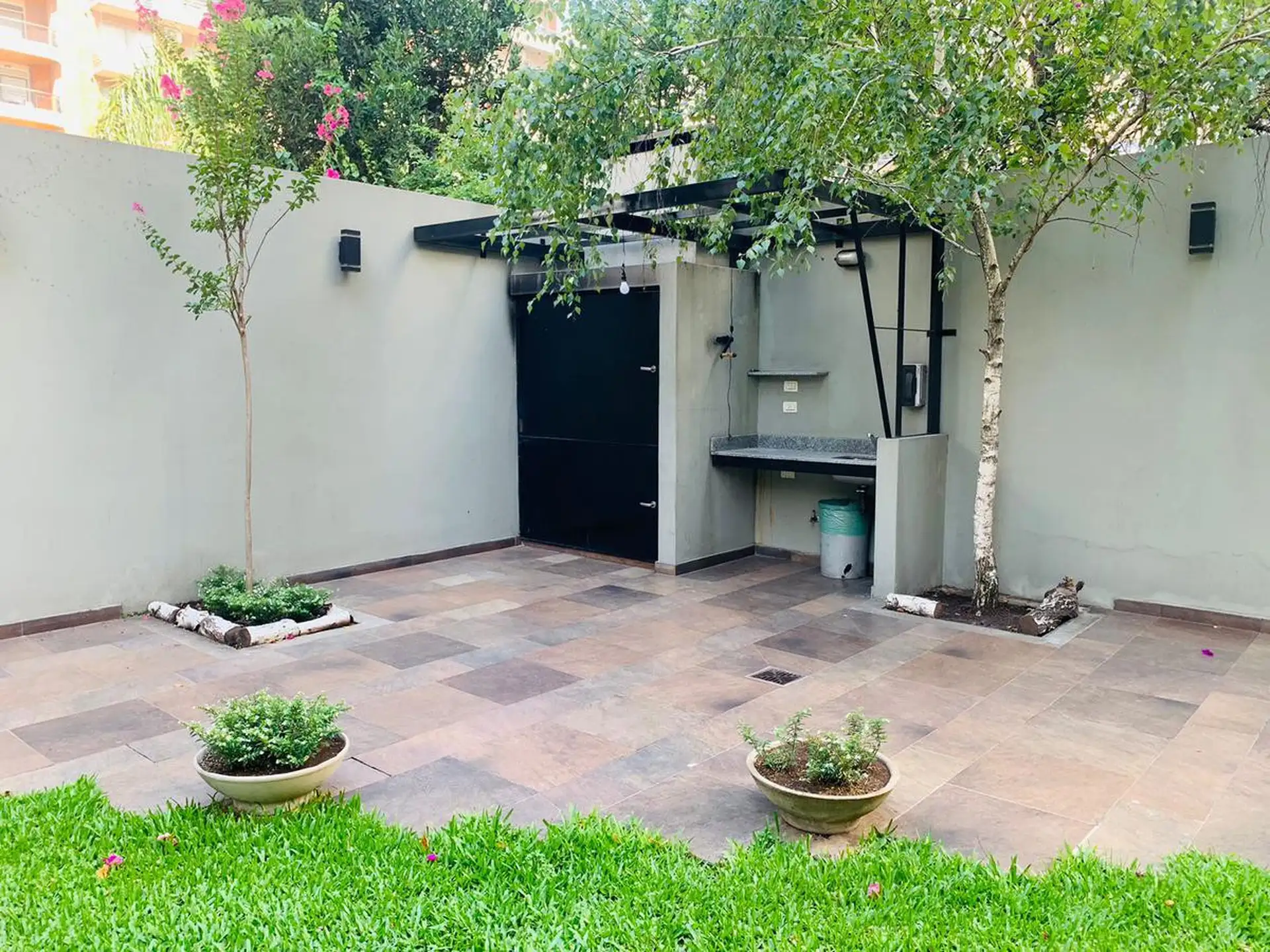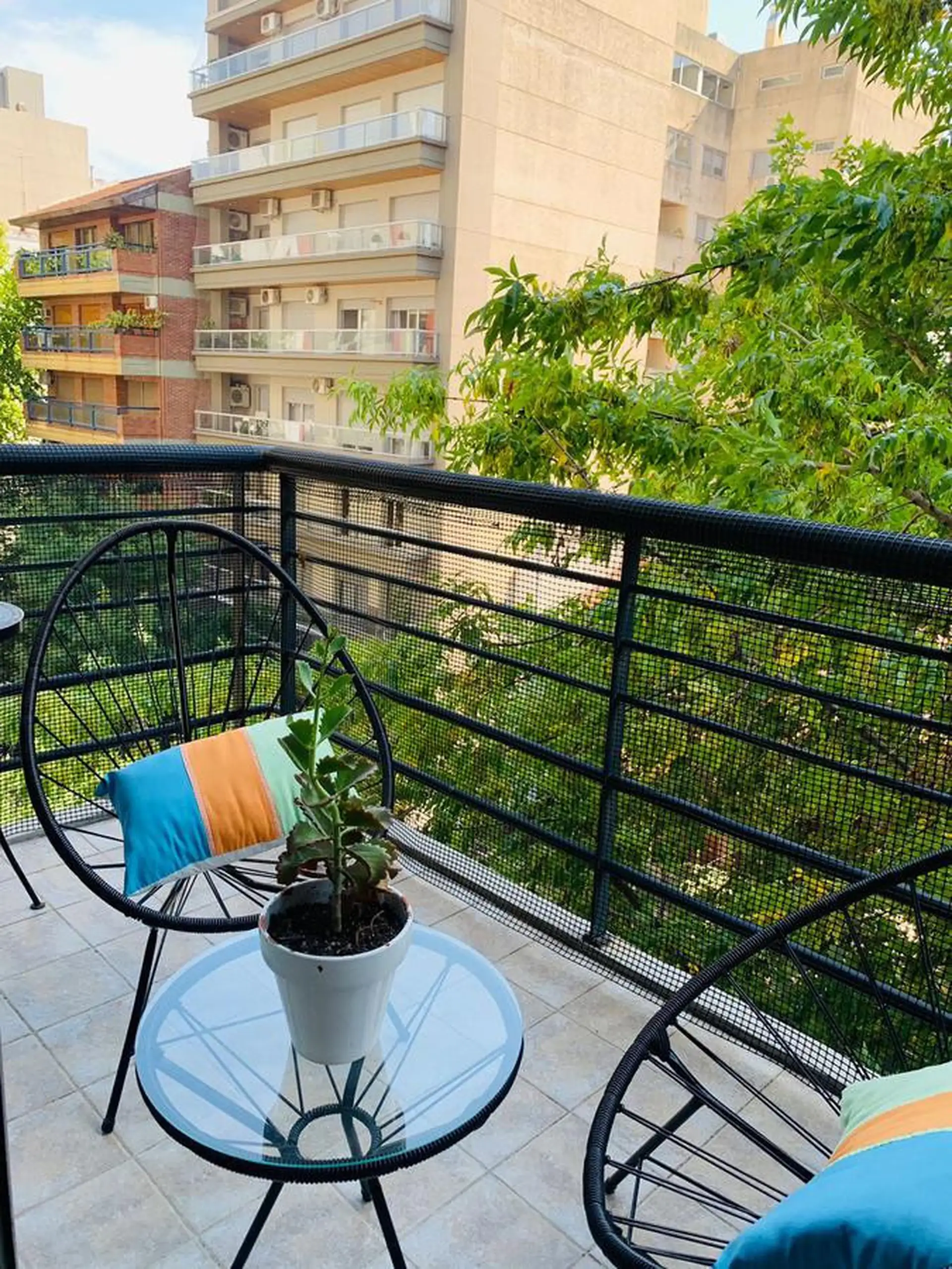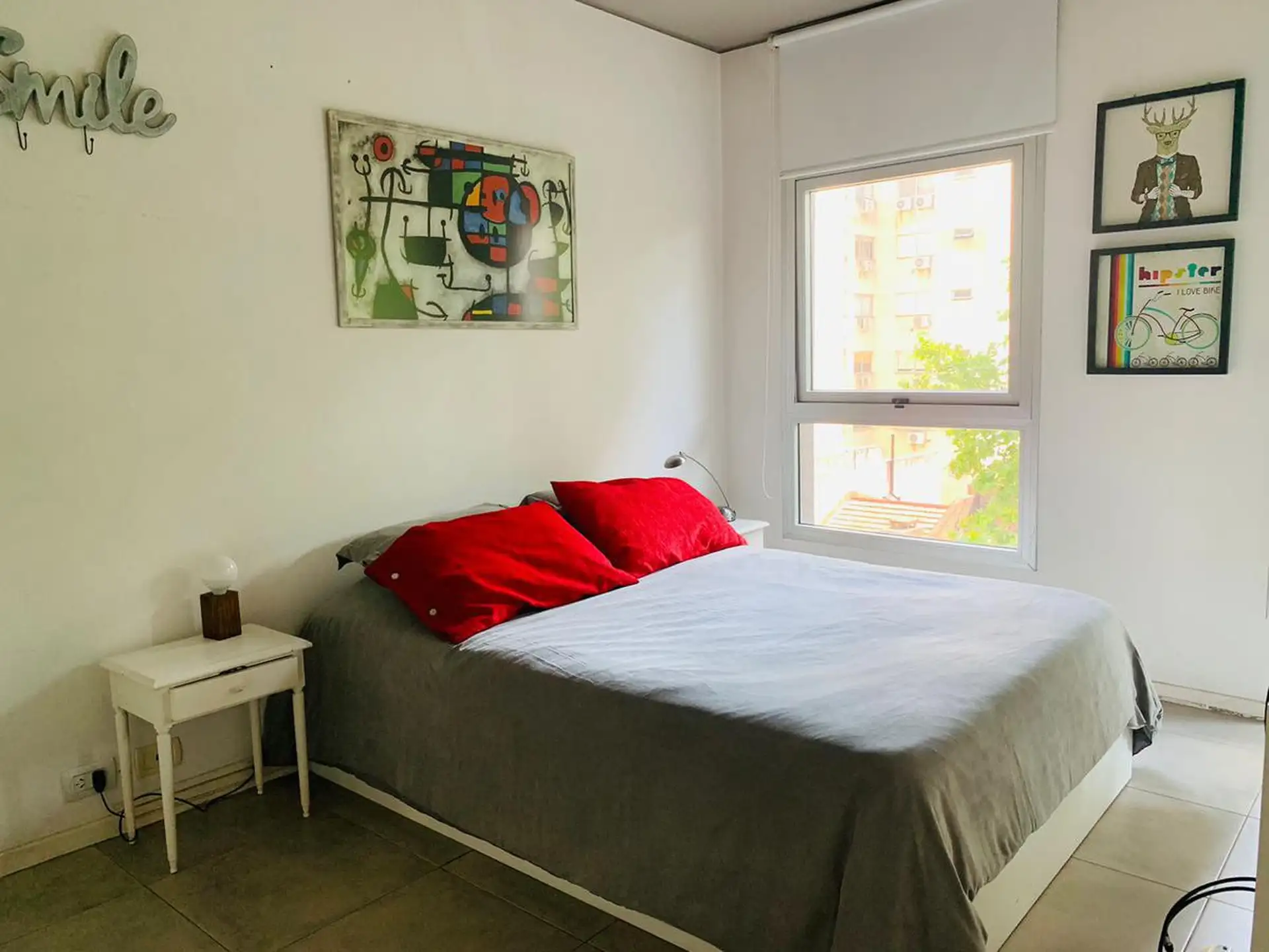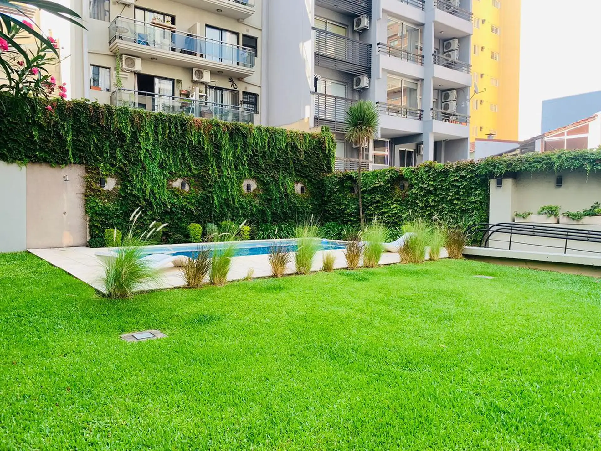 Departamento de 1 ambiente en alquiler temporario en Villa Urquiza. La unidad está equipada con mesa y sillas, mueble divisorio con TV de pantalla plana, cama doble con espacio de guardado, placard y Split frío-calor. La cocina está incorporada con desayunador y cuenta con heladera con freezer, horno eléctrico, anafe de 2 hornallas, pava eléctrica y vajilla; el baño es completo con box de ducha. El edificio dispone de cámaras de seguridad, parque, SUM, parrilla, pileta y laundry, y se ubica a 3