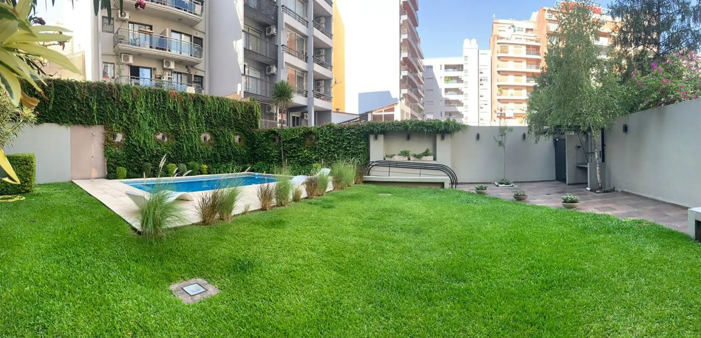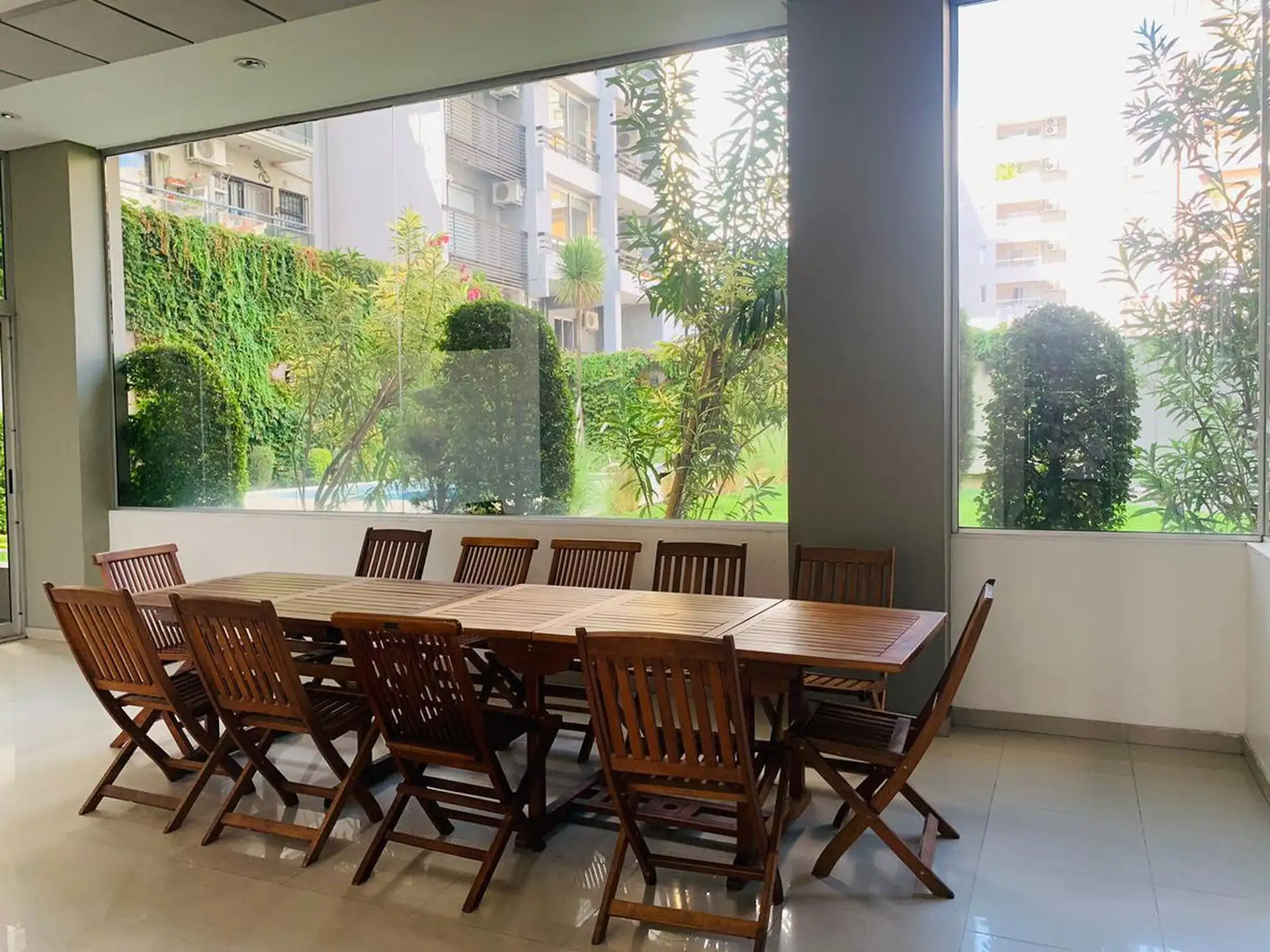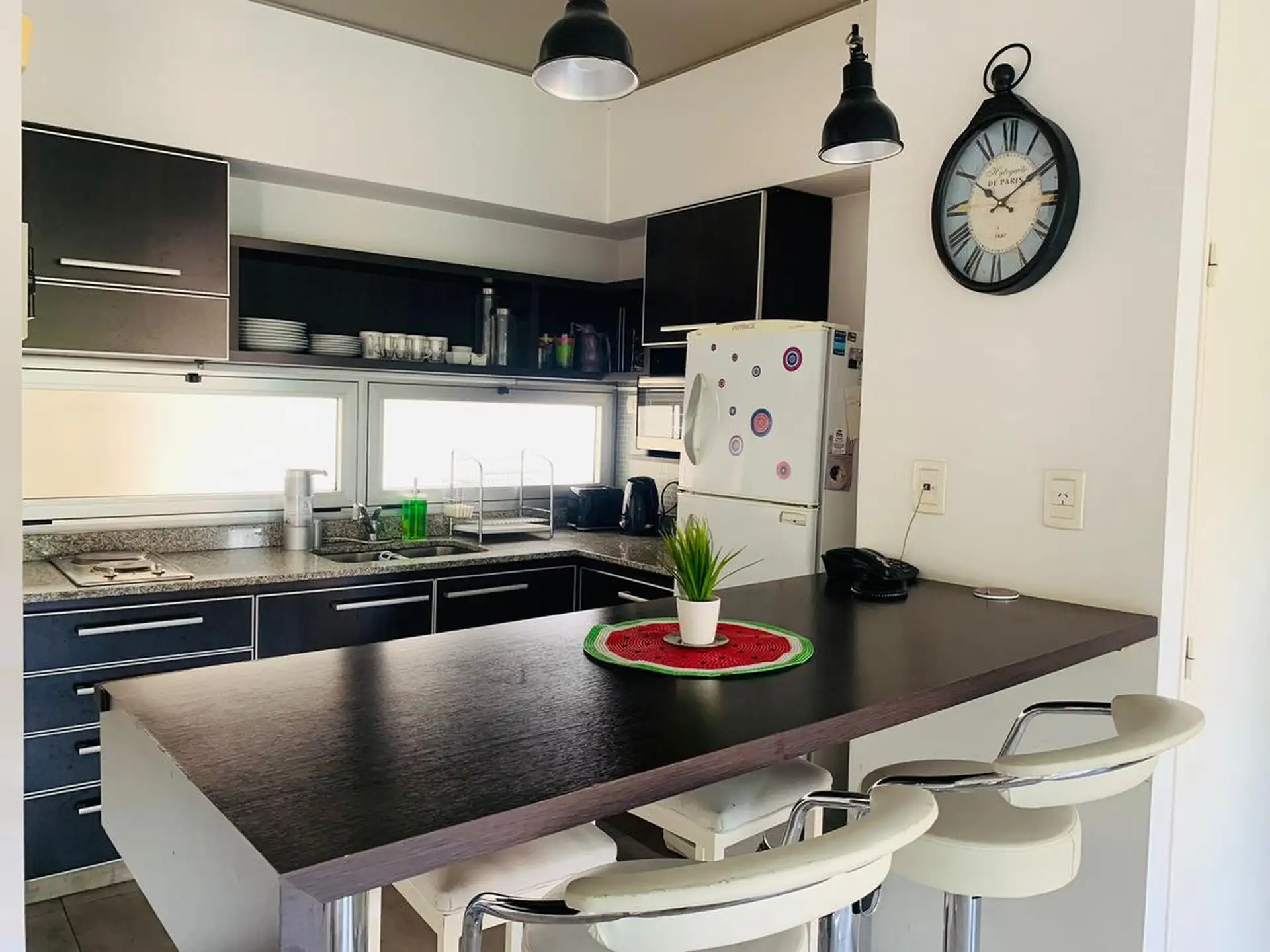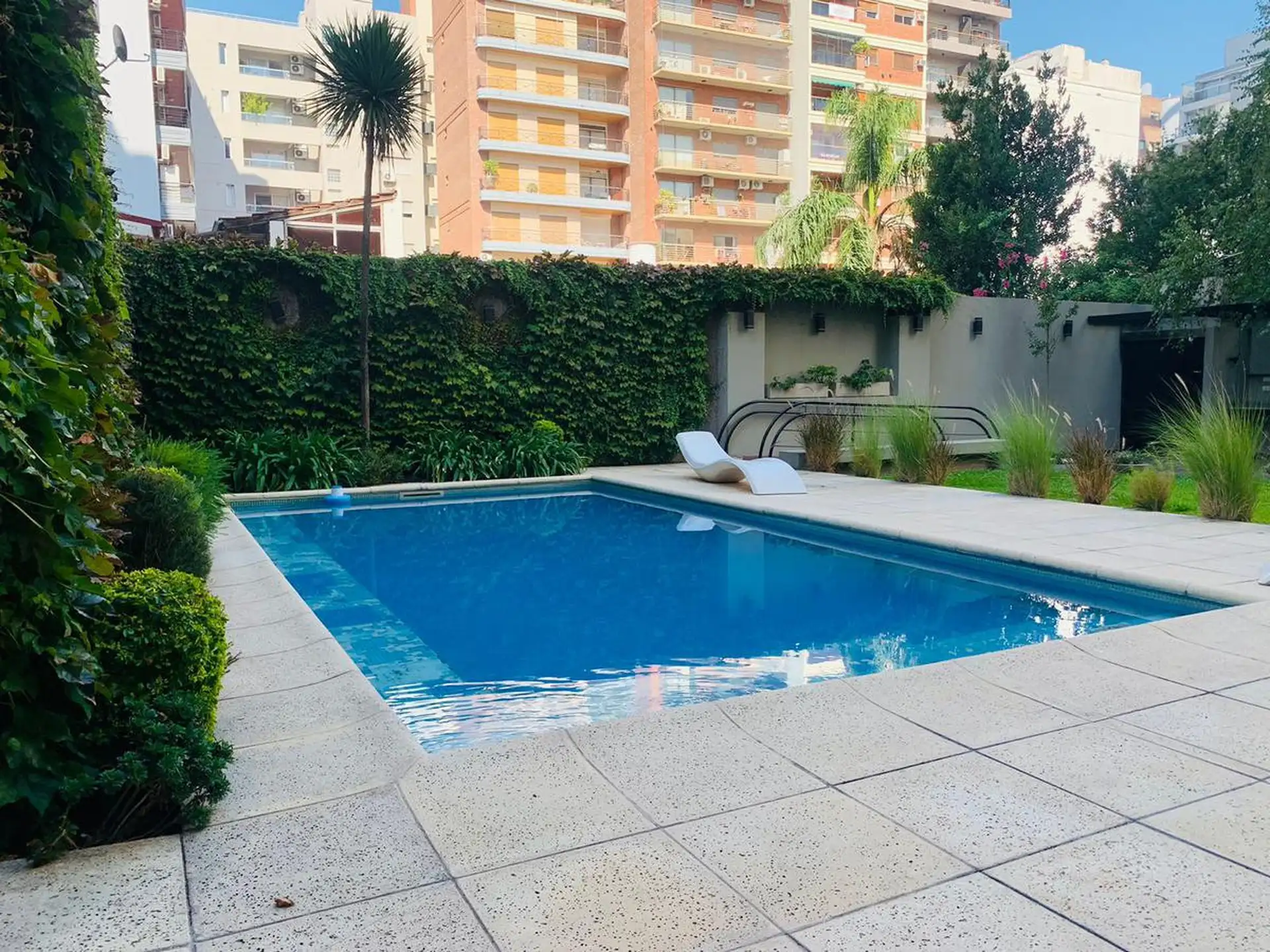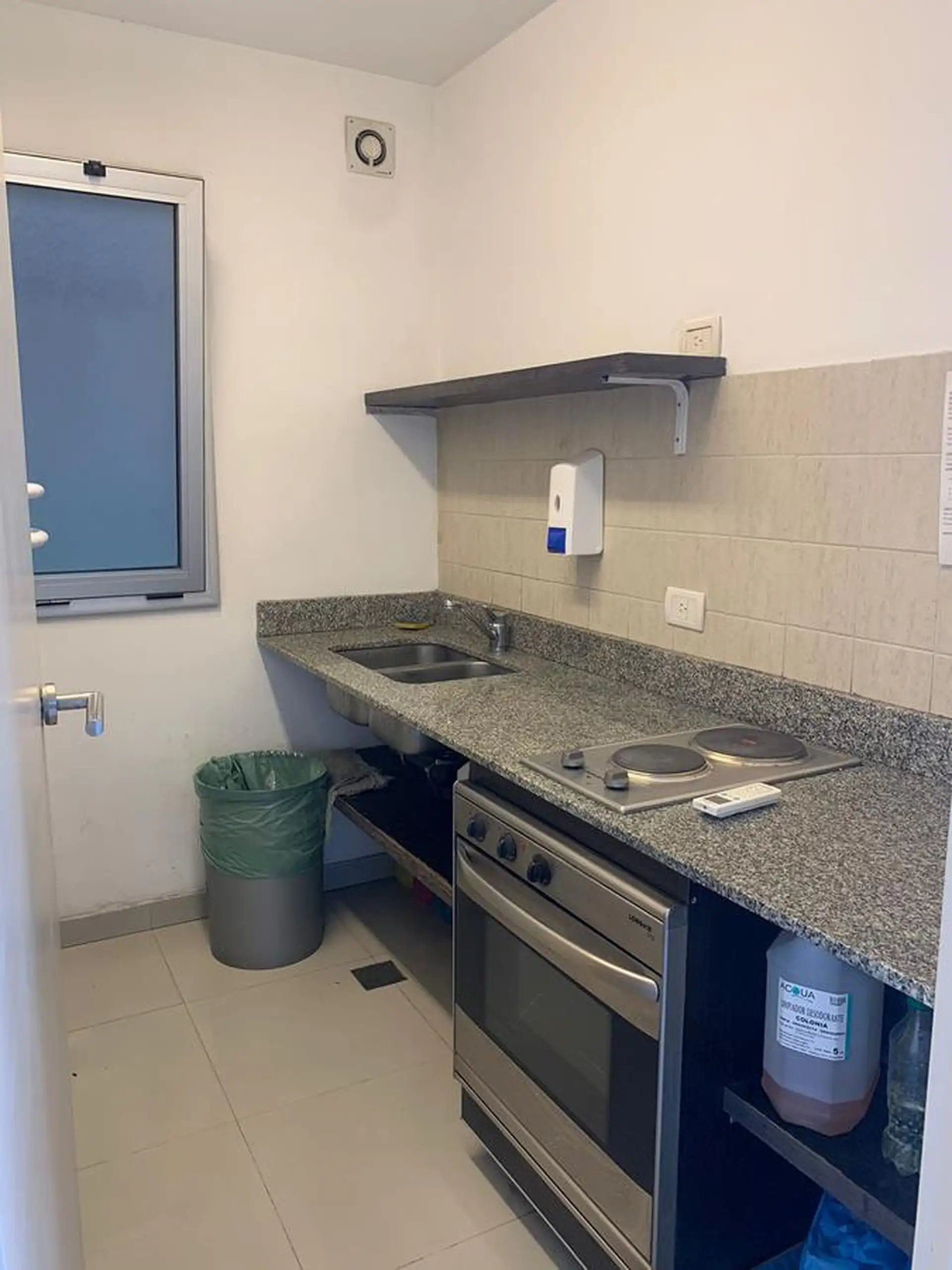 Departamento de 1 ambiente en alquiler temporario en Villa Urquiza. La unidad está equipada con mesa y sillas, mueble divisorio con TV de pantalla plana, cama doble con espacio de guardado, placard y Split frío-calor. La cocina está incorporada con desayunador y cuenta con heladera con freezer, horno eléctrico, anafe de 2 hornallas, pava eléctrica y vajilla; el baño es completo con box de ducha. El edificio dispone de cámaras de seguridad, parque, SUM, parrilla, pileta y laundry, y se ubica a 3
