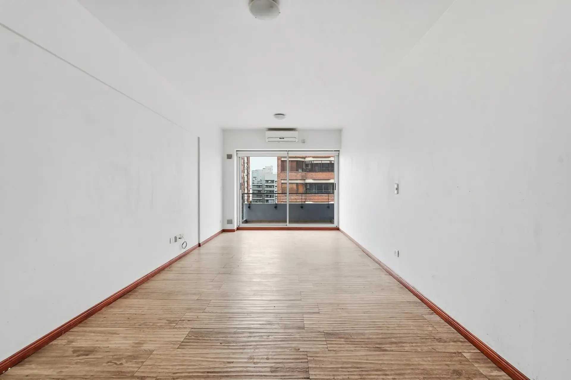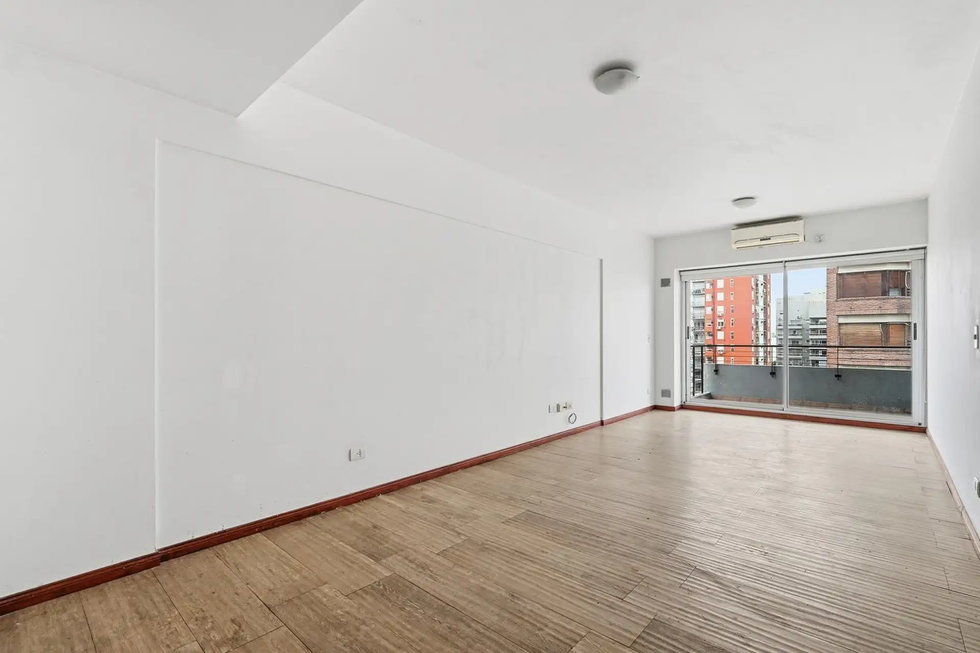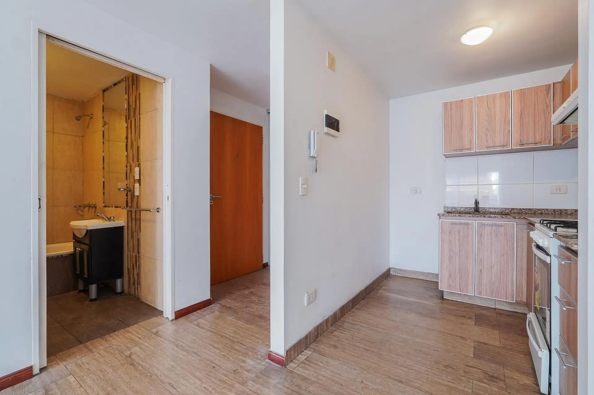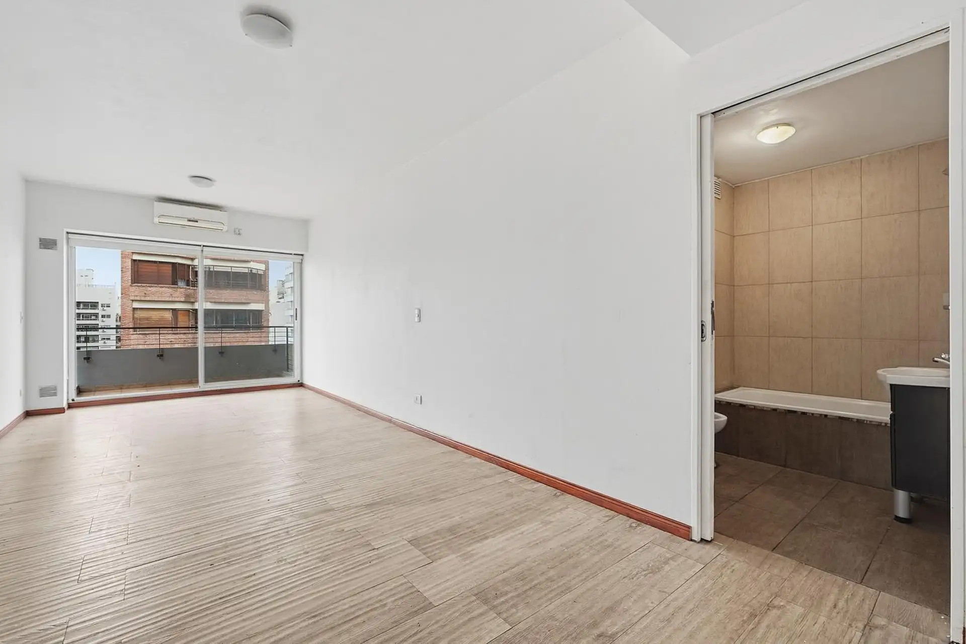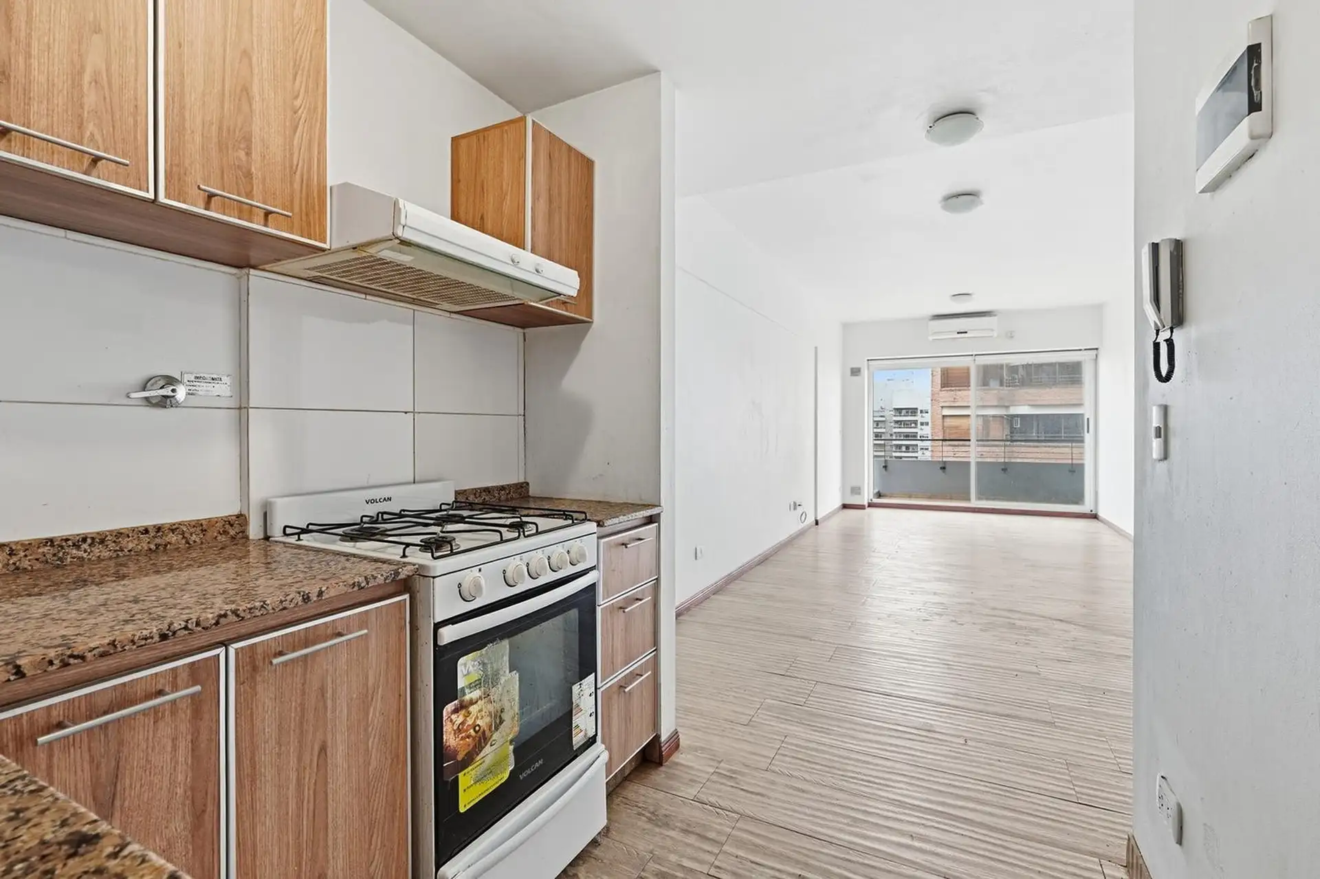 Departamento de 1 ambiente con balcón y vista abierta, al frente, en el 7° piso. Tiene 33 m² cubiertos y 4 m² descubiertos (37 m² según escritura). Cuenta con cocina integrada con muebles bajo mesada y alacena, placard empotrado espejado, aire split frío/calor y conexión para lavarropas; baño completo con bañera y balcón de 3.00x1.55. El edificio tiene 13 pisos, 4 departamentos por piso, 1 ascensor y terraza de uso común; expensas con AYSA incluido.