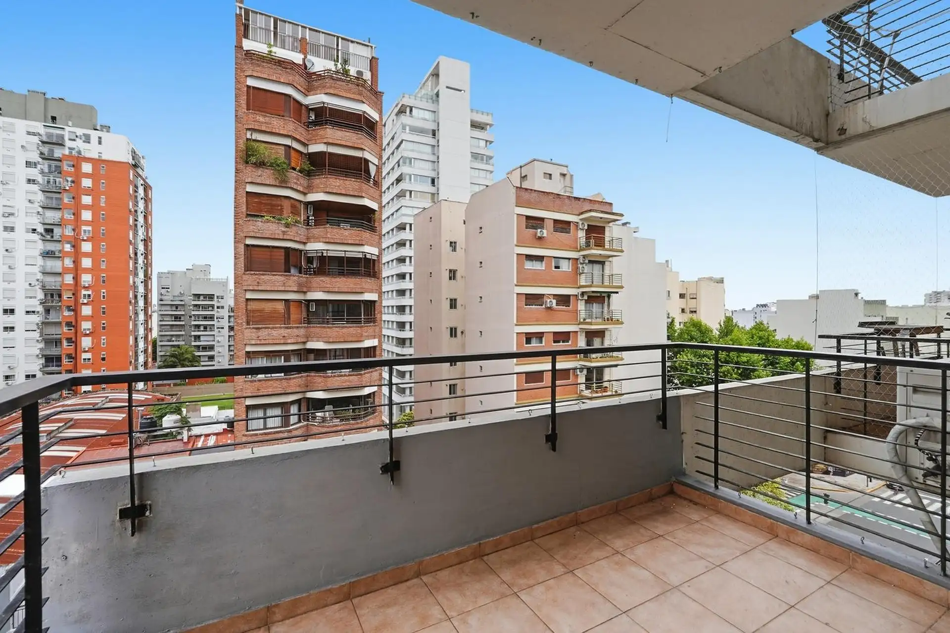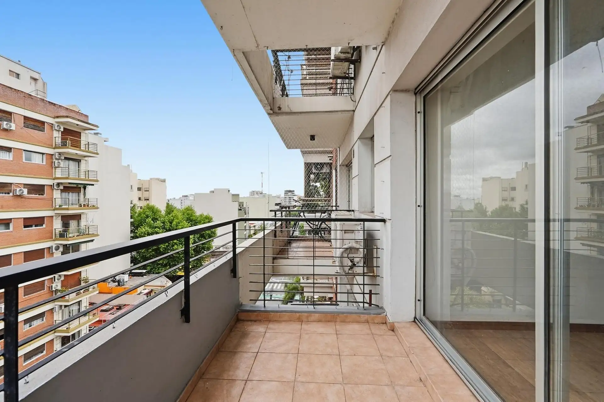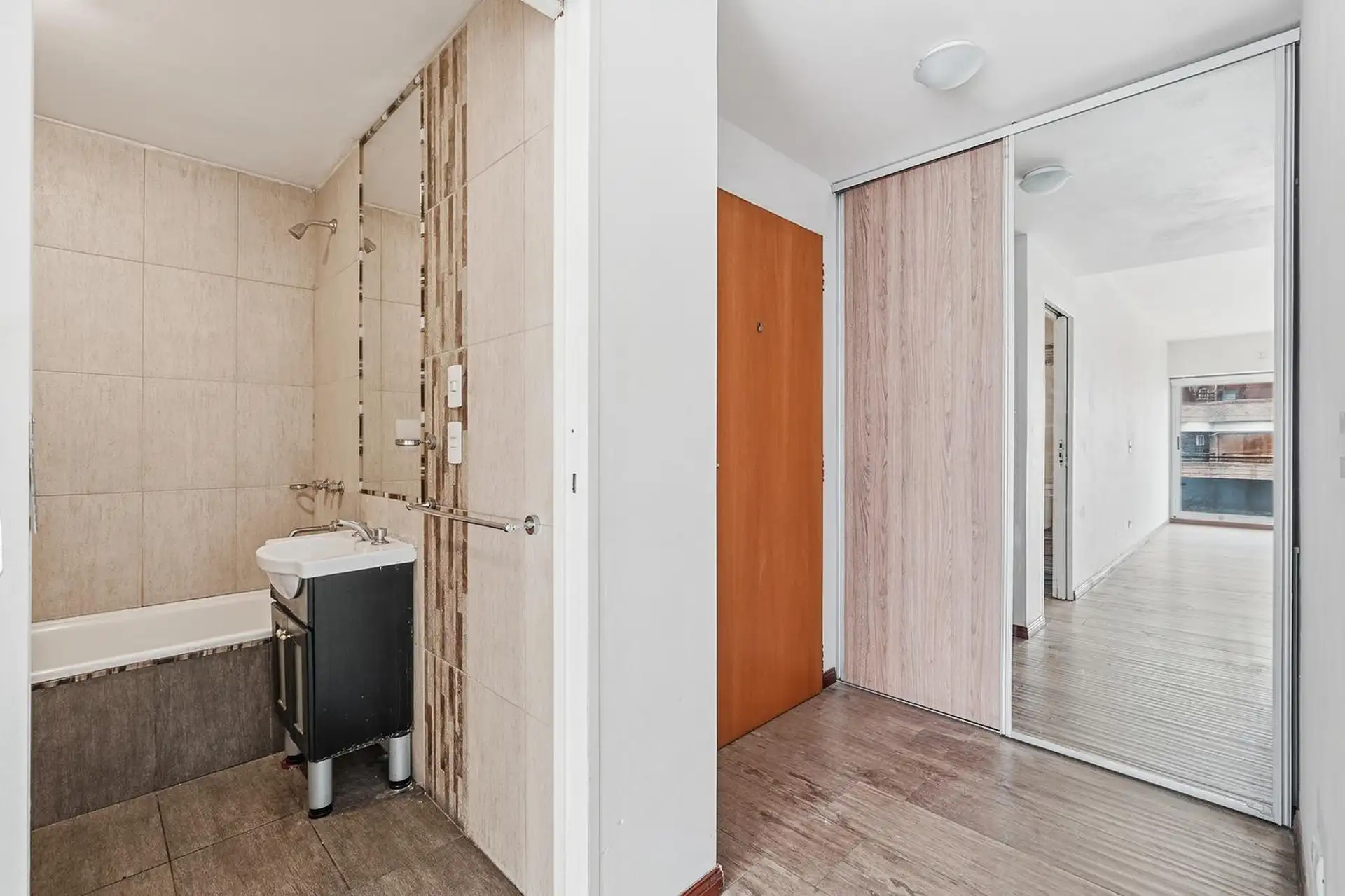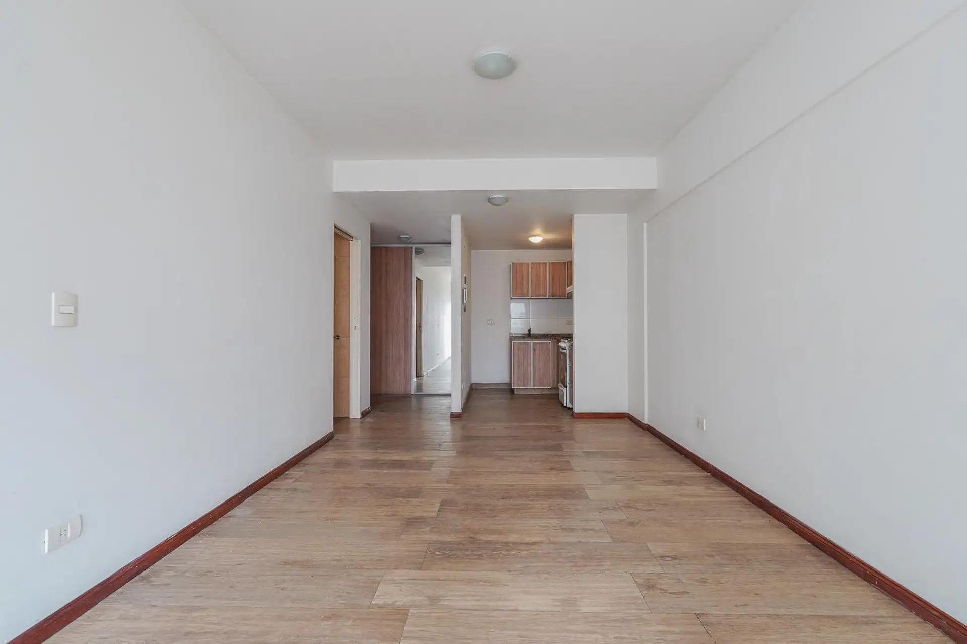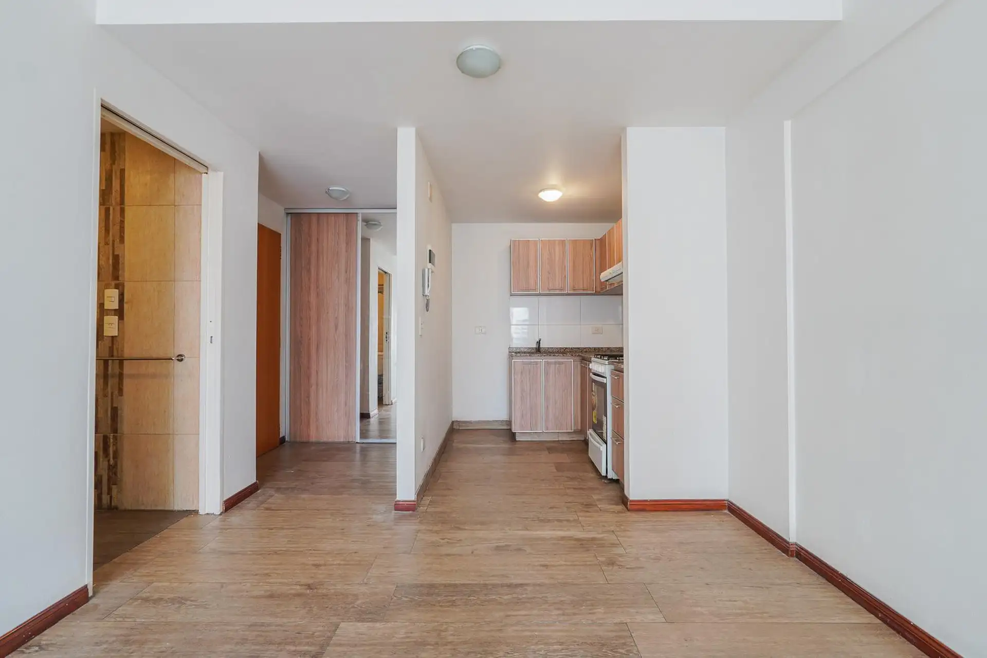 Departamento de 1 ambiente con balcón y vista abierta, al frente, en el 7° piso. Tiene 33 m² cubiertos y 4 m² descubiertos (37 m² según escritura). Cuenta con cocina integrada con muebles bajo mesada y alacena, placard empotrado espejado, aire split frío/calor y conexión para lavarropas; baño completo con bañera y balcón de 3.00x1.55. El edificio tiene 13 pisos, 4 departamentos por piso, 1 ascensor y terraza de uso común; expensas con AYSA incluido.