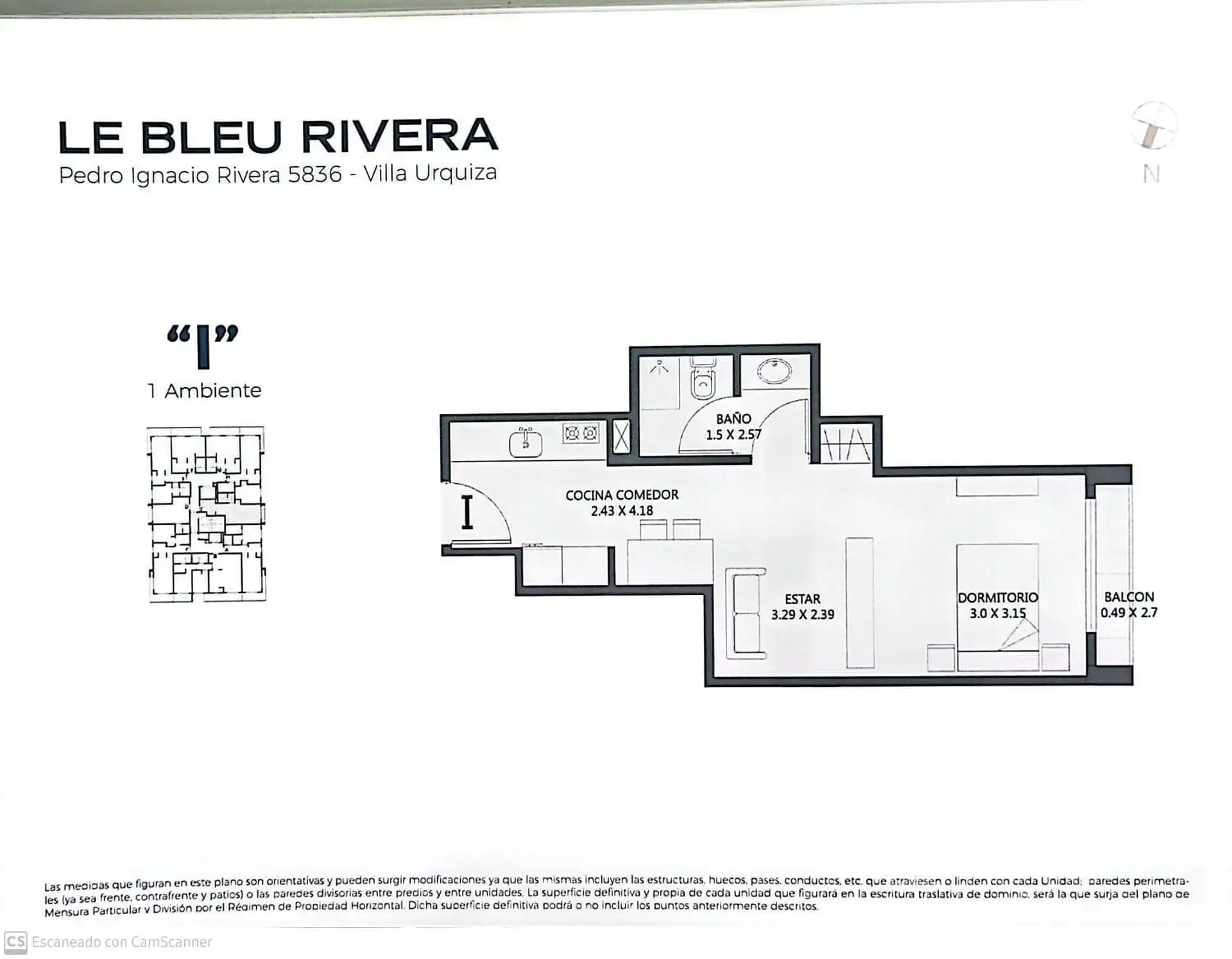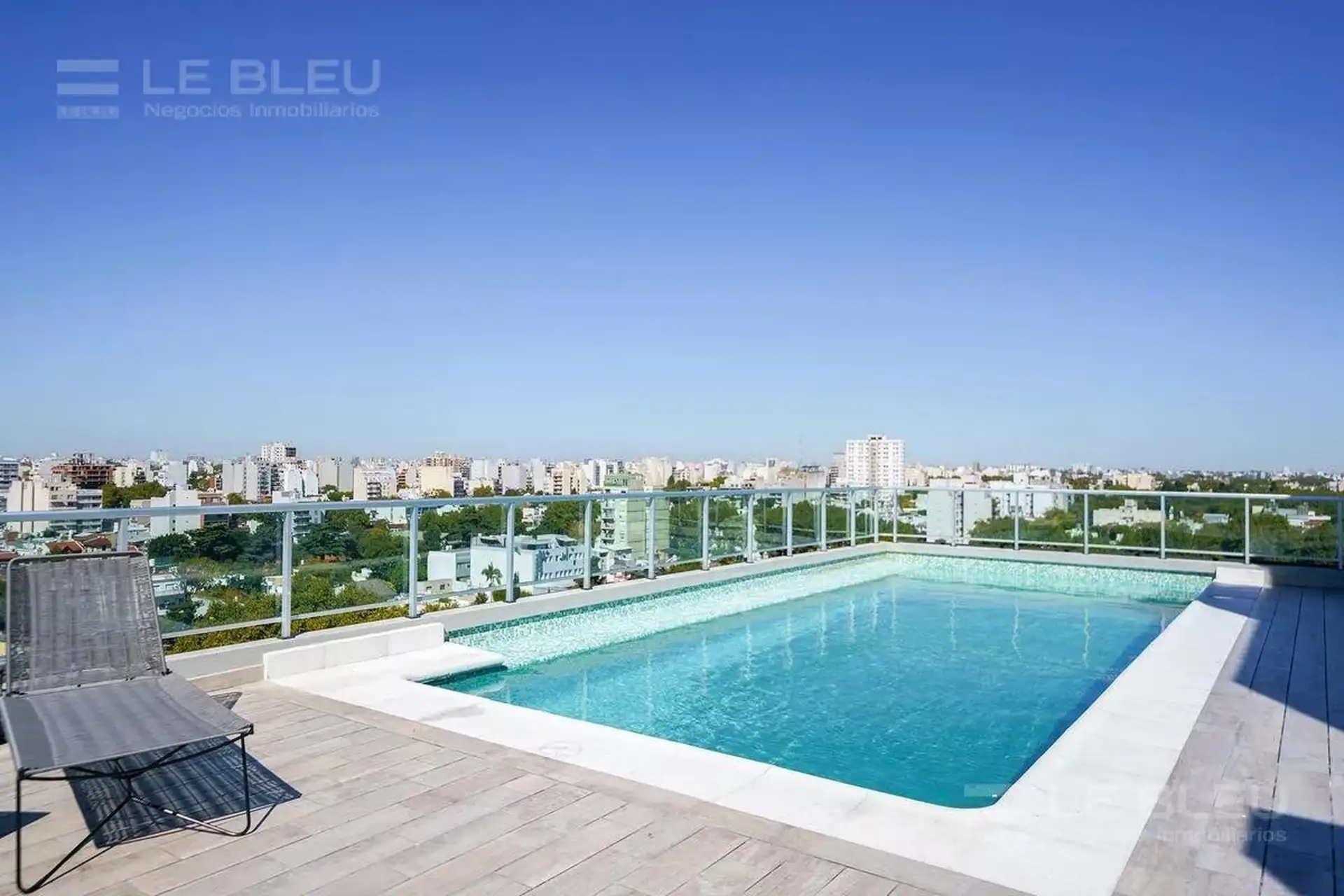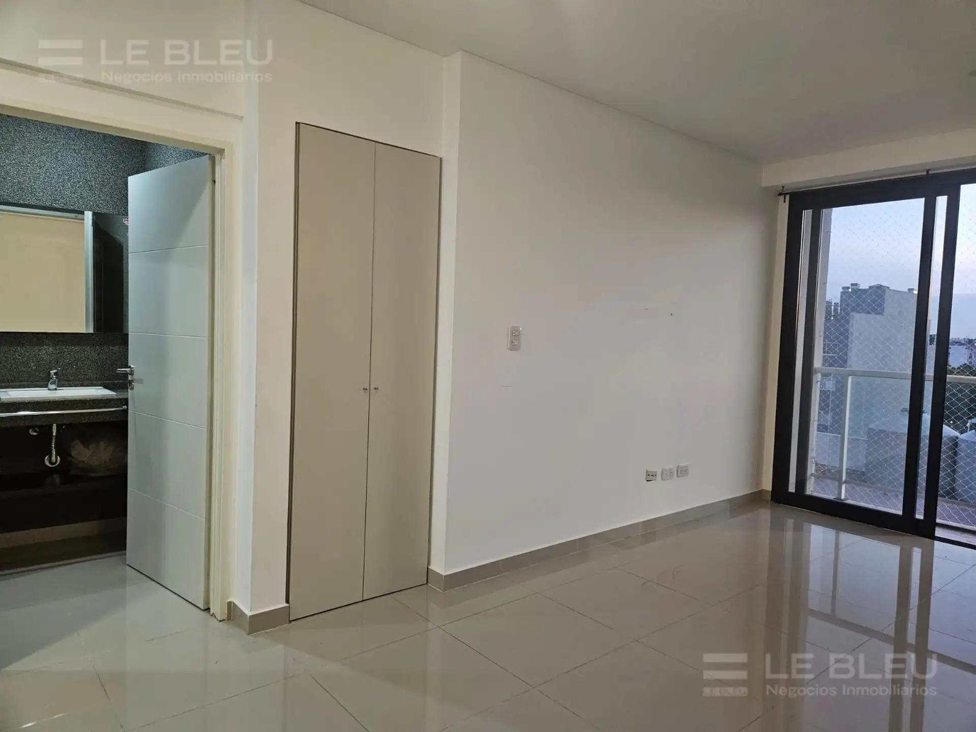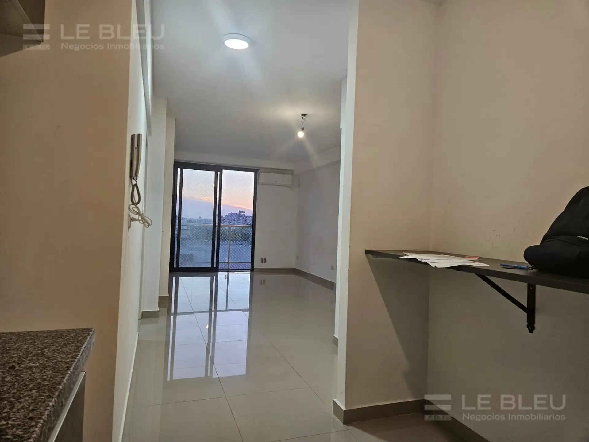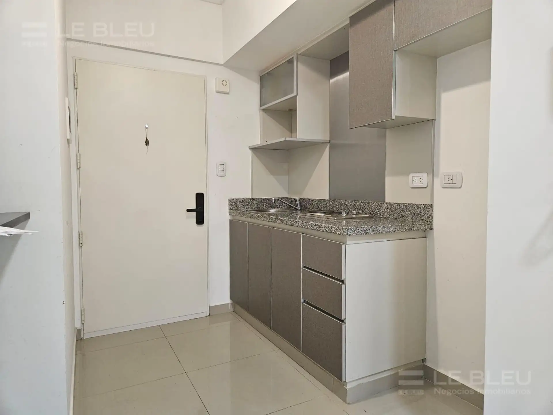 Departamento monoambiente en Torre Rivera Le Bleu, en Villa Urquiza. Incluye cocina equipada con espacio para heladera, alacenas, bajo mesada con cajonera y anafe eléctrico, y baño completo. Cuenta con preinstalación para aire acondicionado frío/calor. El edificio ofrece pileta panorámica, SUM, gimnasio, laundry, solárium con duchas, sector de parrillas, quincho y áreas de reuniones, business room con acceso Wi-Fi y cocheras de cortesía para invitados.