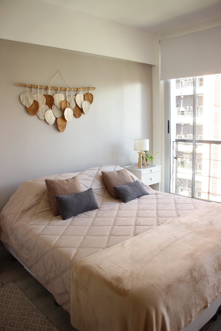 Departamento estudio de boutique en Villa Urquiza, con 1 espacio divisible por un mueble que funciona como placard y sector de guardado. Incluye cama Queen o Twin (con cuna opcional sin cargo), balcón con vista a jardines, cocina equipada y sector de comedor o trabajo. Baño completo con bañera. En la terraza funciona un espacio de lavandería con lavarropas y secarropas con fichas a costo adicional.