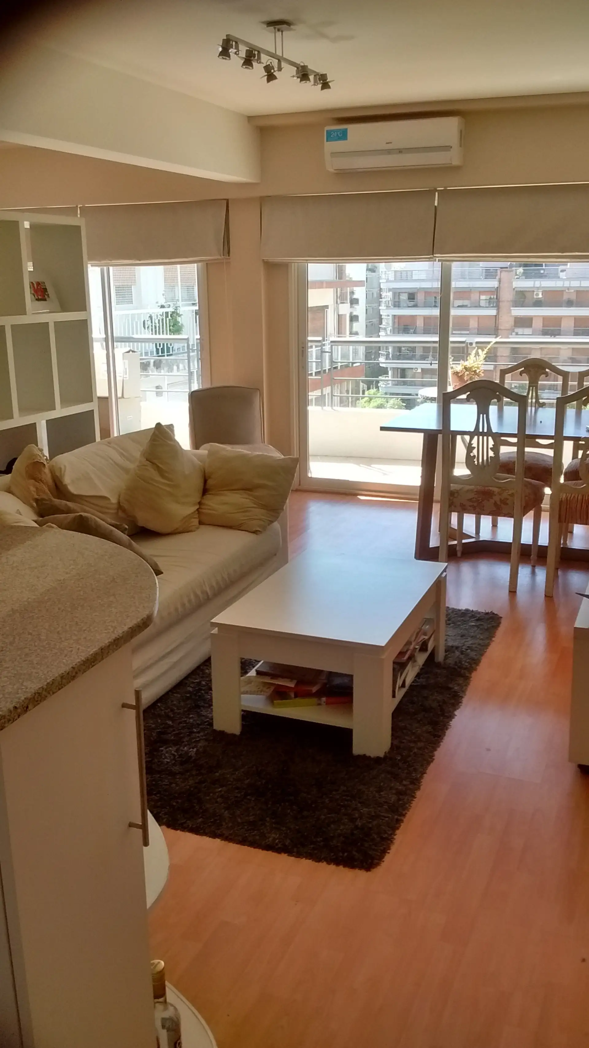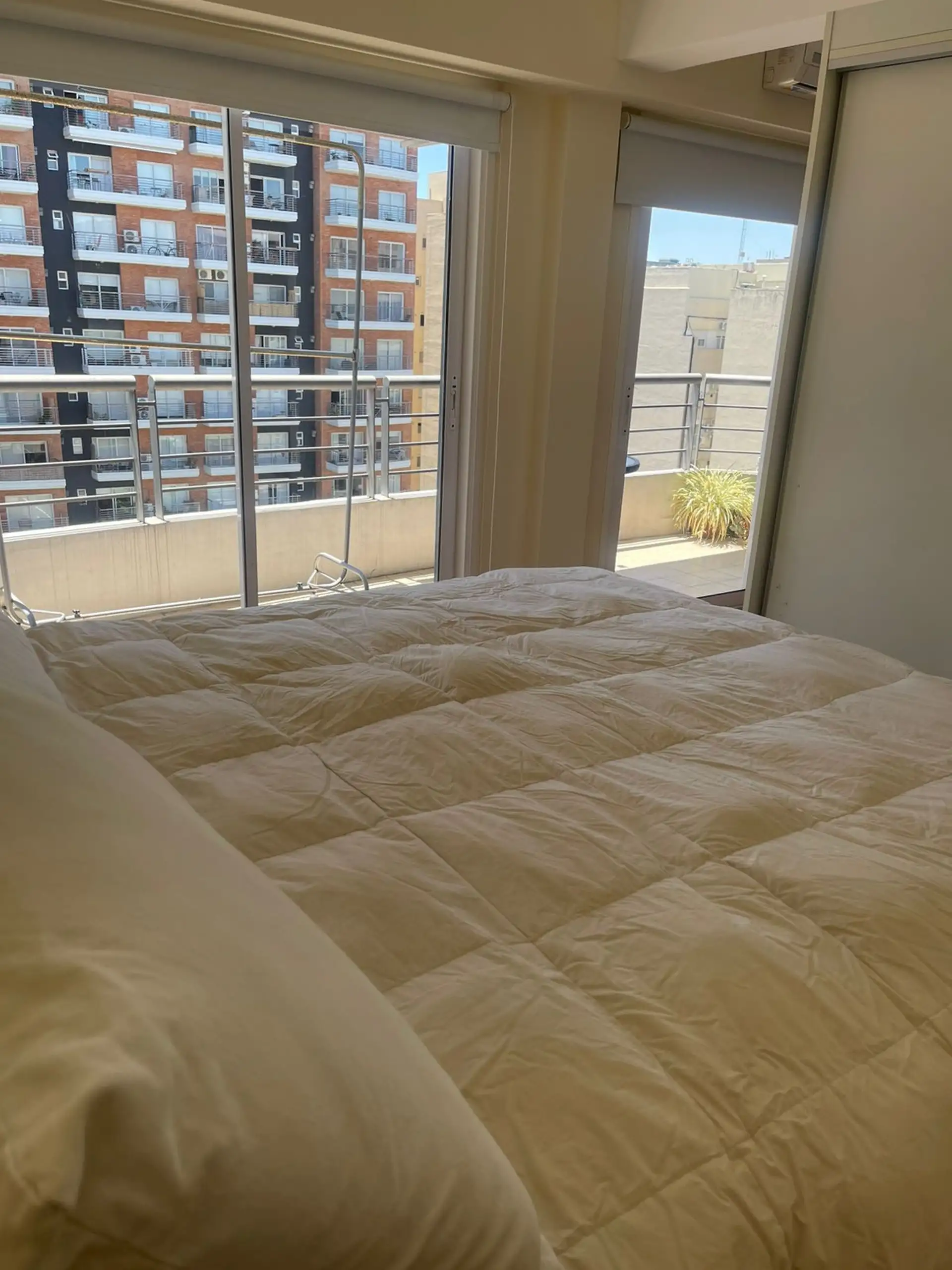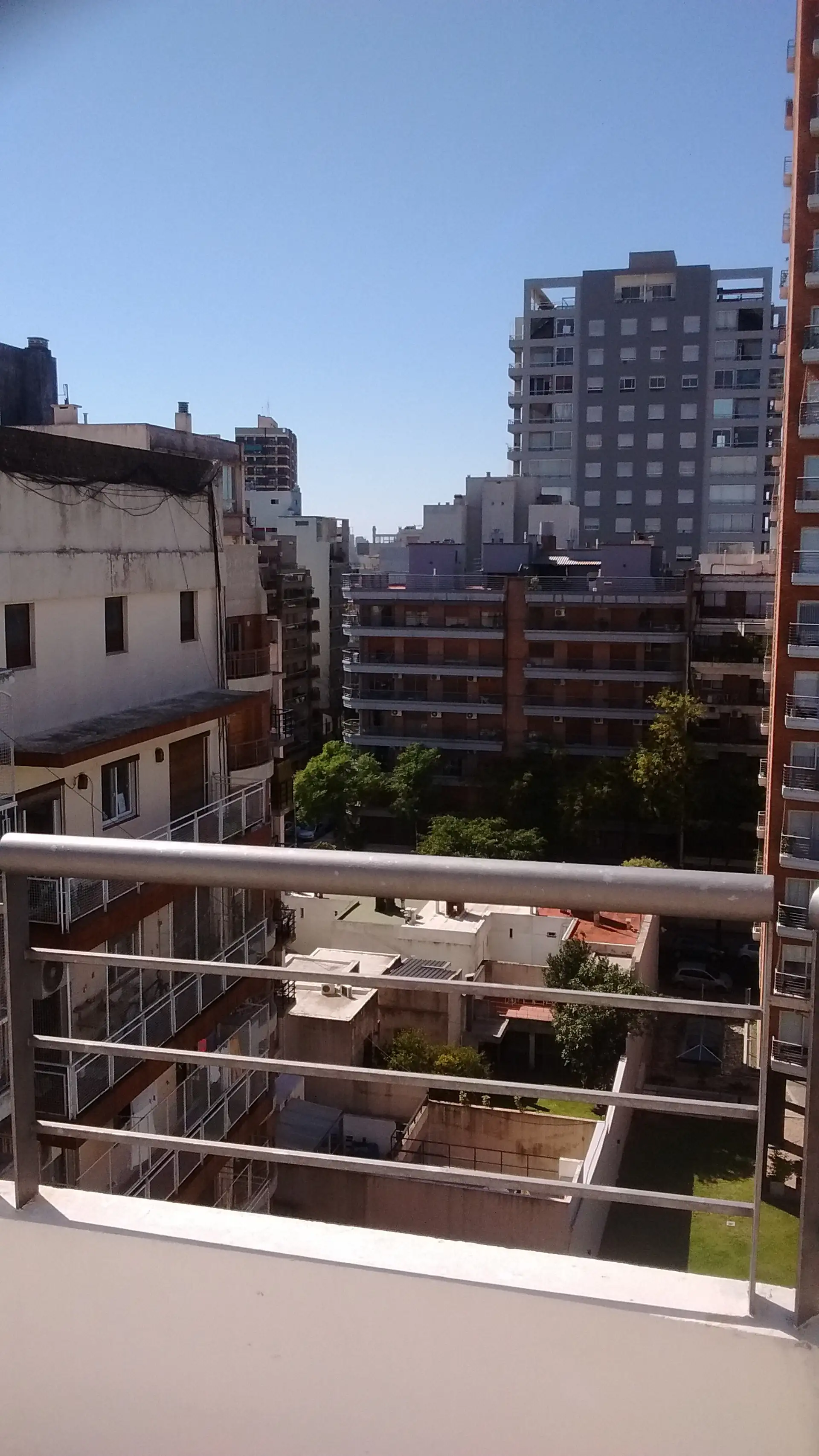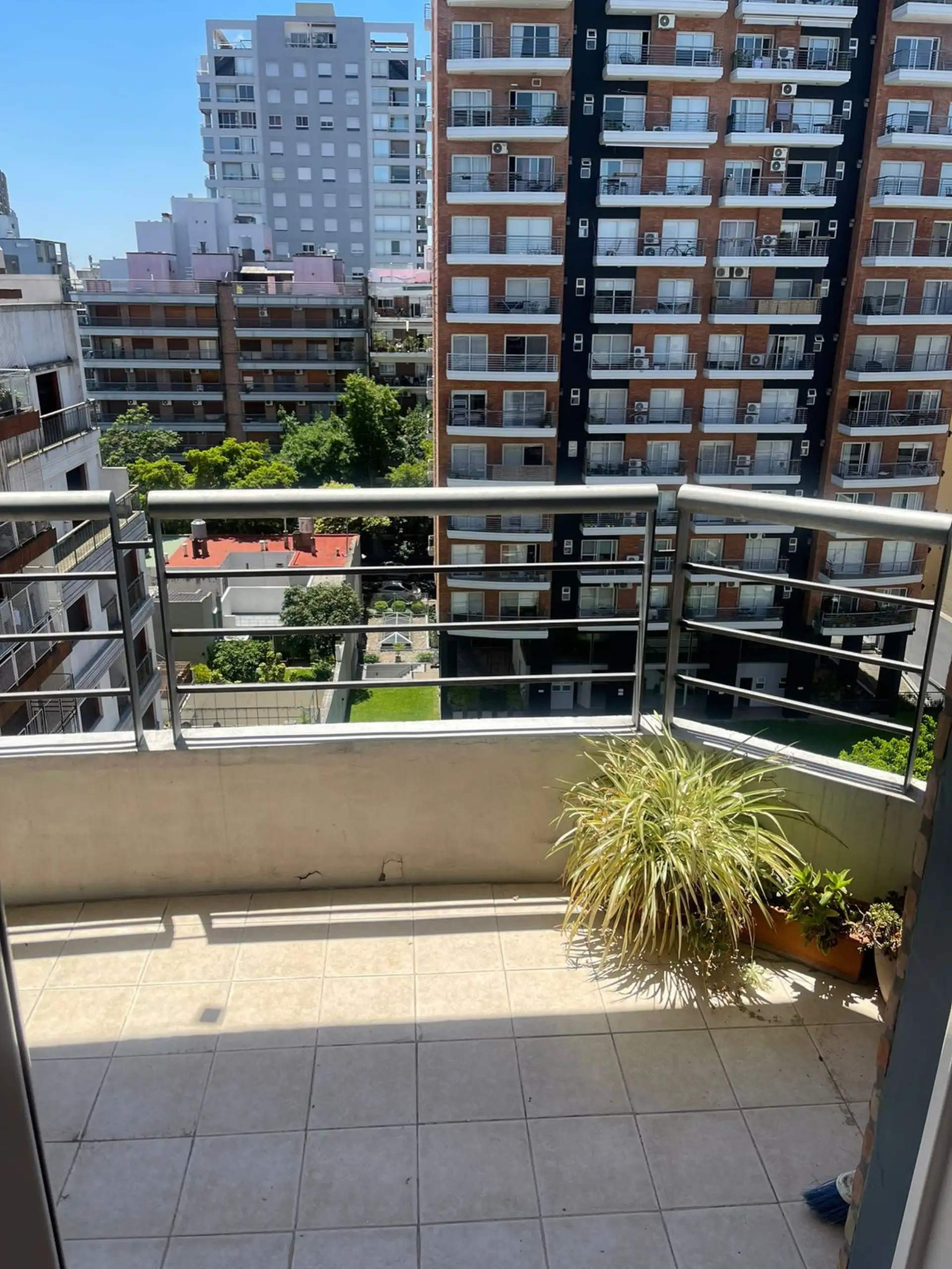 Departamento de 2 ambientes al contrafrente, con balcón. Se ubica en planta 8°, con 50 m² aprox.; en planta 9° cuenta con terraza propia de 48 m² aprox. Total 98 m². Está amoblado y equipado: cocina semi integrada con ventana al exterior, lavarropas, heladera con frezer, artefacto de cocina eléctrico y utensillos; living comedor con salida al balcón y dormitorio con placar y ventanal al balcón, con ingreso por escalera interna desde el living. El edificio dispone de encargada, laundry y gimnasio