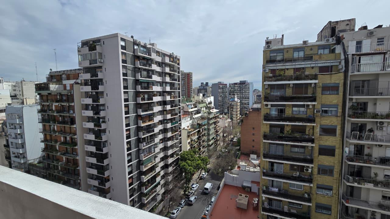 Departamento de 3 ambientes con balcón en Almagro, piso 12, con vista abierta. Cuenta con hall de entrada con placard, comedor integrado, 2 dormitorios (uno con vestidor y otro con placard), y 1 baño completo. Cocina equipada con muebles bajo mesada y en altura, lavadero incorporado y agua caliente central. Incluye 2 aires acondicionados y un ventilador de techo. El contrato es por 2 años con ajuste cuatrimestral según IPC. Rivadavia al 4300.