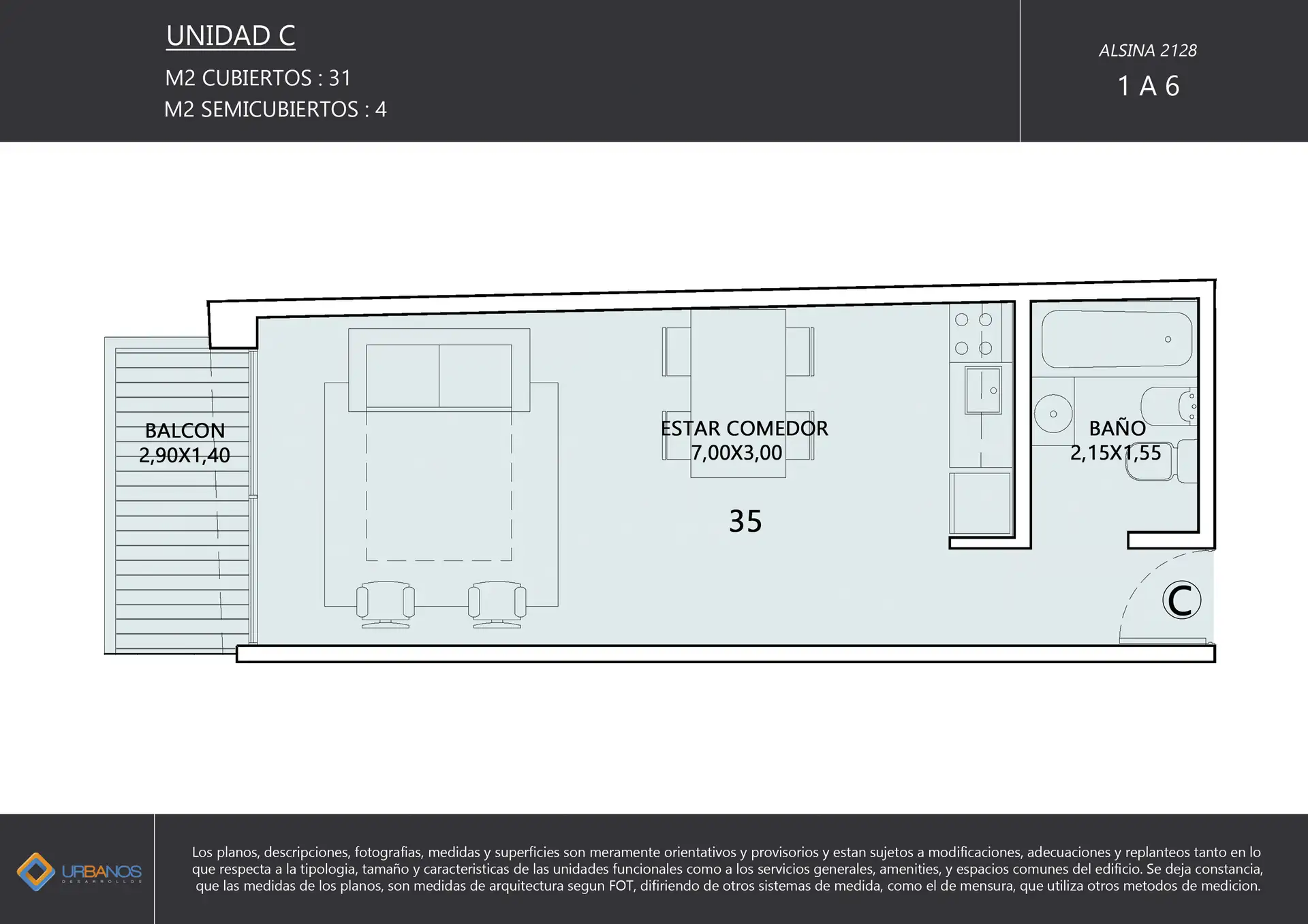 Departamento a estrenar en alquiler, ubicado en el 6to piso al frente. Tiene 35 m² totales y 31 m² cubiertos, con living comedor con cocina integrada, 1 baño completo y balcón. Cuenta con aire acondicionado frio/calor y agua caliente central. Incluye anafe vitrocerámico de 2 hornallas, lavarropas en el edificio, y amenities: laundry, parrilla, pileta, quincho, solarium y SUM, además de ascensor y encargado con ayudante. Las expensas se estiman en $130.000 y se informa que incluyen ABL, luz, agua