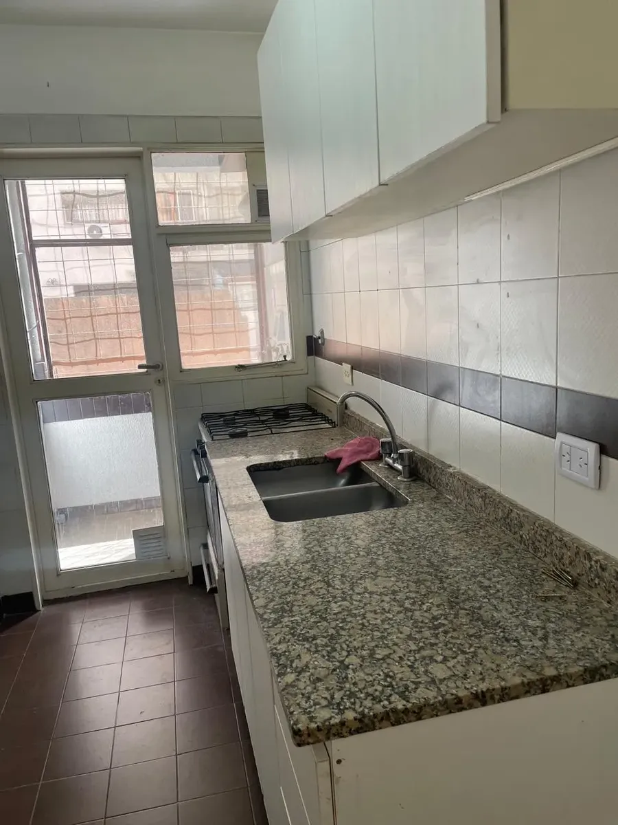 Departamento de 2 ambientes en primer piso, contra frente. Cuenta con balcón, baño completo y cocina con muebles, además de lavadero independiente. El edificio tiene seguridad 24 hs y se acepta mascota.