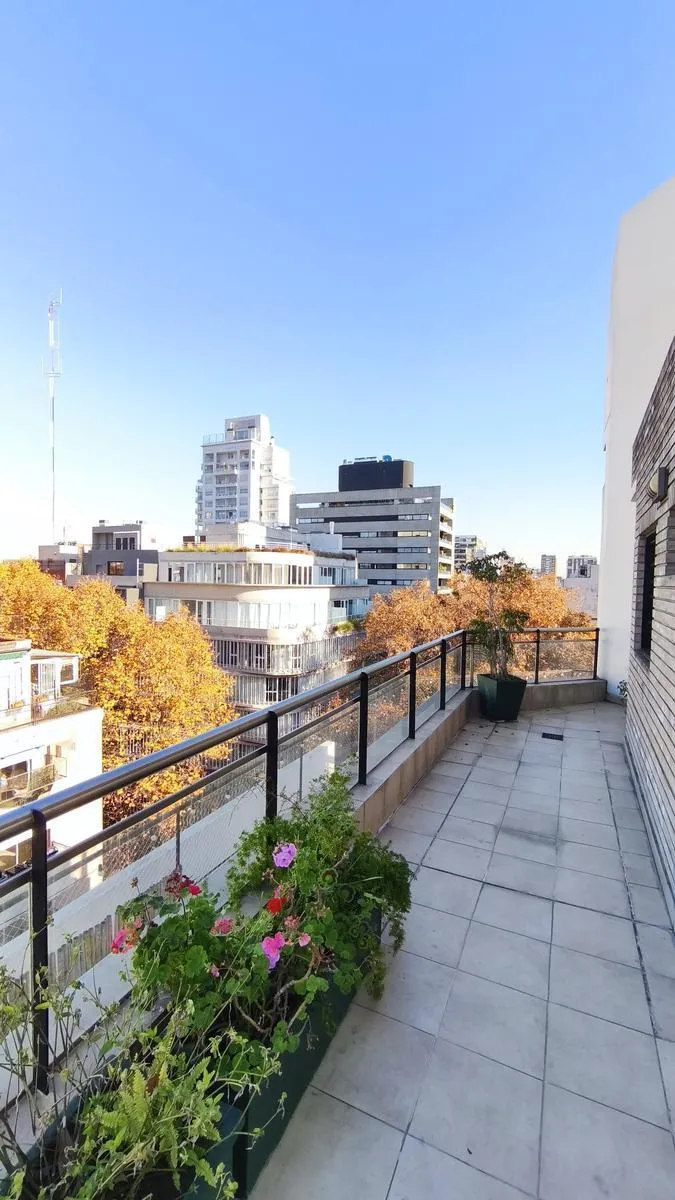 Departamento de 3 ambientes en Belgrano, en esquina, con palier privado y amenities. Cuenta con living comedor con salida a balcón aterrazado y corrido, hall íntimo, 2 dormitorios (suite con vestidor) y 2 baños completos, además de cocina office con lavadero y campana extractora. Tiene aire acondicionado en todos los ambientes y calefacción y agua por caldera individual; pisos de madera entablonada en la recepción y porcelanato en cocina y dormitorios, con persianas. El edificio Blue Point cuent