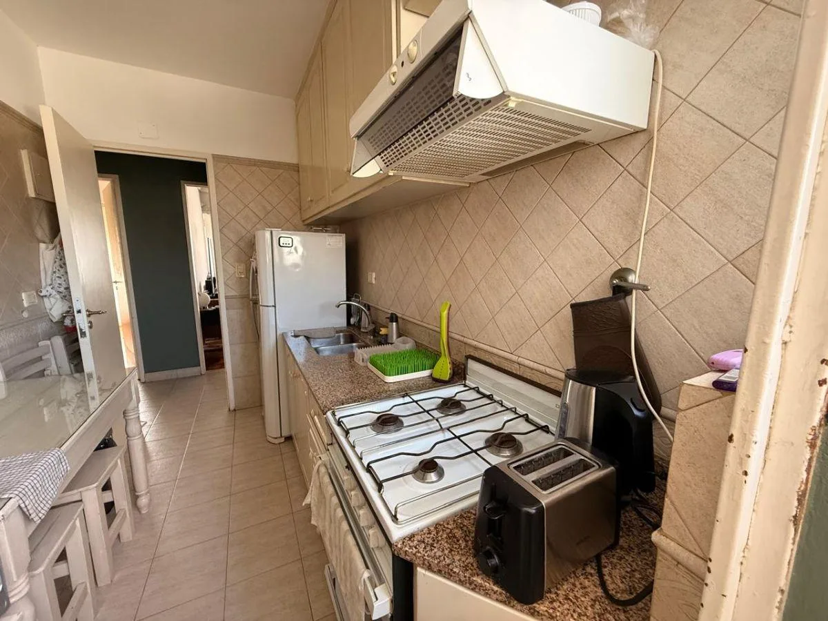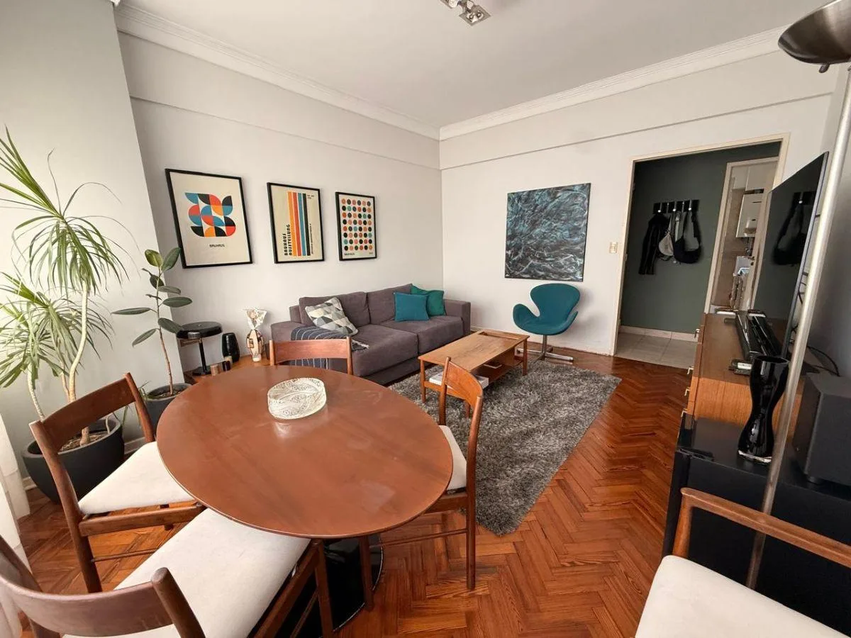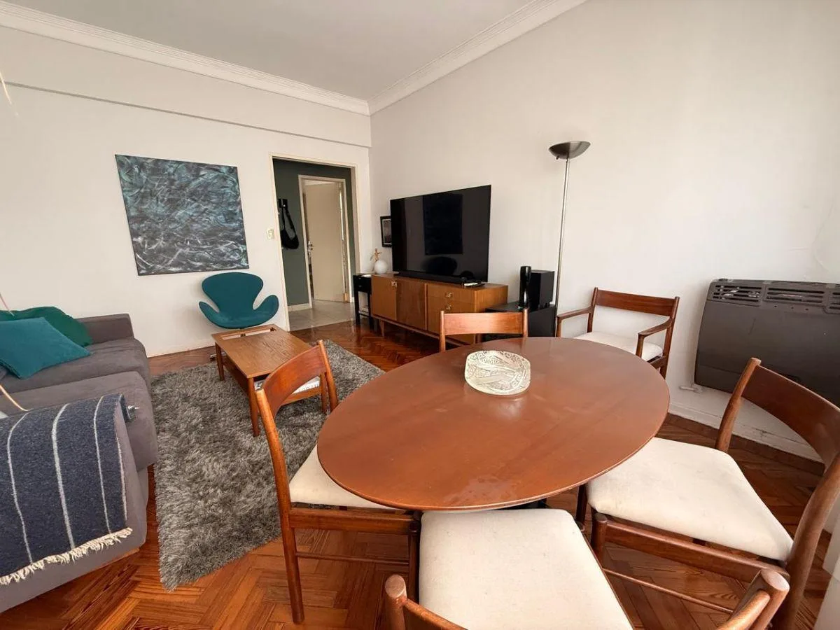 Departamento de 3 ambientes amoblado y equipado de 80 m², en el 5° piso al frente. Cuenta con living comedor con ventanal, 2 dormitorios con placares (uno con salida al balcón) y baño completo. Tiene cocina independiente y lavadero separado, con calefacción por estufa de tiro balanceado y aire acondicionado frío/calor en el living comedor. El precio es paquete e incluye luz y gas con tope de 50.000, más expensas no especificadas.