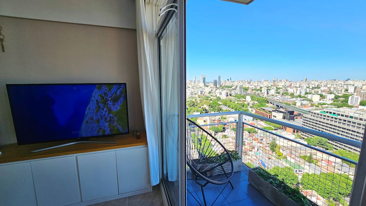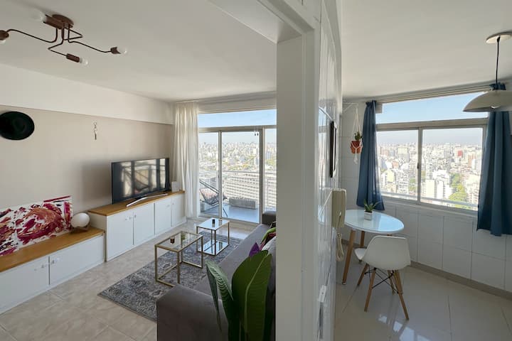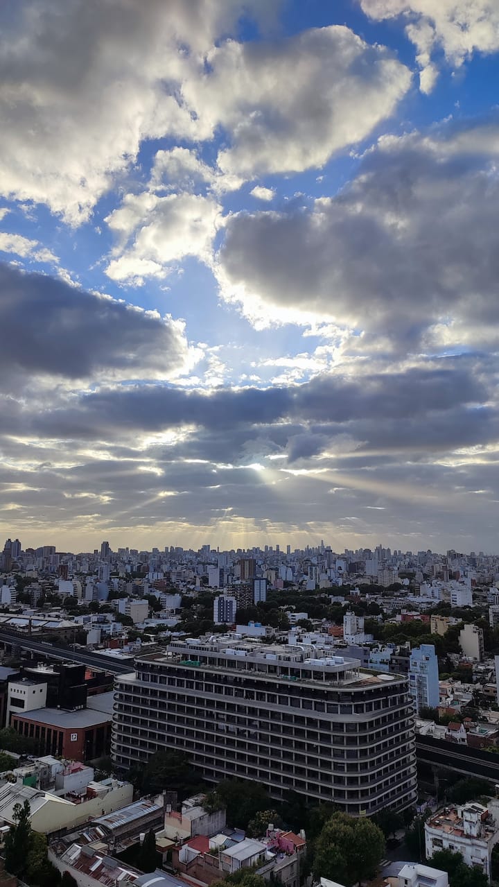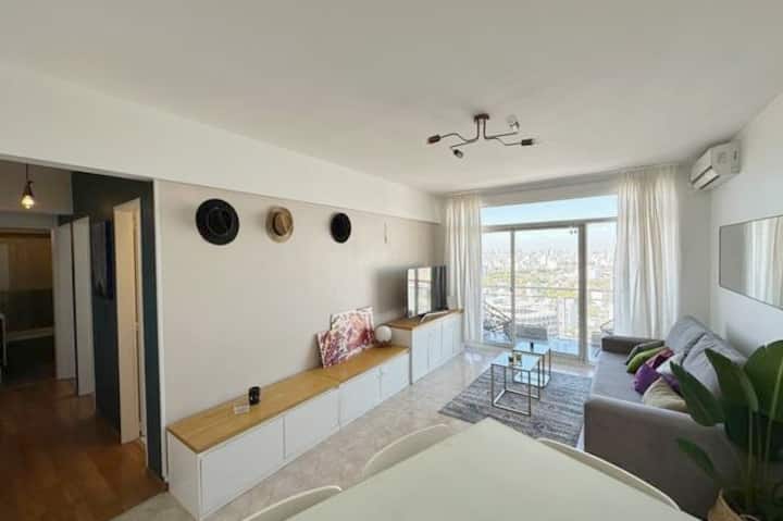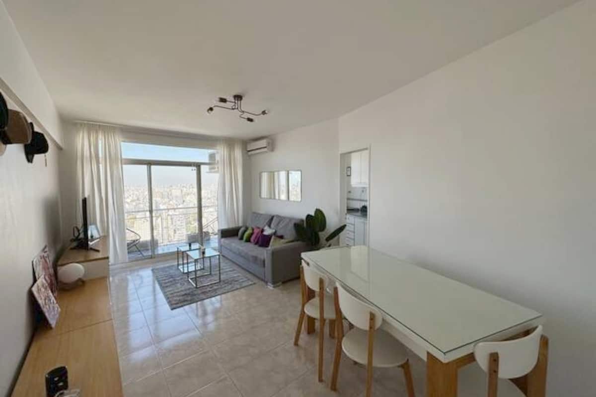 Departamento en Chacarita, en un piso 26, con vista abierta de la ciudad. Cuenta con 2 dormitorios, con orientación indicada como panorámica en todos los ambientes, y ubicacion sobre Av. Dorrego. El edificio tiene seguridad 24 horas y amenities, con acceso a jardín con pileta. Está a metros de Movistar Arena.