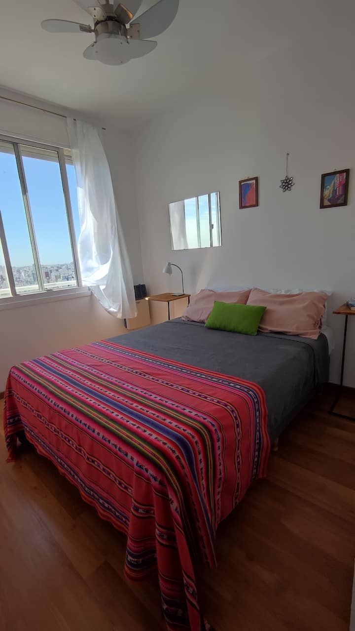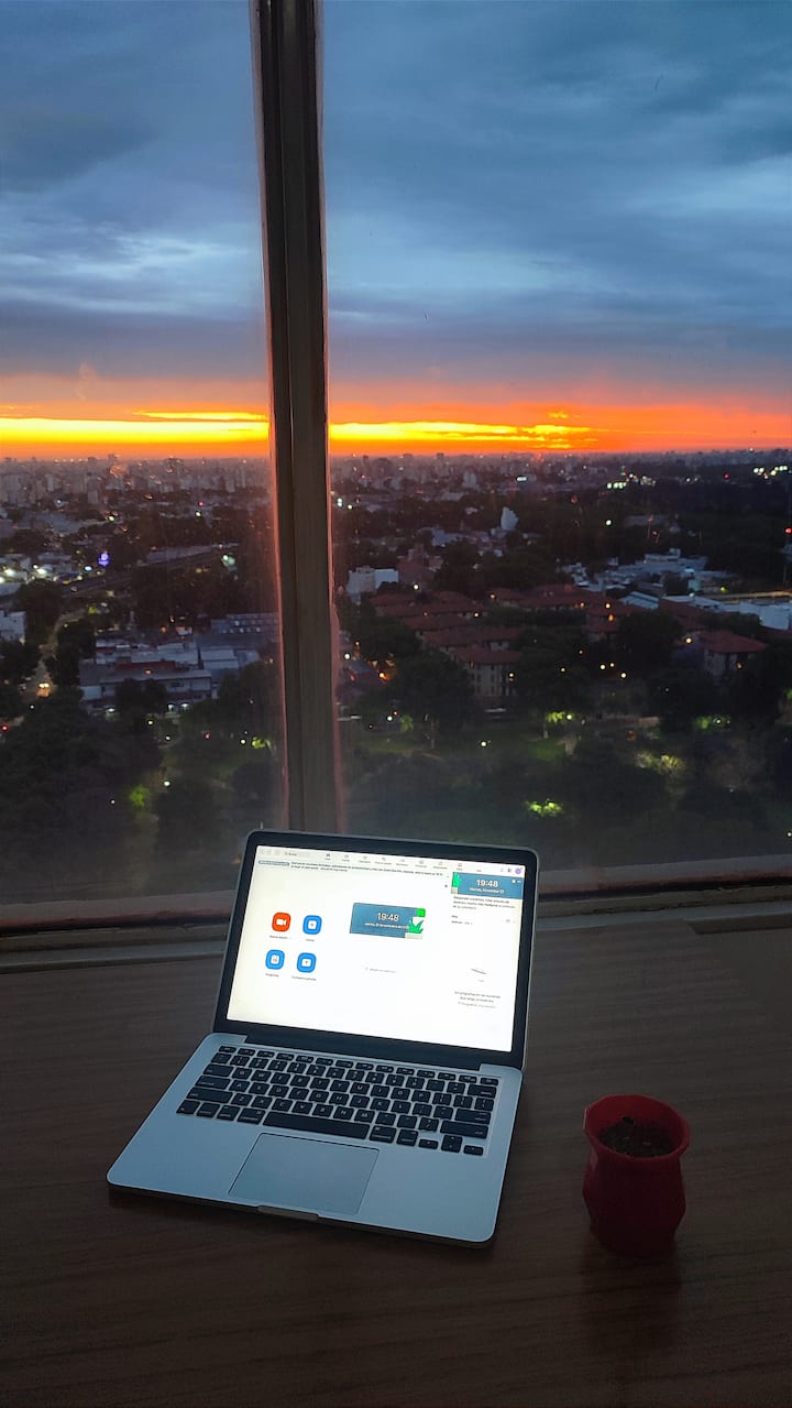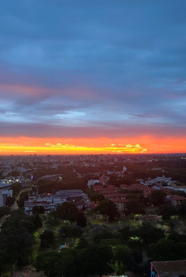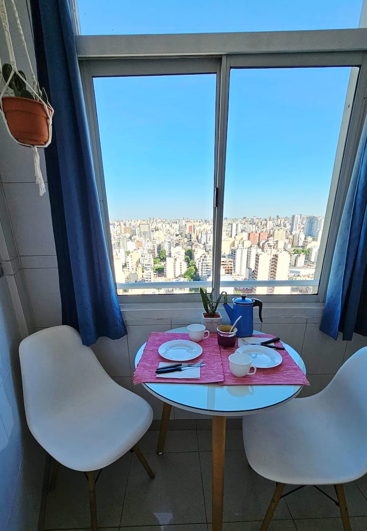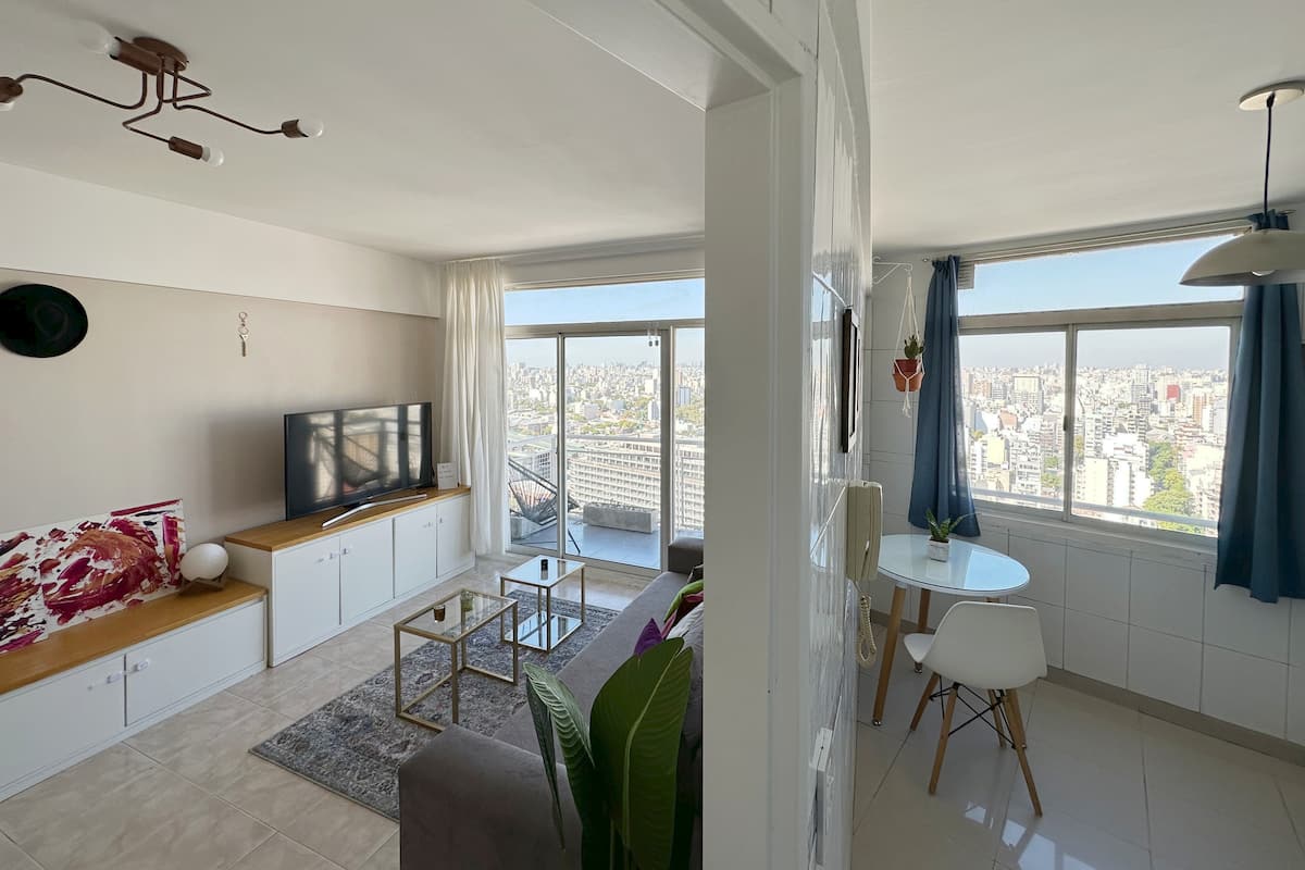 Departamento en Chacarita, en un piso 26, con vista abierta de la ciudad. Cuenta con 2 dormitorios, con orientación indicada como panorámica en todos los ambientes, y ubicacion sobre Av. Dorrego. El edificio tiene seguridad 24 horas y amenities, con acceso a jardín con pileta. Está a metros de Movistar Arena.