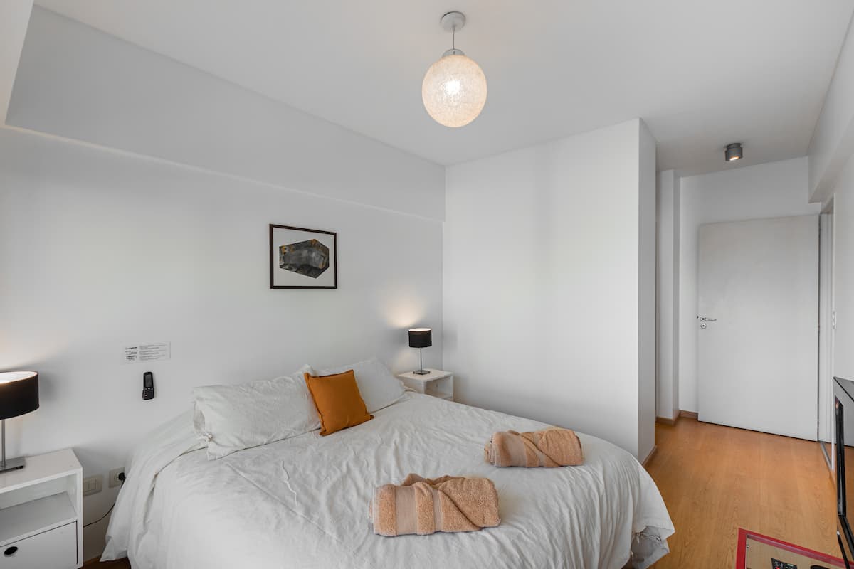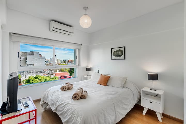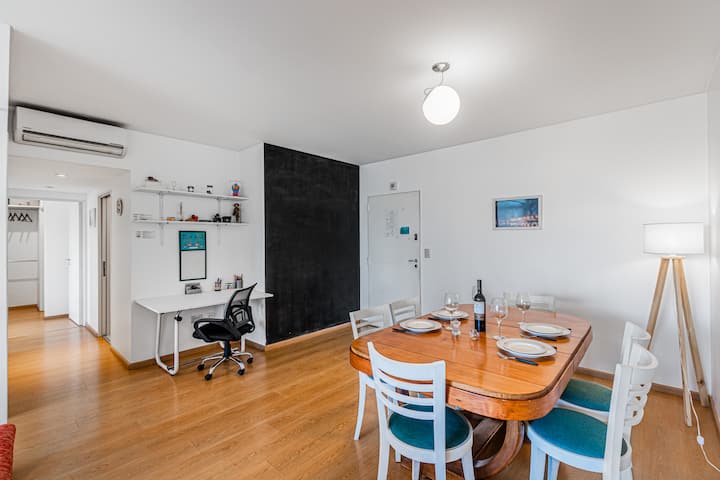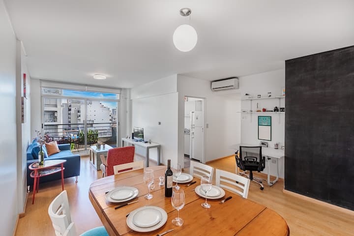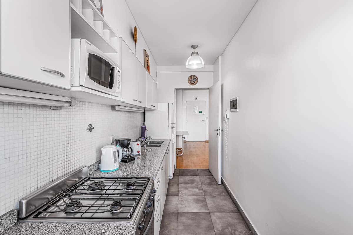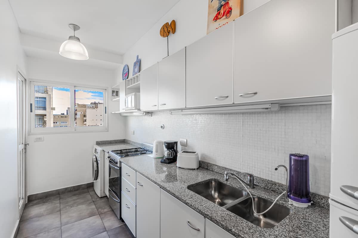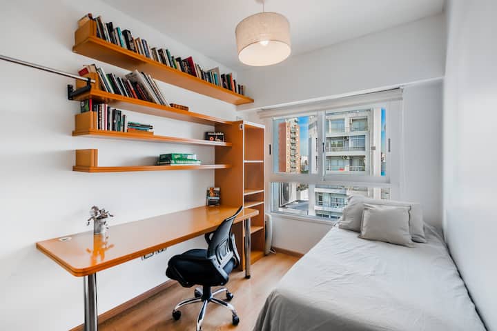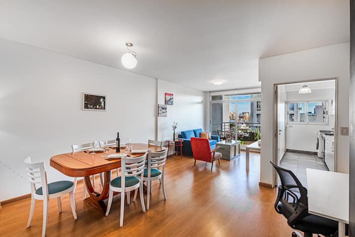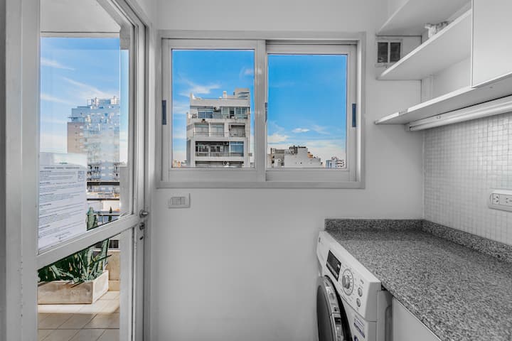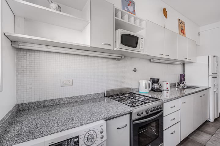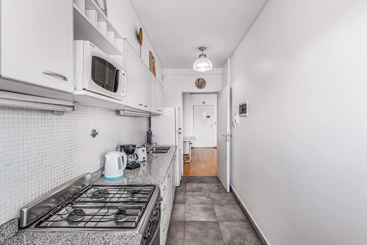 Departamento amoblado de 3 ambientes, con 2 dormitorios, en el 6° piso al frente. Tiene balcón y brinda aire acondicionado frío/calor en el living y equipos en los dormitorios. El dormitorio principal es en suite e incluye cama queen y aire acondicionado; el 2° dormitorio tiene cama single, escritorio y ventilador. La cocina está equipada con heladera con freezer, cocina a gas y horno, microondas, cafetera eléctrica, pava eléctrica y tostadora. Incluye lavarropas, TV inteligente con Netflix (sin