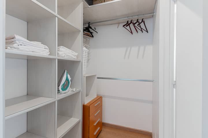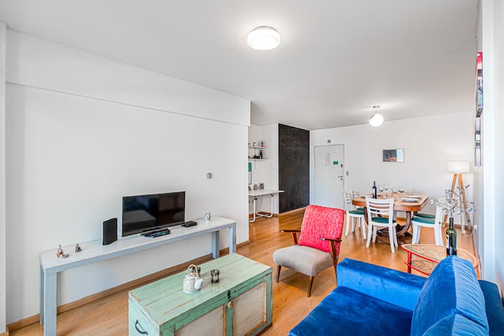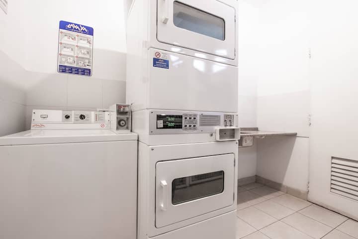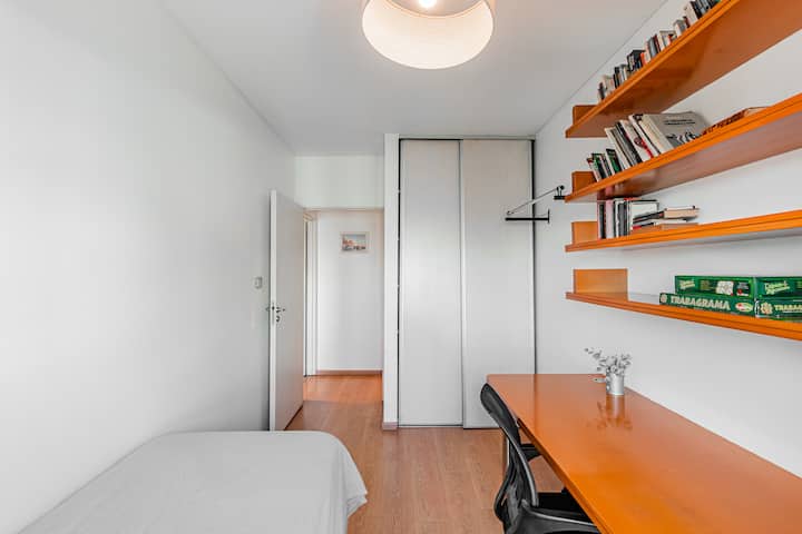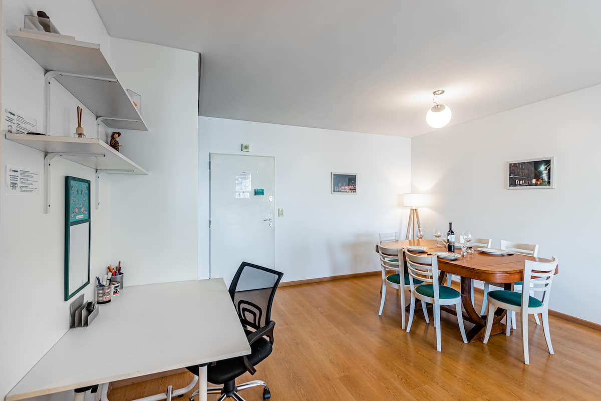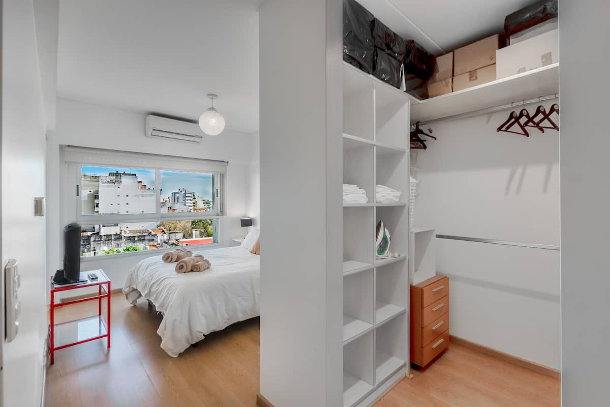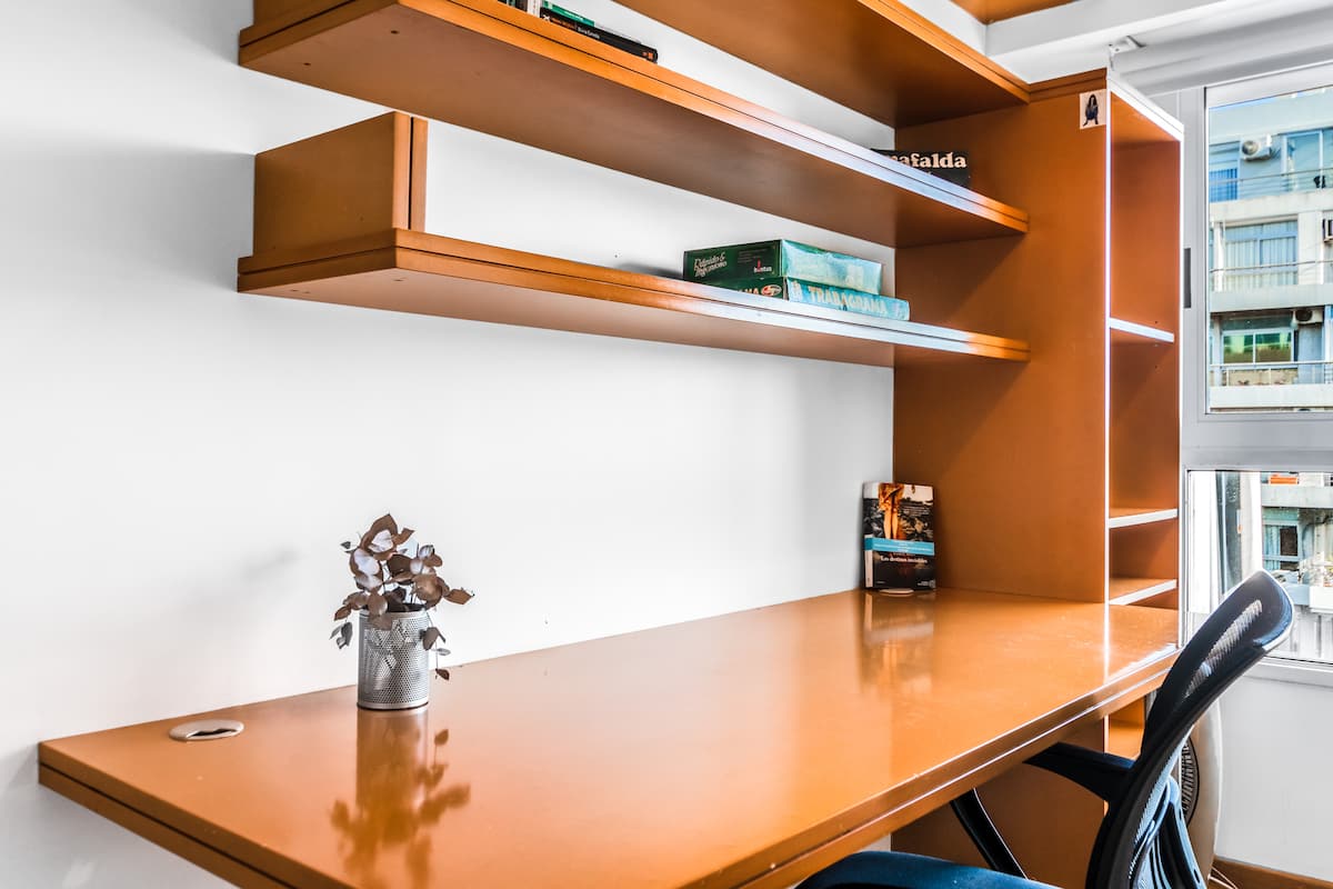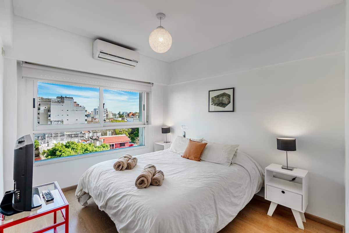 Departamento amoblado de 3 ambientes, con 2 dormitorios, en el 6° piso al frente. Tiene balcón y brinda aire acondicionado frío/calor en el living y equipos en los dormitorios. El dormitorio principal es en suite e incluye cama queen y aire acondicionado; el 2° dormitorio tiene cama single, escritorio y ventilador. La cocina está equipada con heladera con freezer, cocina a gas y horno, microondas, cafetera eléctrica, pava eléctrica y tostadora. Incluye lavarropas, TV inteligente con Netflix (sin