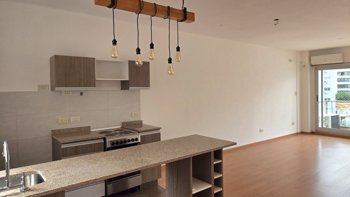 Departamento monoambiente divisible de 44 m² totales en el 5to piso, con balcón y orientación este/oeste. Cocina integrada con isla, anafe y horno eléctrico, con espacio para lavarropas. Cuenta con baño completo con bañera, placard, cortinas blackout, ventilación cruzada y aire acondicionado frío/calor. El edificio tiene terraza con parrilla, pileta y SUM. Contrato por 2 años: 1 mes de anticipo, 1 mes de depósito, ajuste por IPC trimestral.