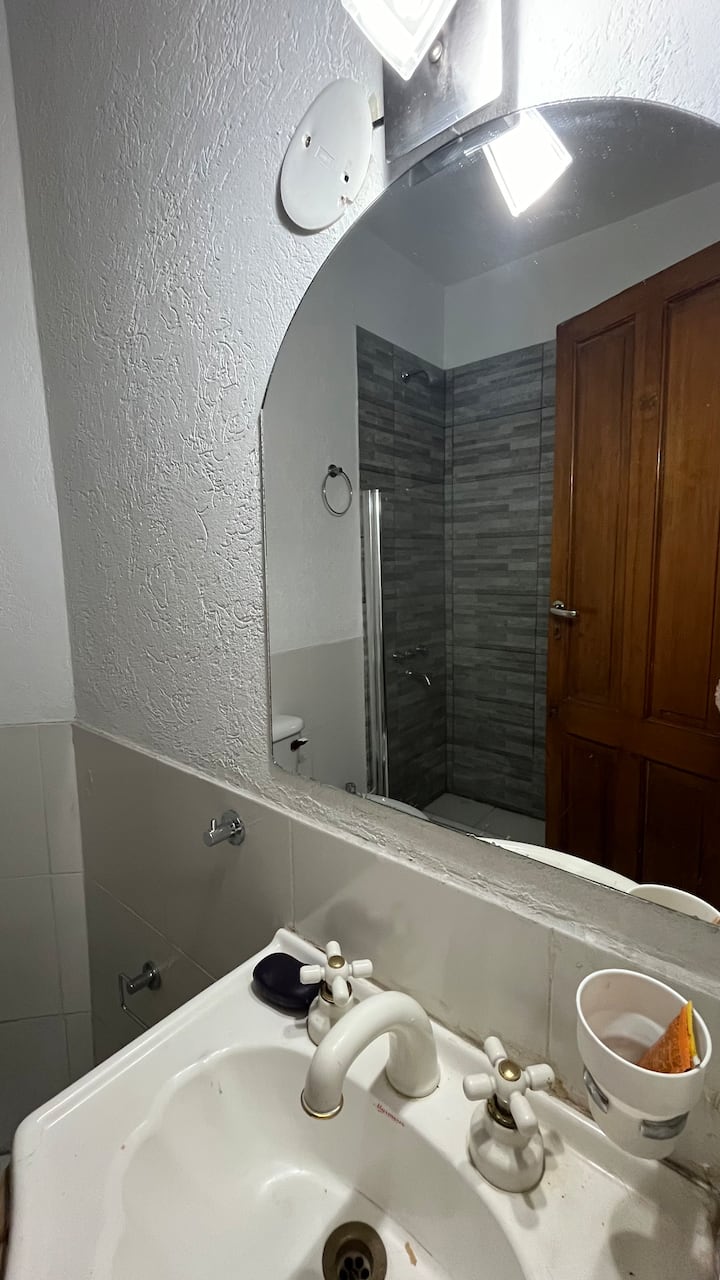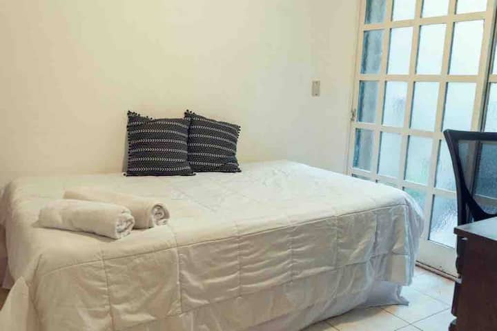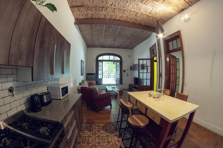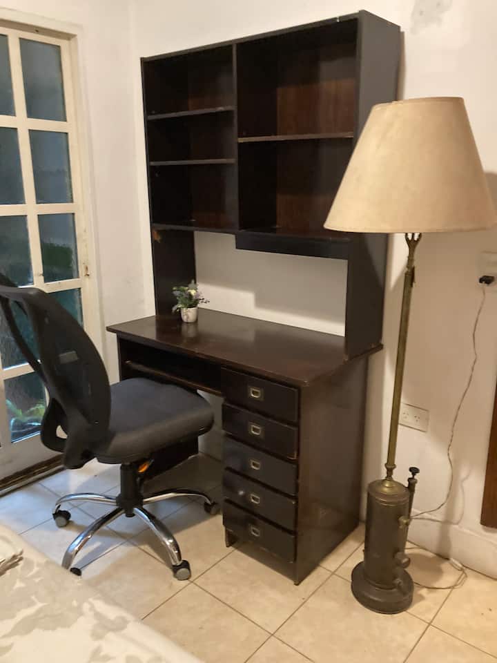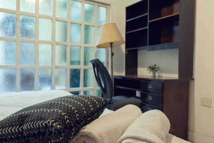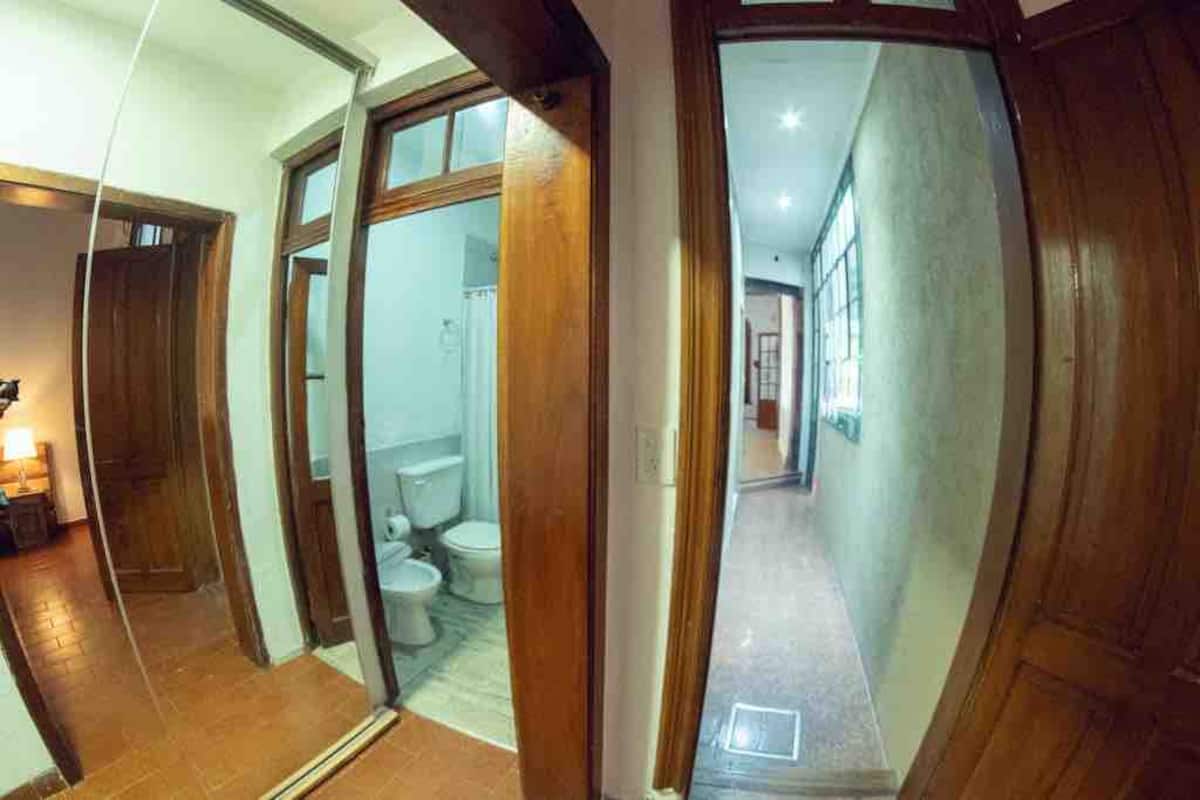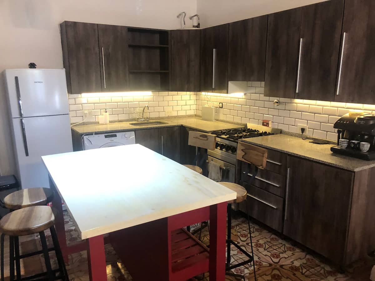 Two-bedroom apartment in Chacarita. One bedroom has a double bed, an en-suite bathroom and air conditioning. The second bedroom includes a desk and chair, with towels provided. There is a second full bathroom and a combined living and dining area integrated with the kitchen, overlooking an interior window for natural light, plus an inner courtyard with plants. The unit also has access via a large terrace with a grill on the first floor, in an upstairs property. Construction is underway on the bl