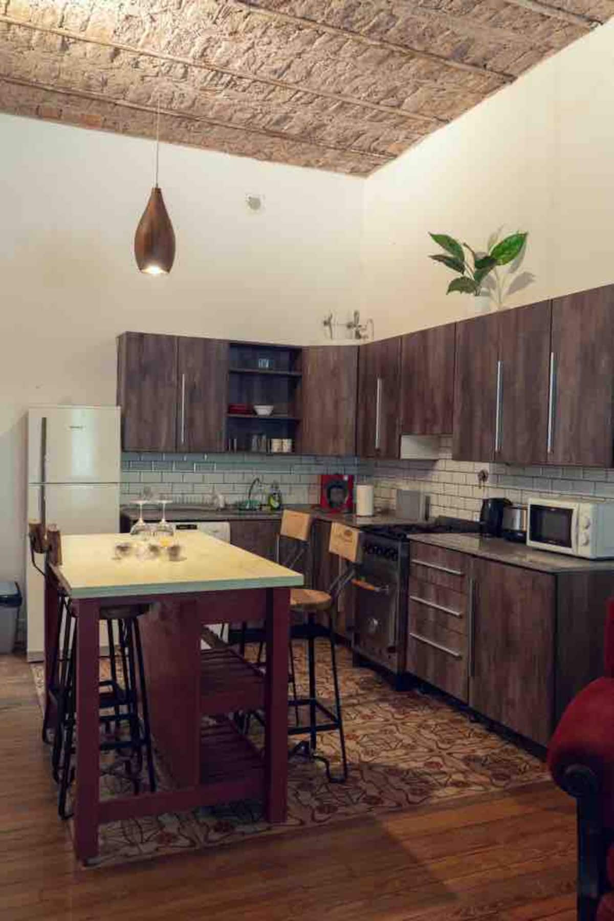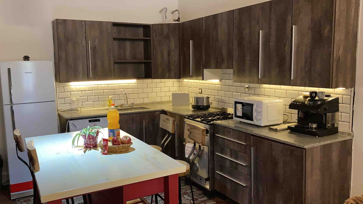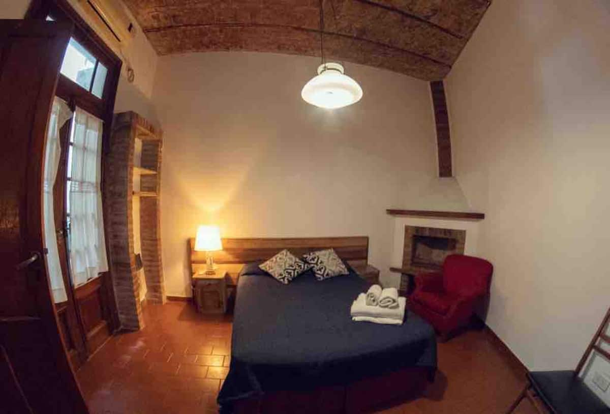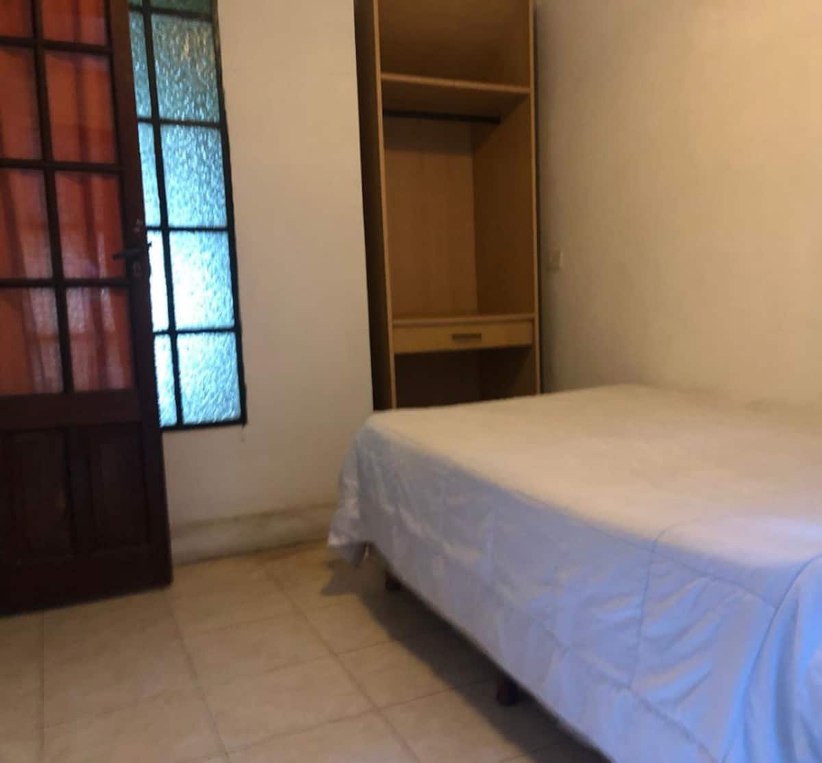 Two-bedroom apartment in Chacarita. One bedroom has a double bed, an en-suite bathroom and air conditioning. The second bedroom includes a desk and chair, with towels provided. There is a second full bathroom and a combined living and dining area integrated with the kitchen, overlooking an interior window for natural light, plus an inner courtyard with plants. The unit also has access via a large terrace with a grill on the first floor, in an upstairs property. Construction is underway on the bl