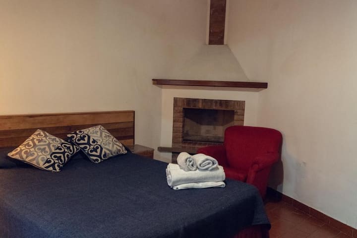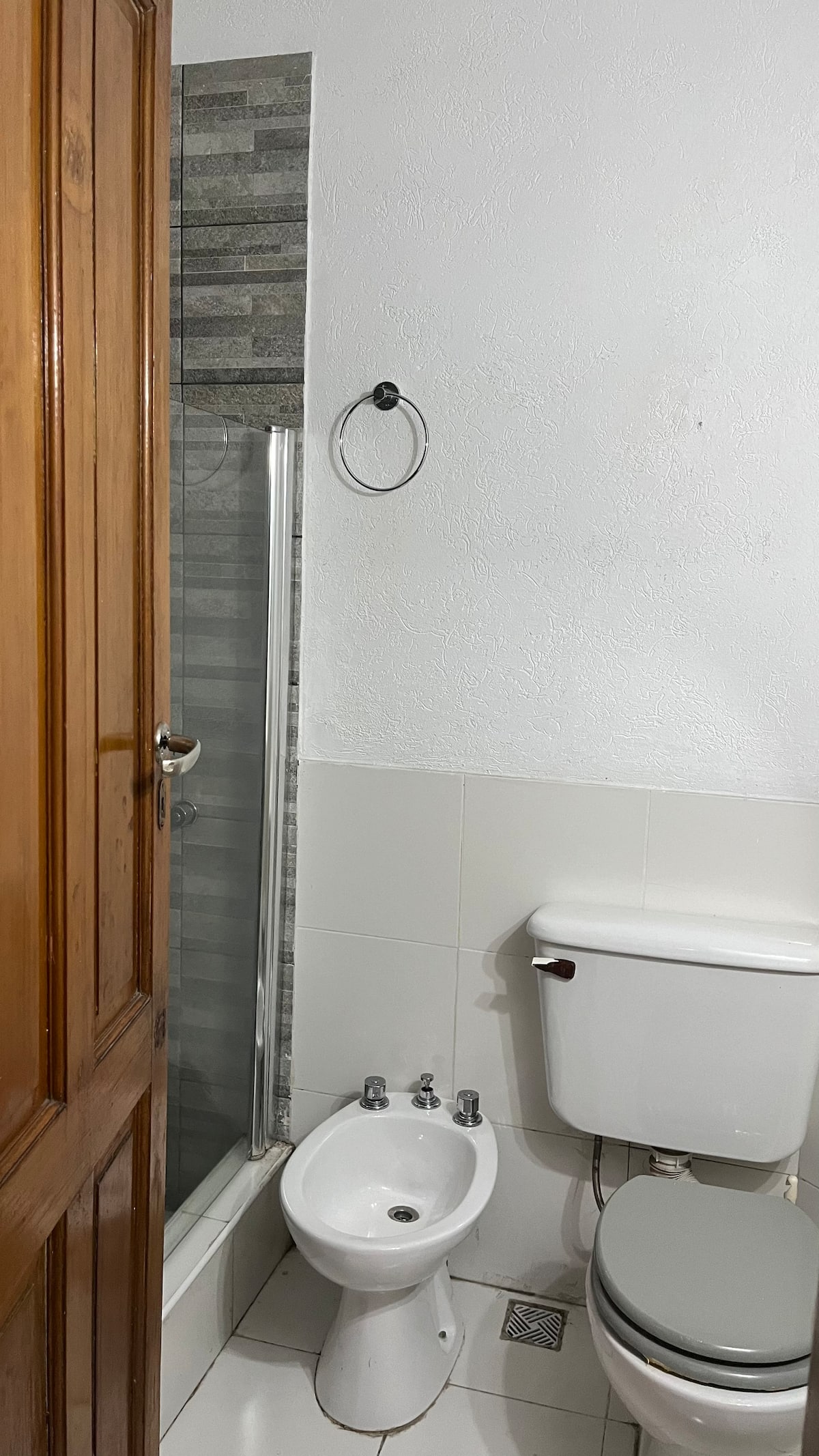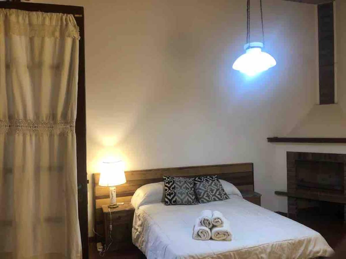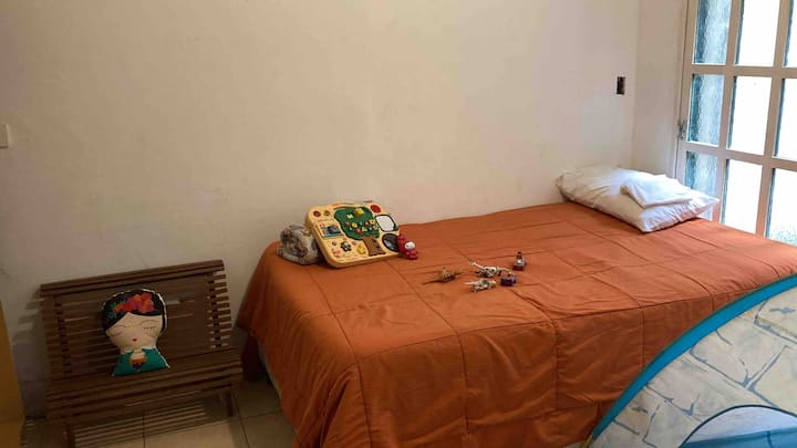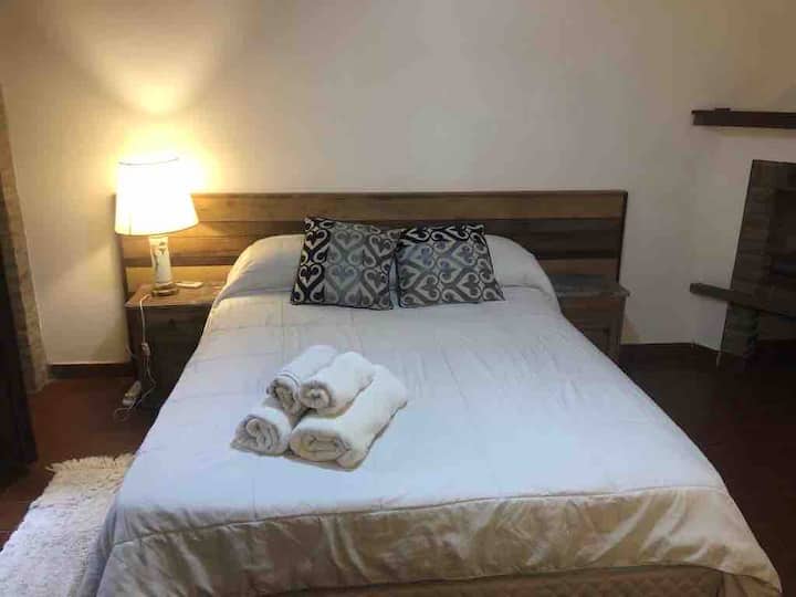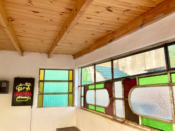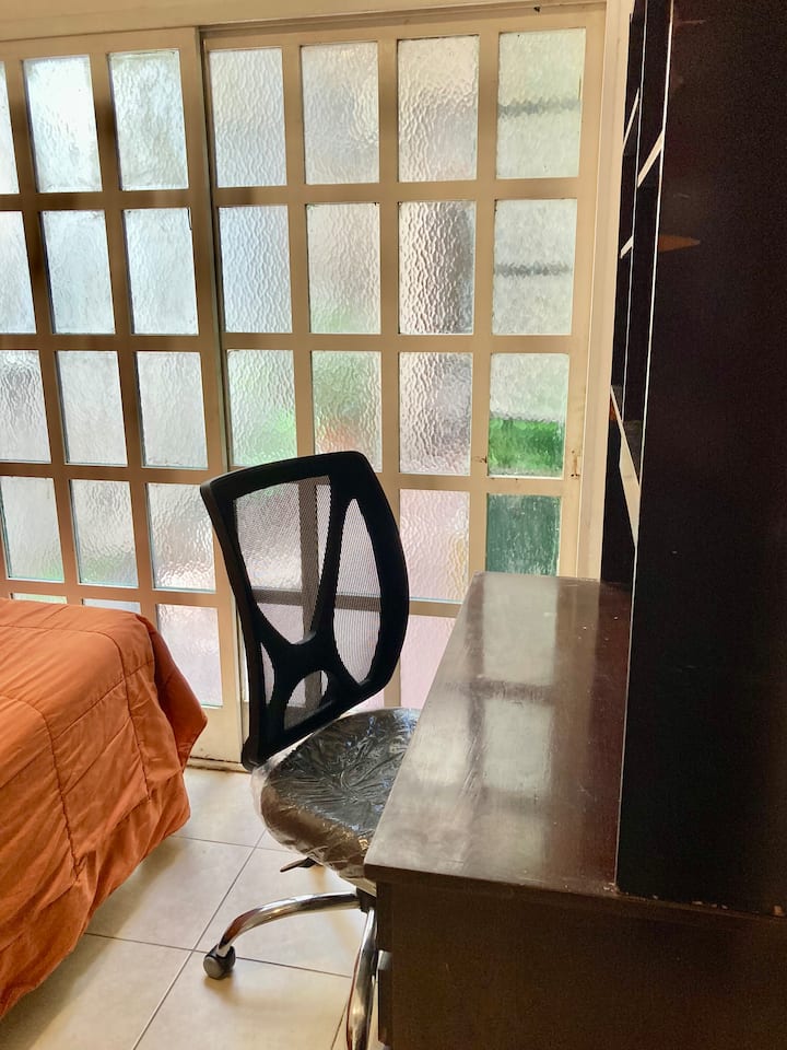 Two-bedroom apartment in Chacarita. One bedroom has a double bed, an en-suite bathroom and air conditioning. The second bedroom includes a desk and chair, with towels provided. There is a second full bathroom and a combined living and dining area integrated with the kitchen, overlooking an interior window for natural light, plus an inner courtyard with plants. The unit also has access via a large terrace with a grill on the first floor, in an upstairs property. Construction is underway on the bl