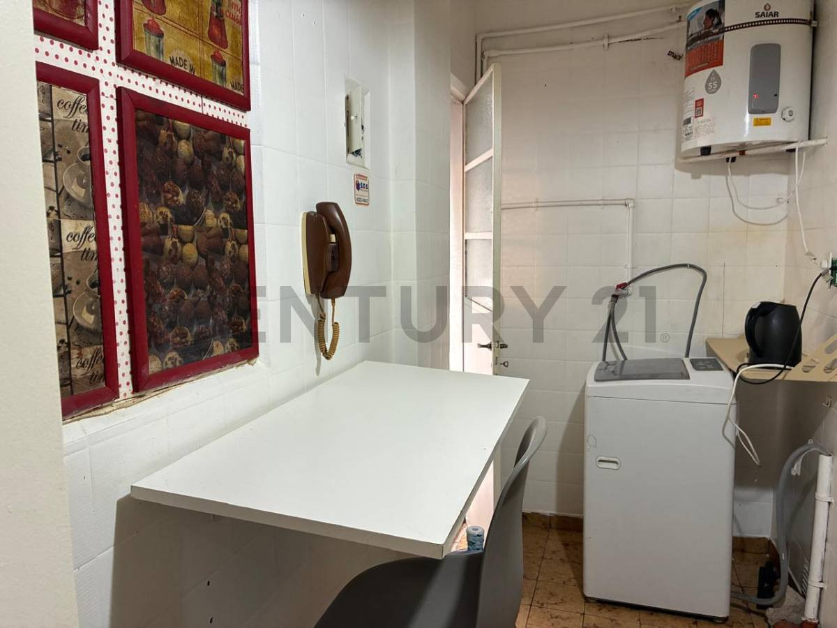 Departamento amoblado de 2 ambientes y medio, con 2 dormitorios, en planta baja con patio. El ingreso tiene un hall de 2,02 x 1,10 m; el living comedor cuenta con sillón, mesa, sillas, TV y ventanal al exterior de 3,75 x 2,85 m. El dormitorio principal tiene cama de dos plazas, mesas de luz y placards empotrados; el baño completo tiene ventilación natural. La cocina, con muebles alto y bajo mesada, heladera, lavarropas, barra desayunadora, termotanque, horno eléctrico y anafes, tiene salida al p