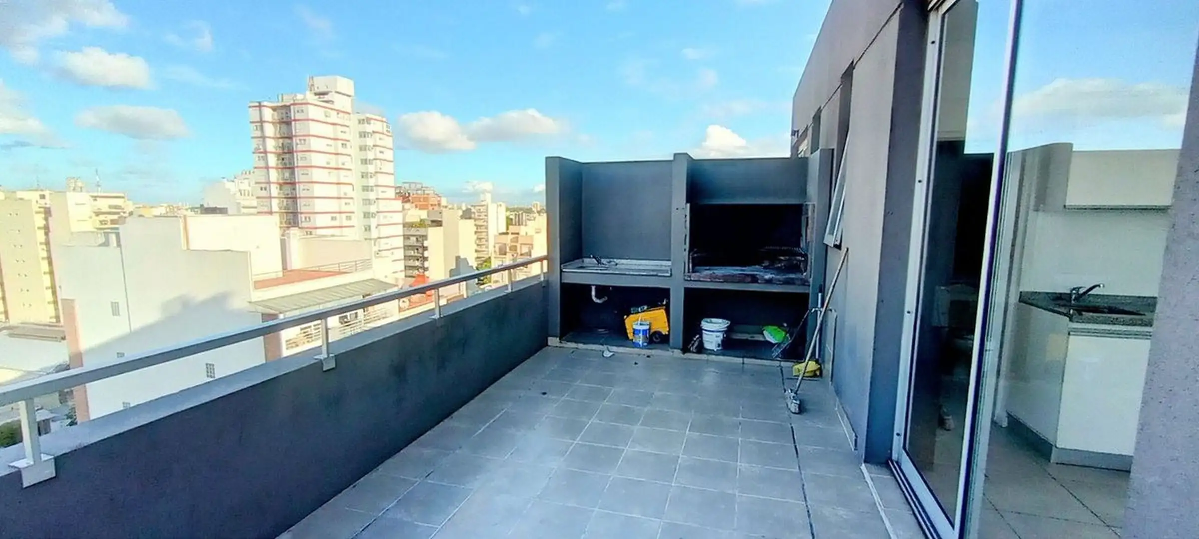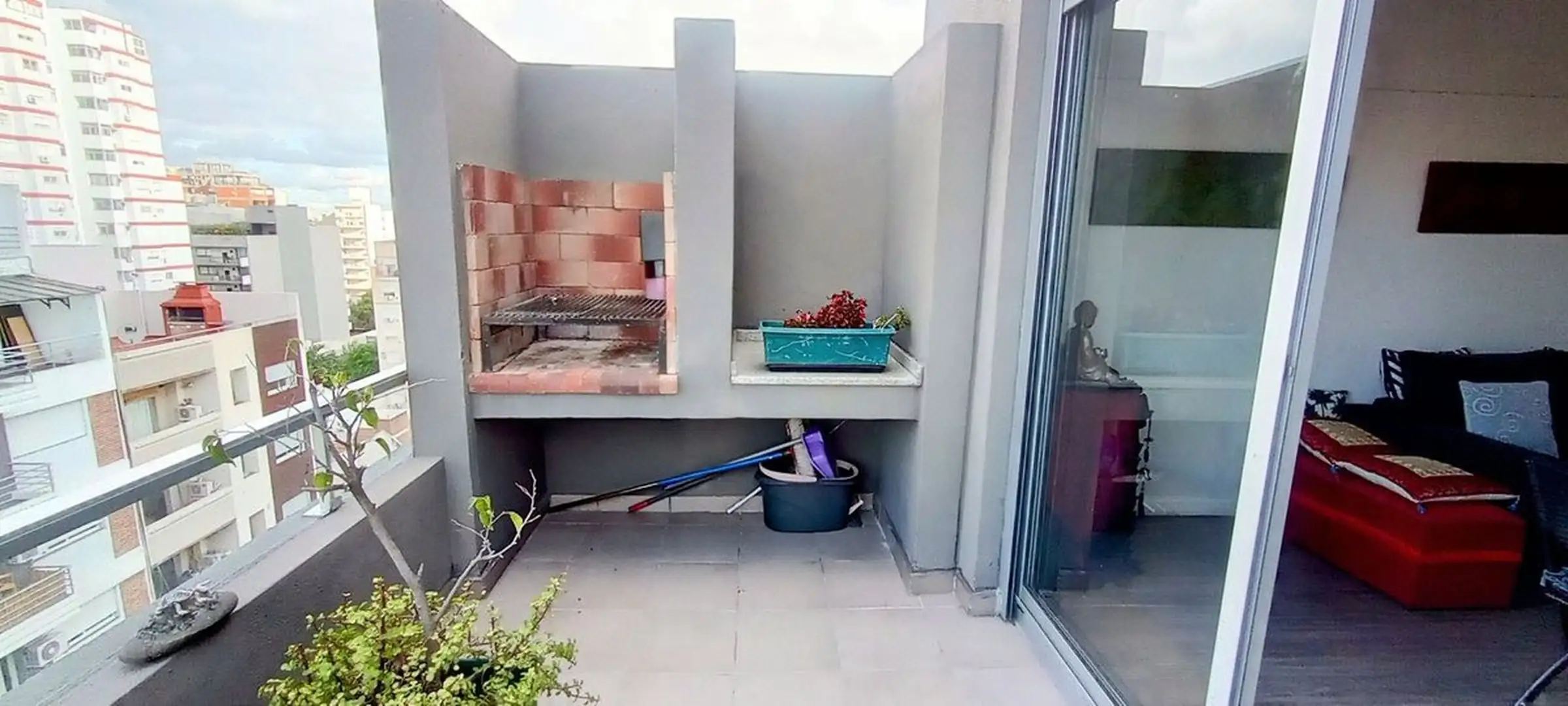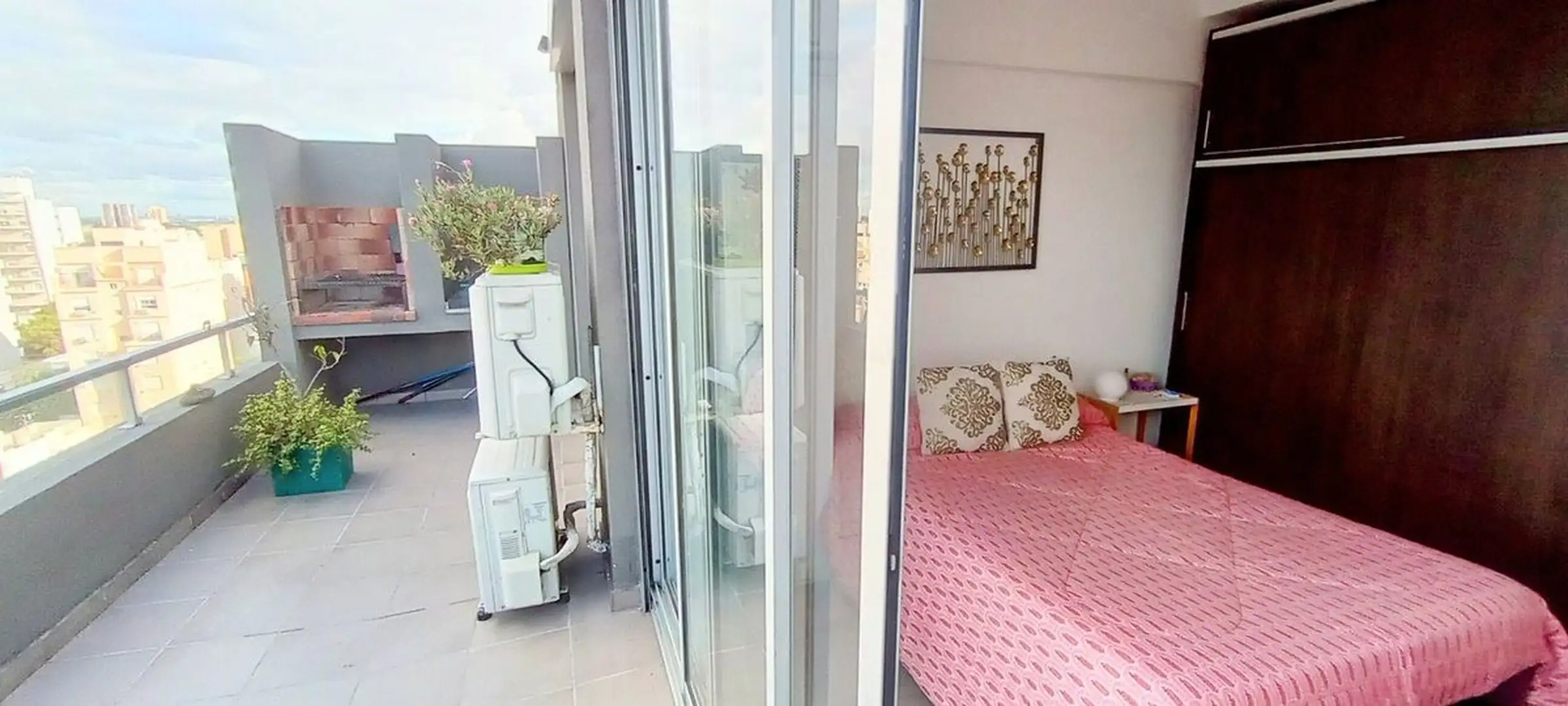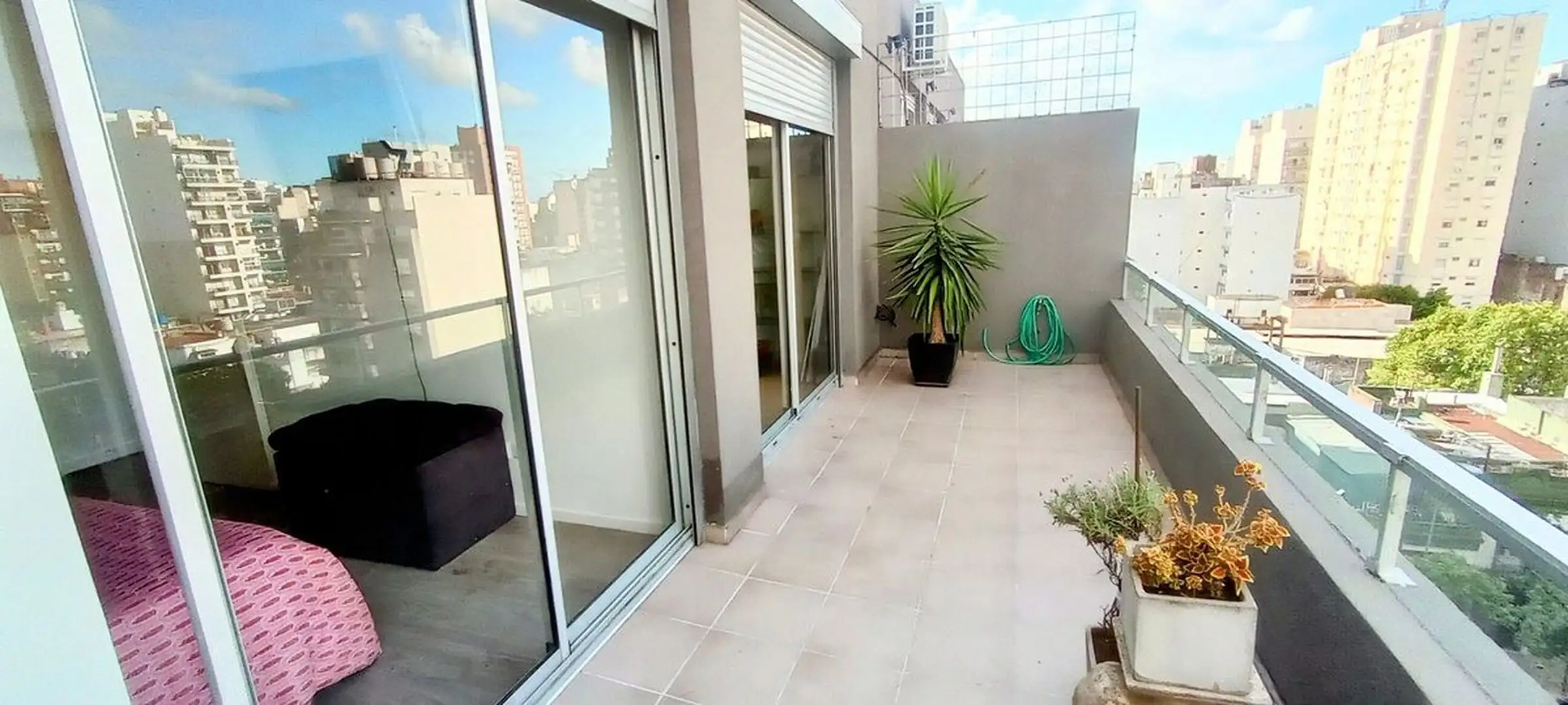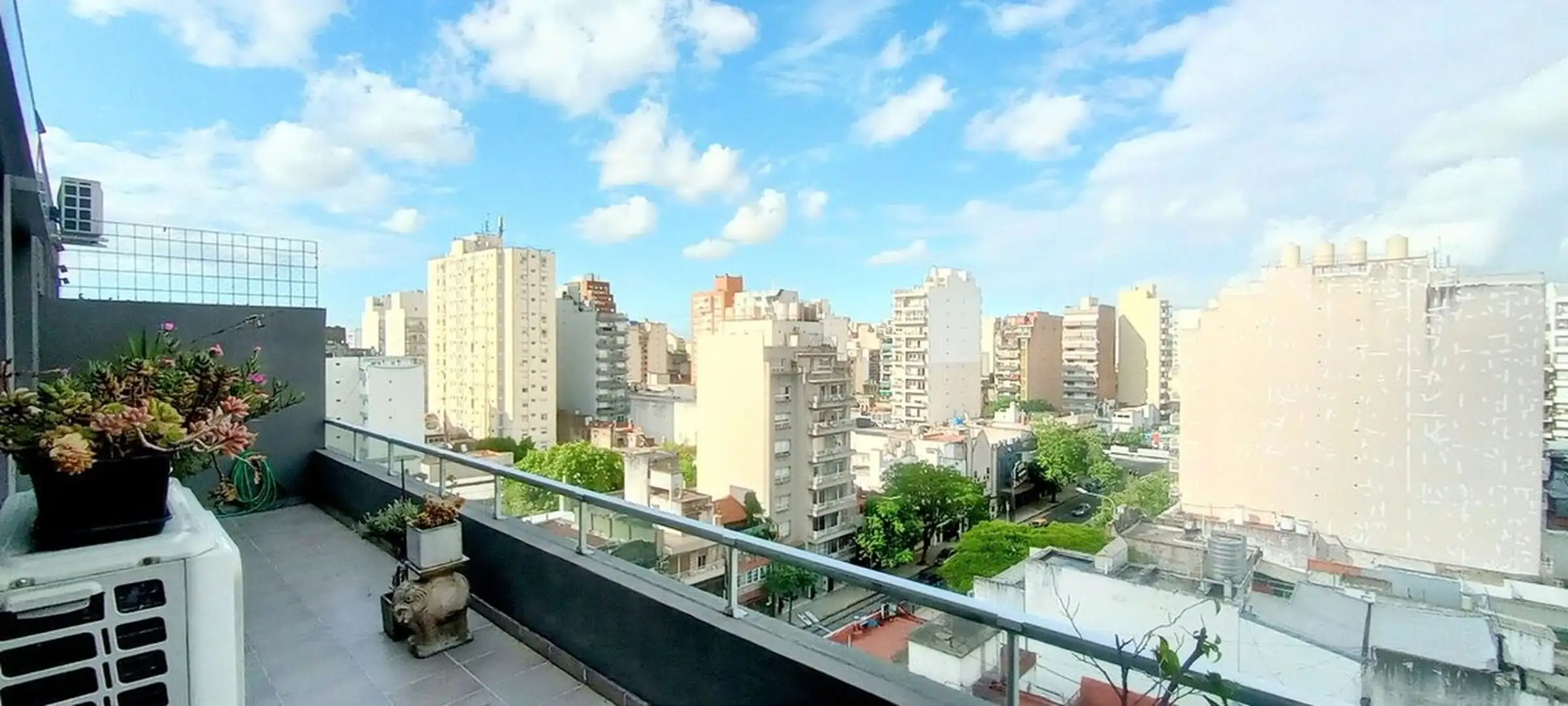 Departamento de 3 ambientes en un piso alto de Quirno al 200, Flores. Cuenta con living comedor con cocina integrada y barra desayunadora, 2 dormitorios y baño completo con bañera. Está totalmente amoblado y equipado: heladera y microondas, persianas eléctricas, aire acondicionado, sofá cama y mesa con sillas. Incluye gran balcón terraza con parrilla y vistas abiertas.