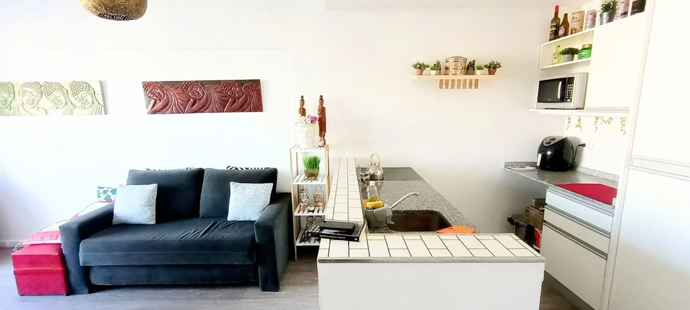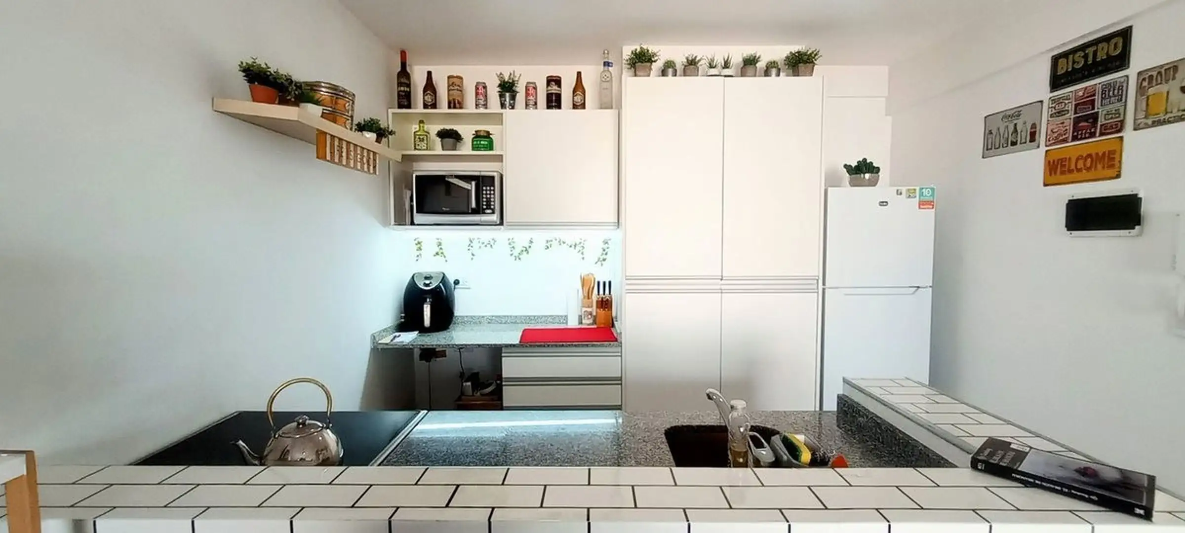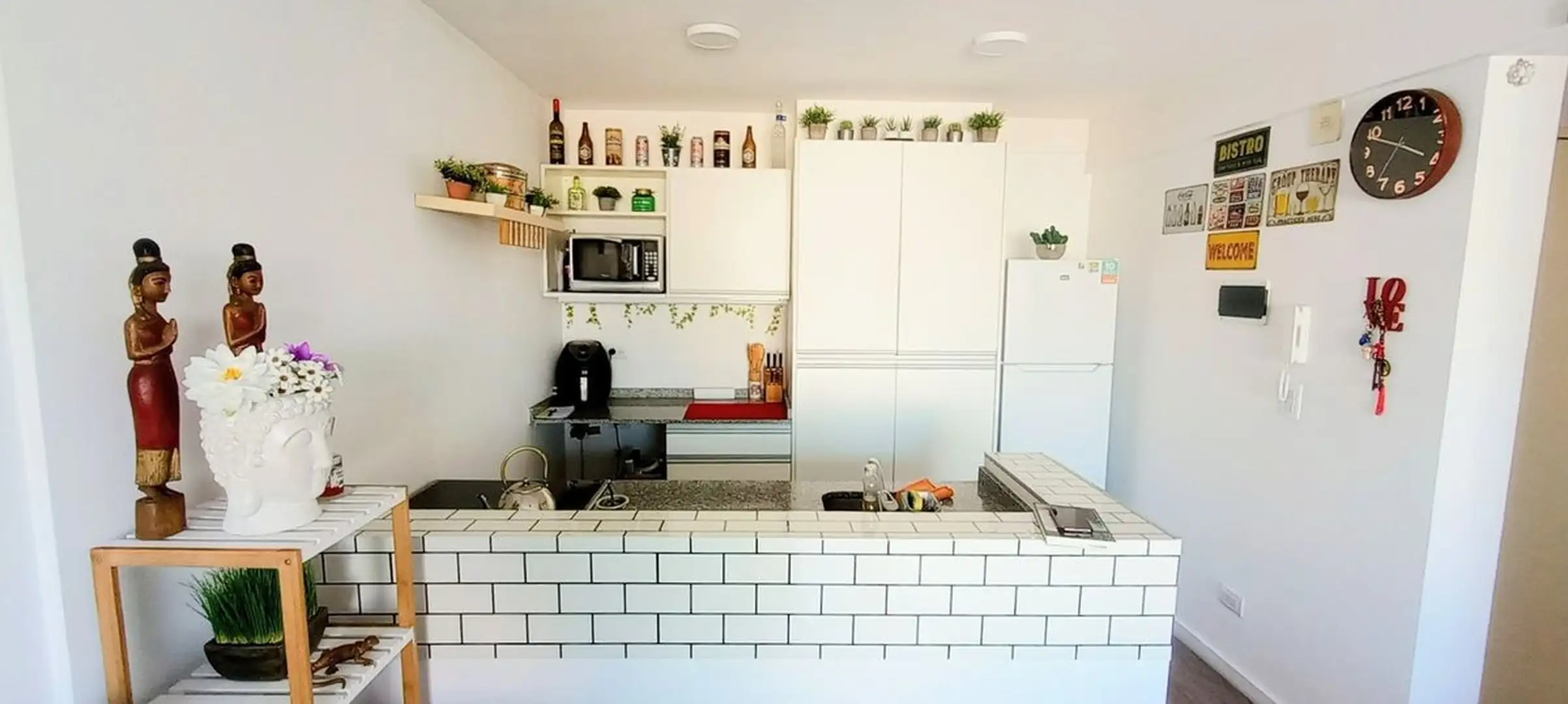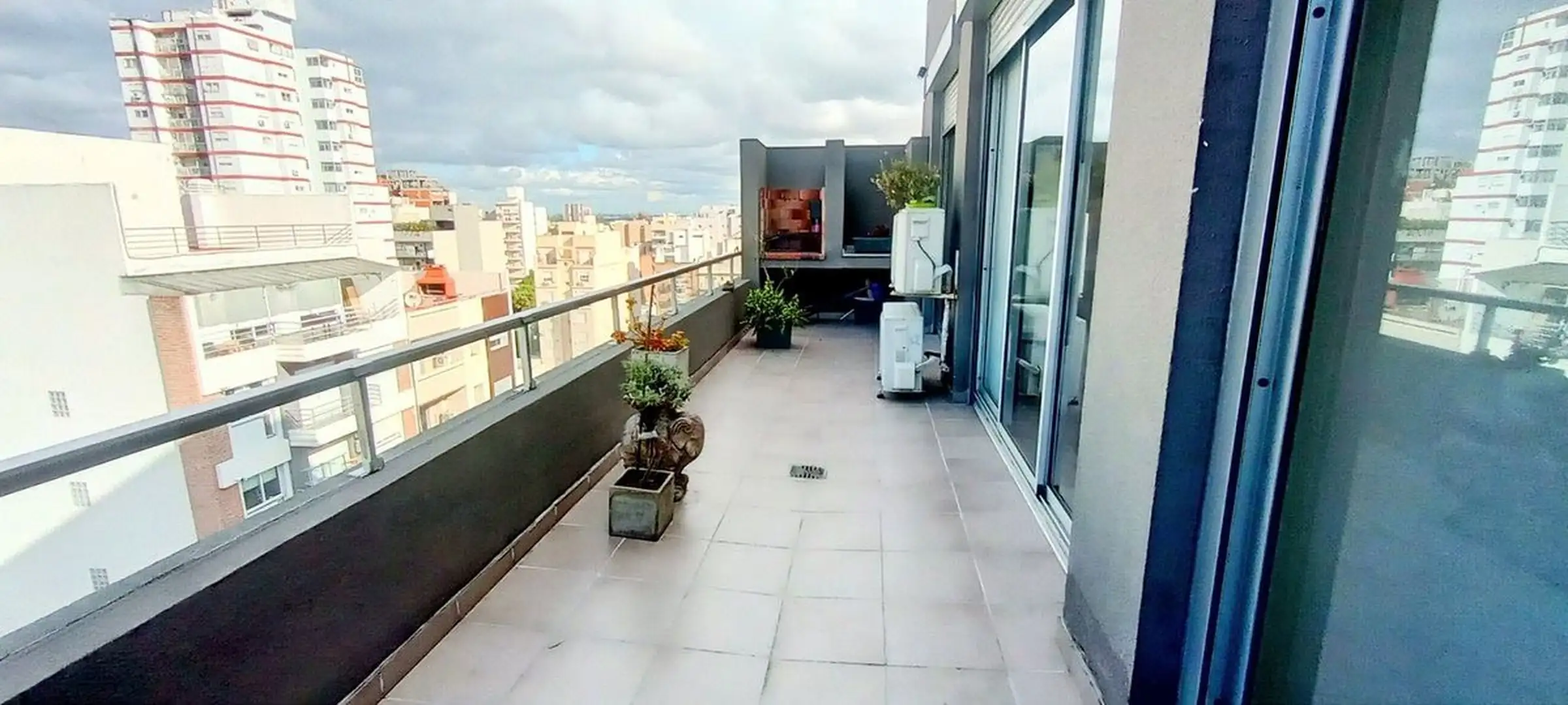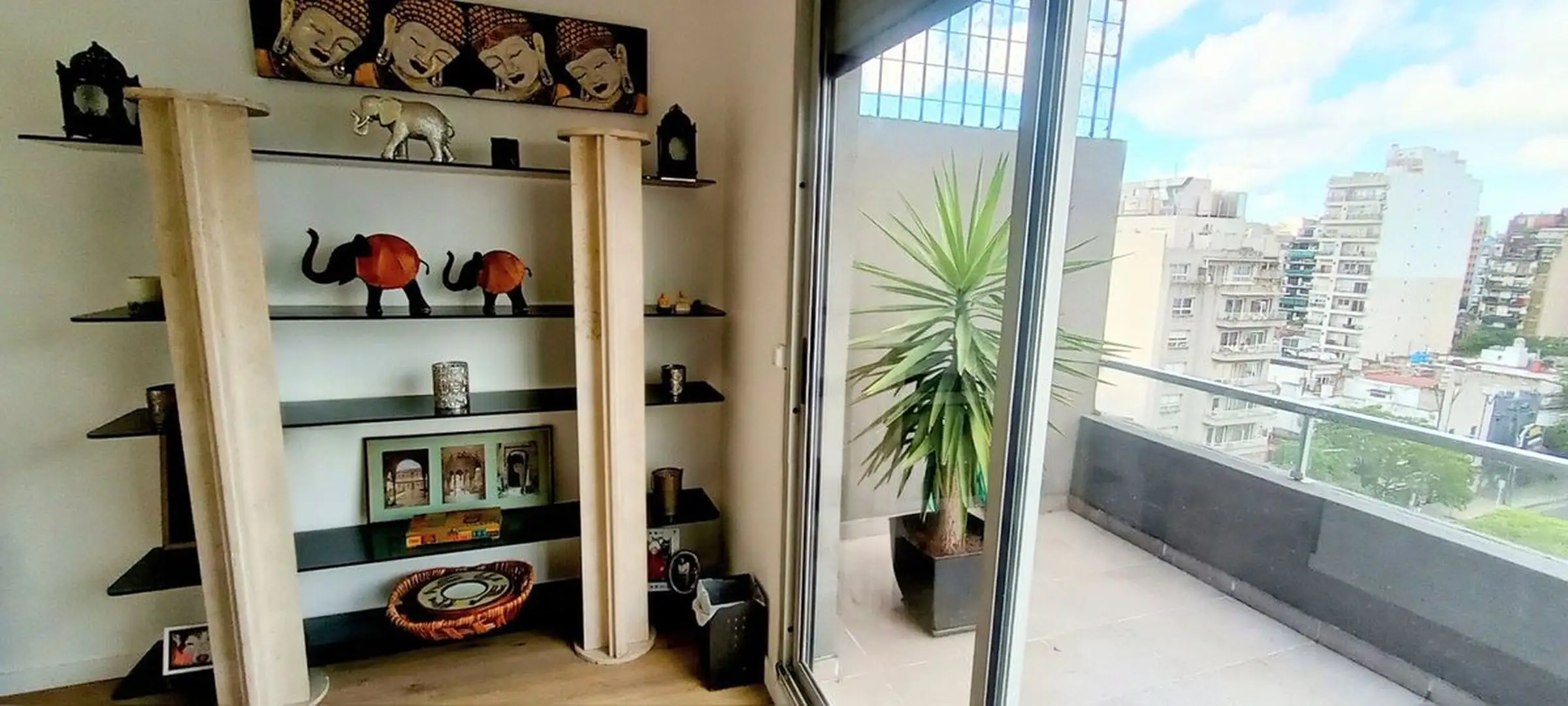Departamento de 3 ambientes en un piso alto de Quirno al 200, Flores. Cuenta con living comedor con cocina integrada y barra desayunadora, 2 dormitorios y baño completo con bañera. Está totalmente amoblado y equipado: heladera y microondas, persianas eléctricas, aire acondicionado, sofá cama y mesa con sillas. Incluye gran balcón terraza con parrilla y vistas abiertas.