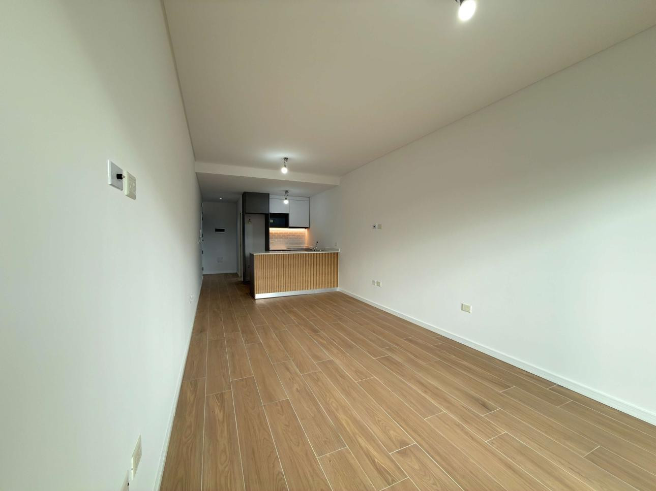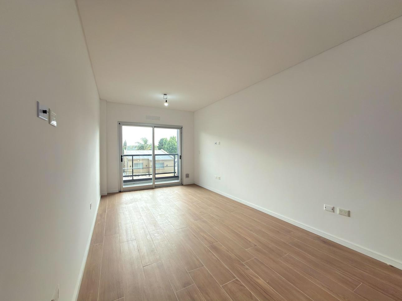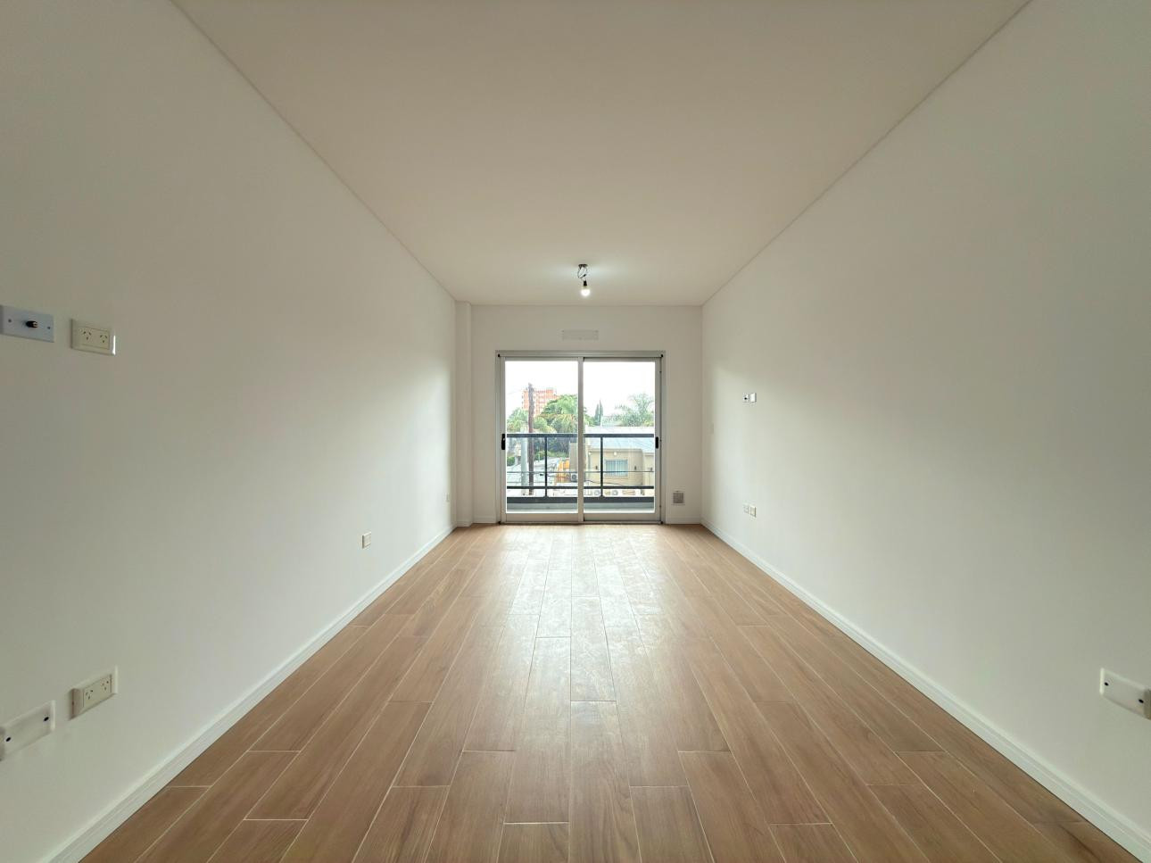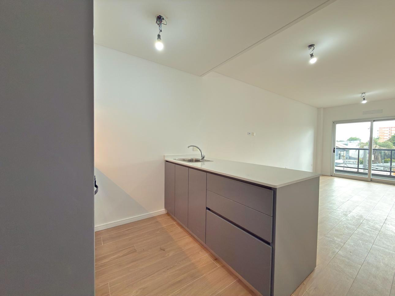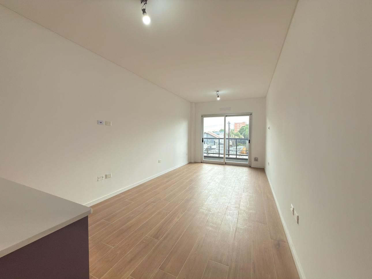 Monoambiente a estrenar de 34 m² con balcón al frente, en edificio de 3 pisos. La unidad se ubica en un frente con puerta de seguridad y acceso por huella dactilar o clave. Cuenta con pisos de porcelanato símil madera, amplio ventanal y cocina integrada con isla, artefacto de inducción, horno, bacha con grifería, conexión para lavarropas y espacio previsto para lavarropas. El edificio tiene ascensor y 6 unidades por nivel.