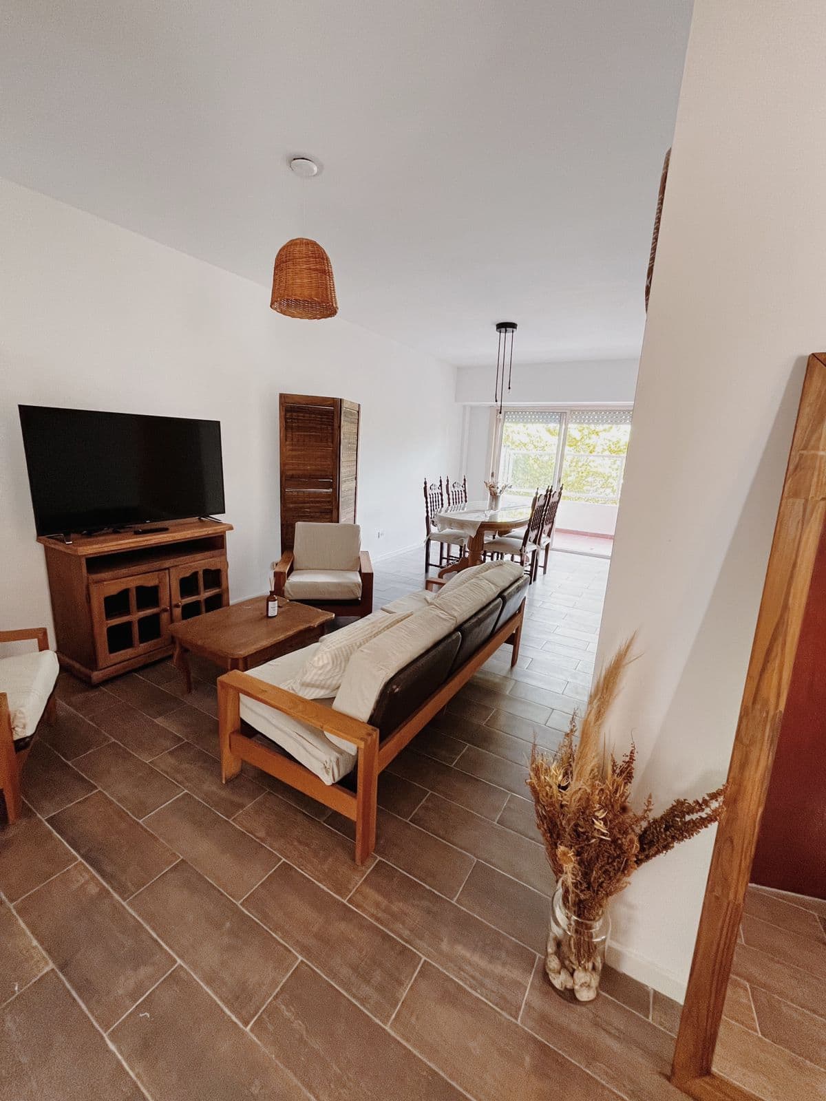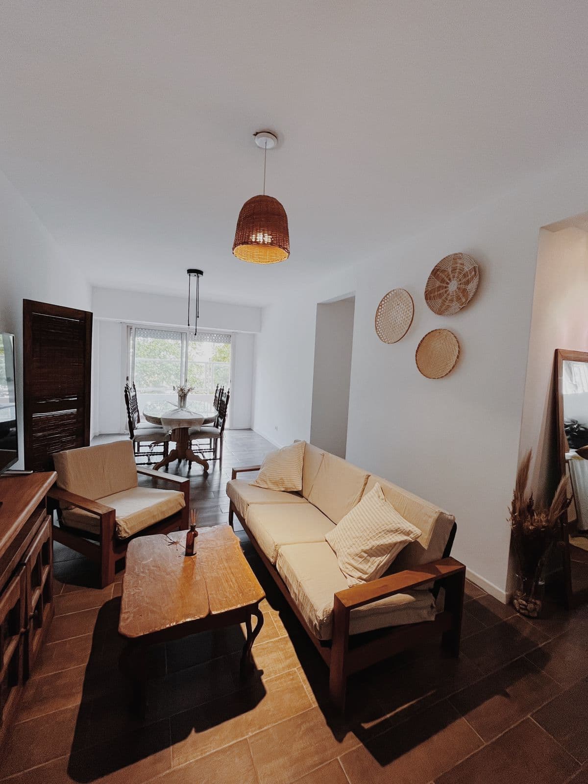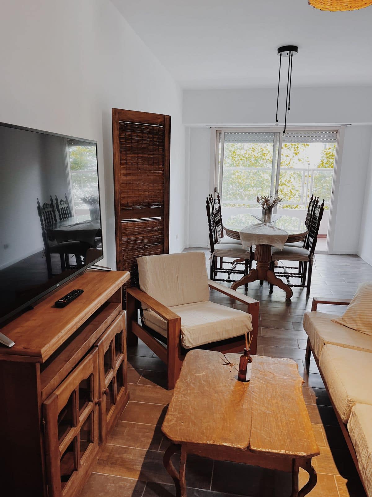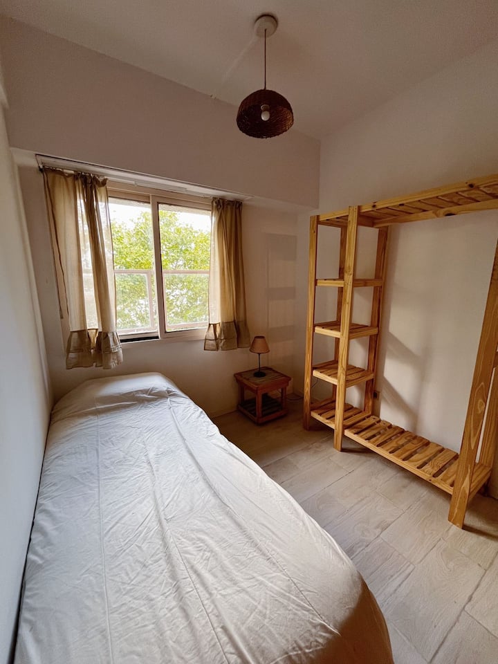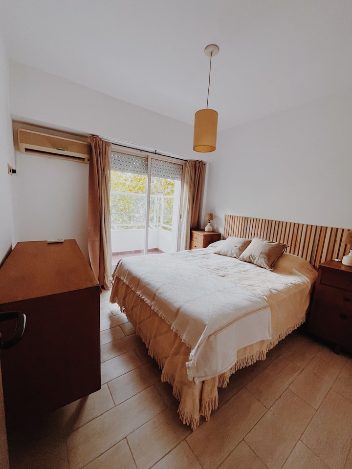 Departamento de 3 ambientes en General San Martín, Buenos Aires. Tiene 2 dormitorios; en el dormitorio principal hay cama king y aire acondicionado. Cocina equipada, living con TV y balcón. En el dormitorio secundario hay 1 cama, con cuna debajo para un niño.
