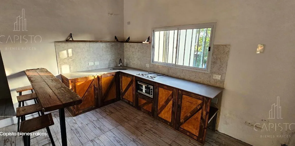 PH en planta alta al frente con ingreso por escalera, sin expensas. Cocina comedor living con barra desayunadora y espacio para conexión de lavarropas; hogar/parrilla en el living. Dos cuartos y un baño completo. Terraza con parrilla. Antigüedad de 3 años, estilo cabaña con techos de madera; casi a estrenar. A partir de marzo 2026; acepta gato y no acepta perros.