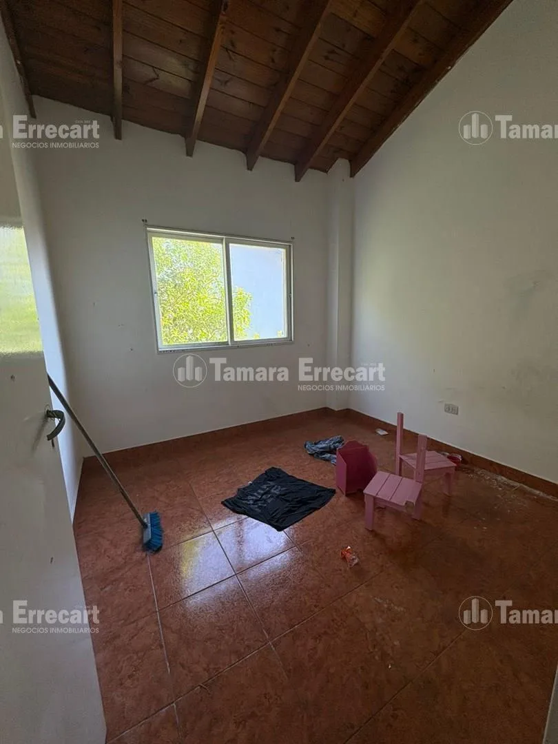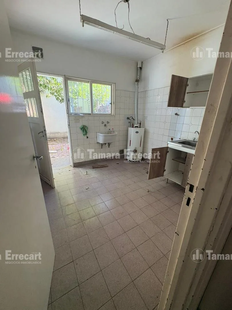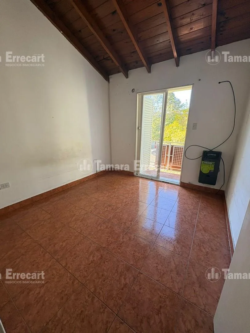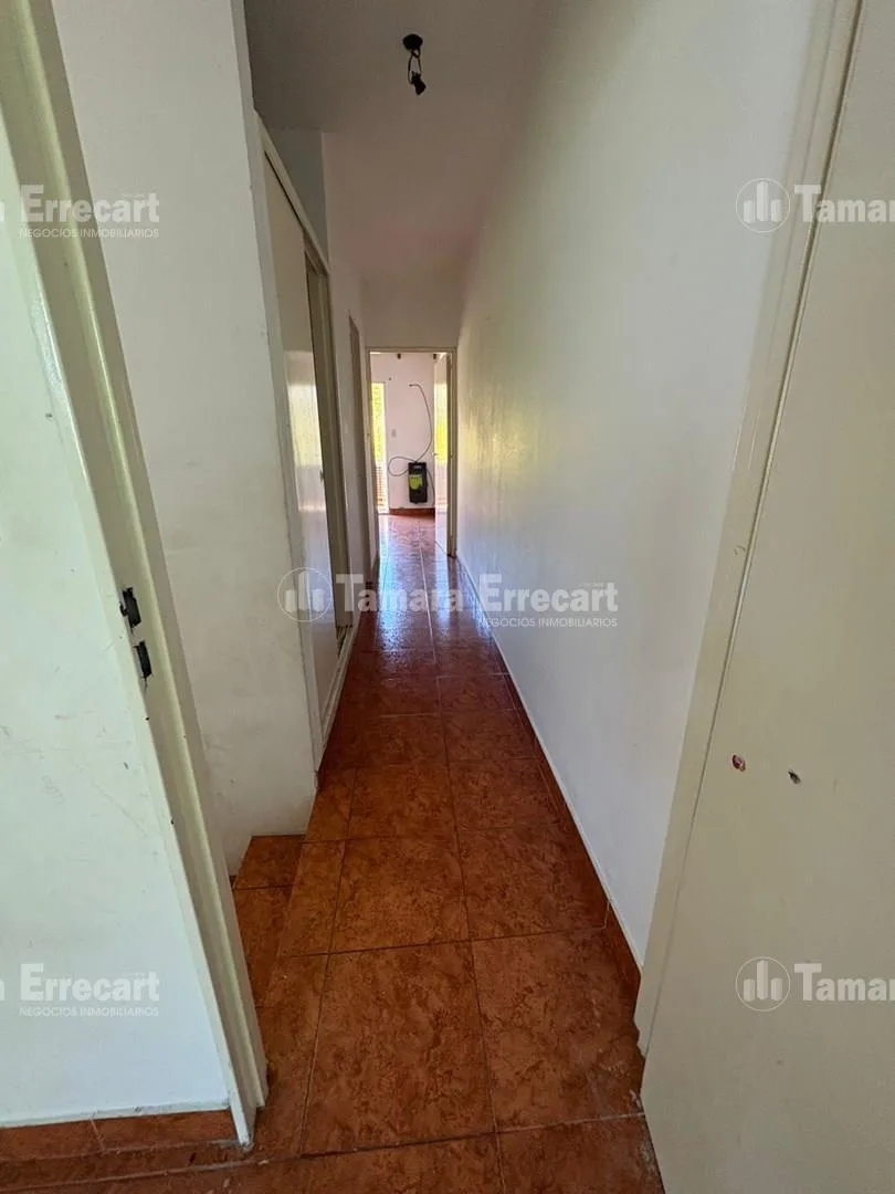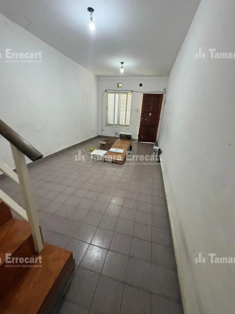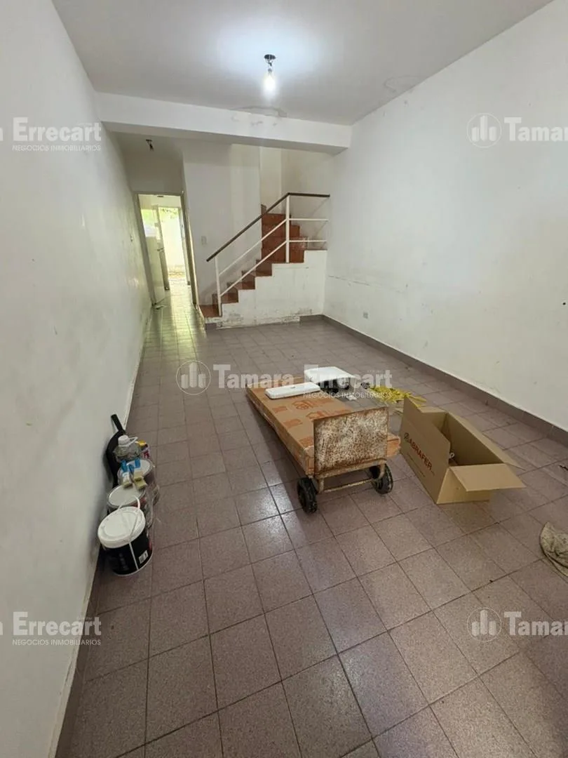 Duplex house for rent in Bella Vista, San Miguel, with a kitchen and living-dining area. It includes a guest toilet, 2 bedrooms, a full bathroom, a patio, and a driveway entrance. The rent is ARS 850,000 and includes building fees and ABL, for a 24-month contract with quarterly adjustments based on IPC.