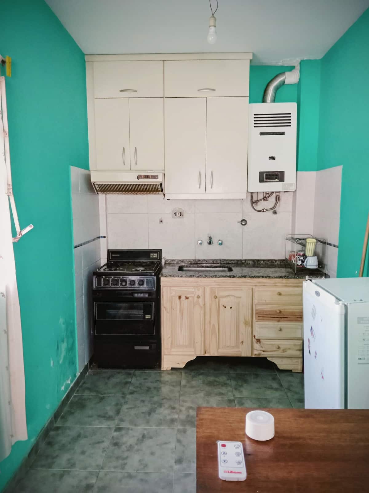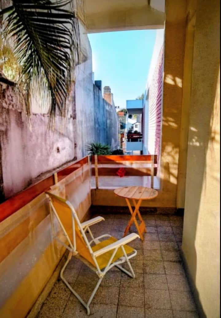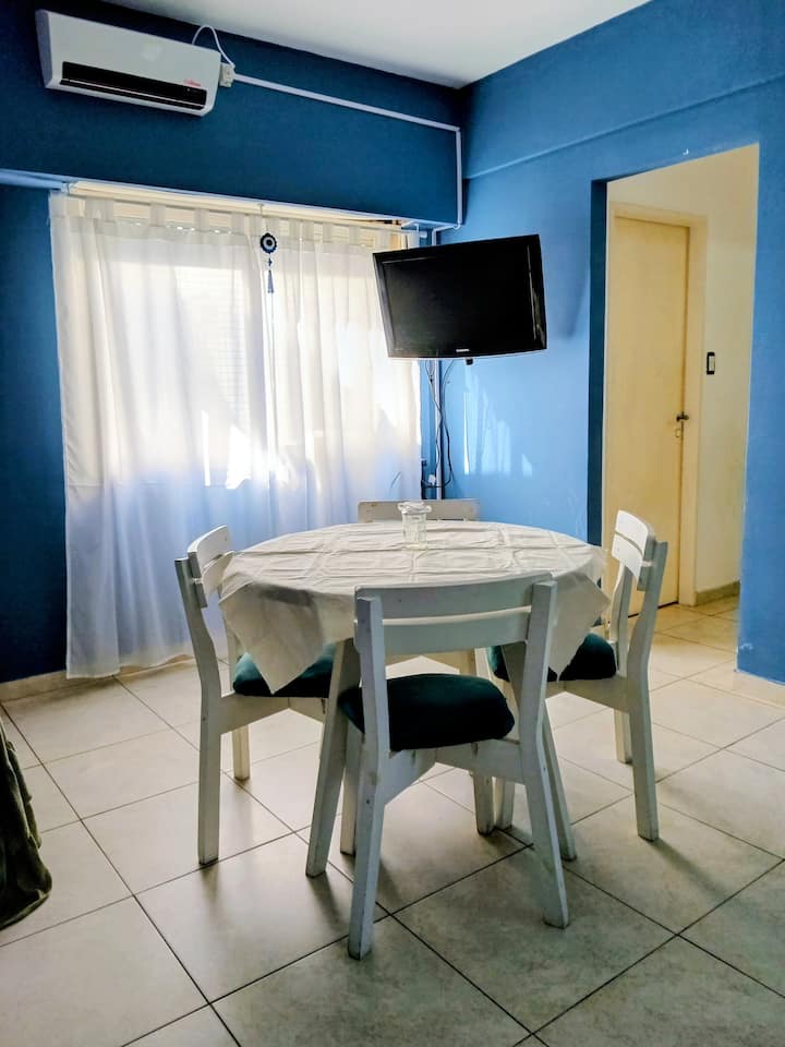 Apartamento de 2,5 ambientes mobiliado em La Matanza, em 1º andar acessado por escada. Tem 2 quartos, sala de estar e jantar, cozinha integrada com bancada para refeições, frigobar e minicongelador, além de área de serviço com lavadora automática. Inclui TV a cabo e Wi-Fi de 300 Mbps e varanda externa; o condomínio é descrito como residencial e silencioso.