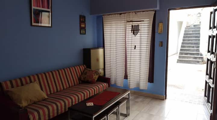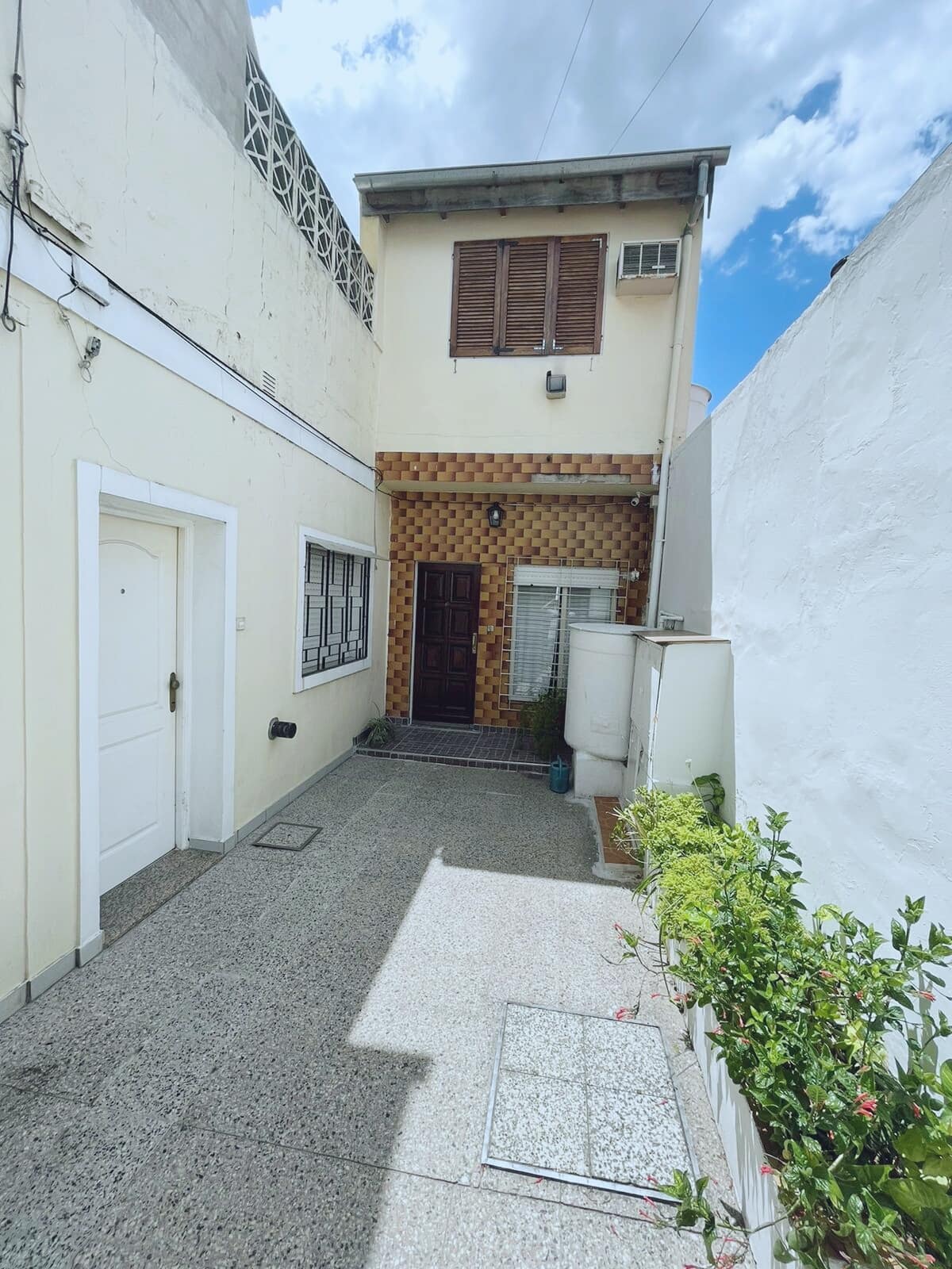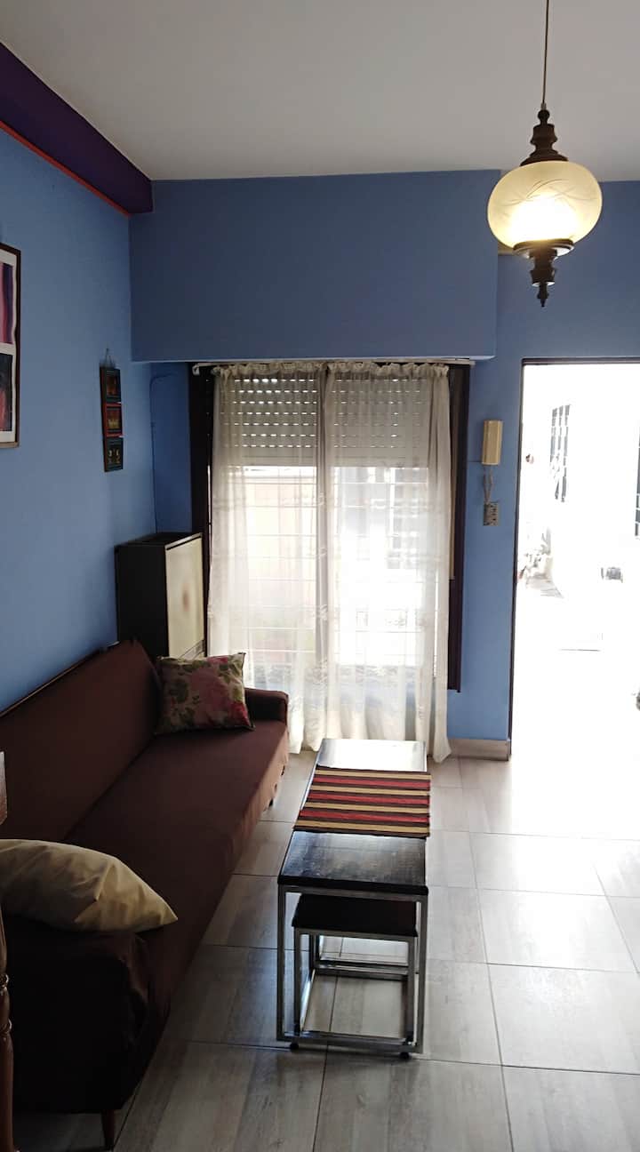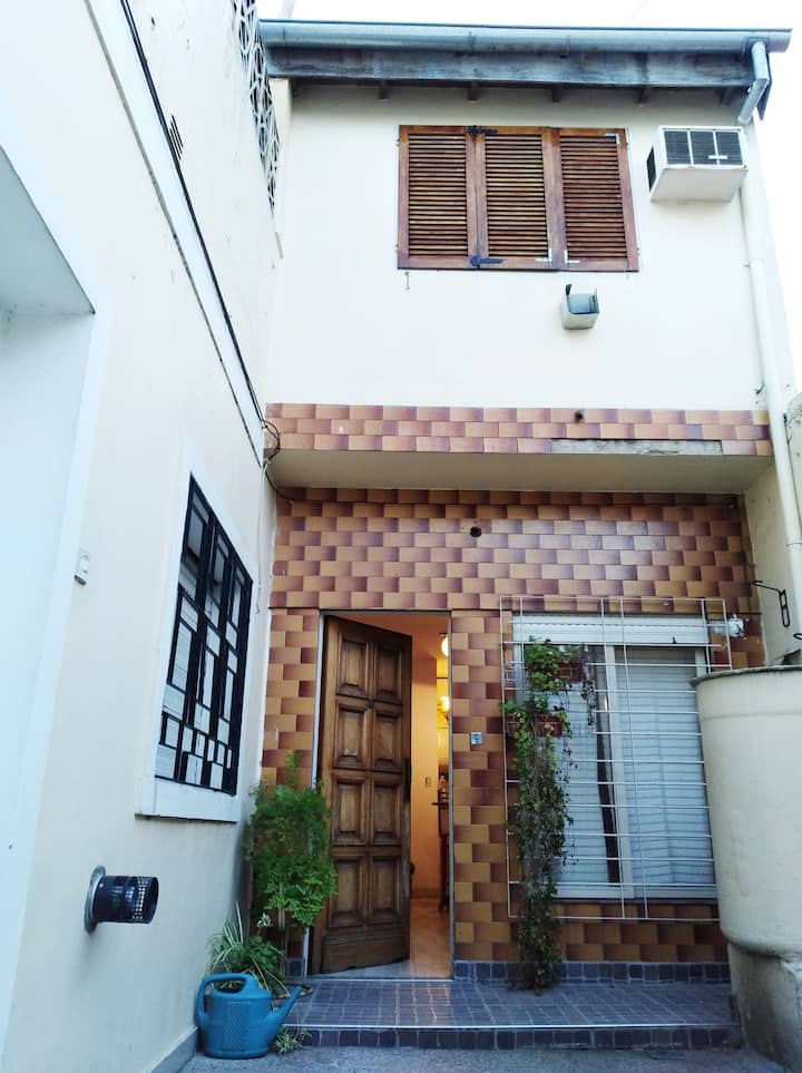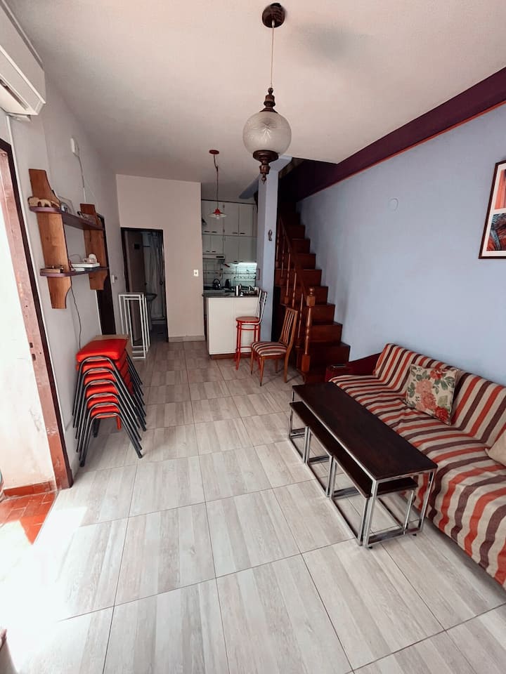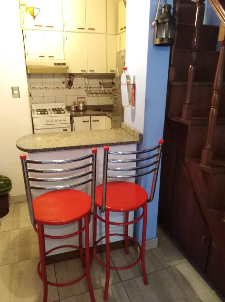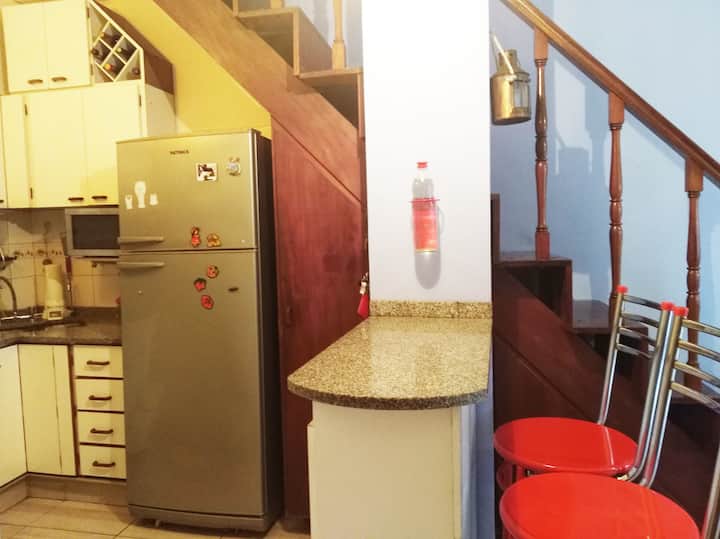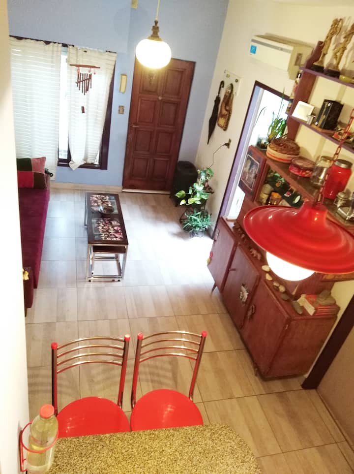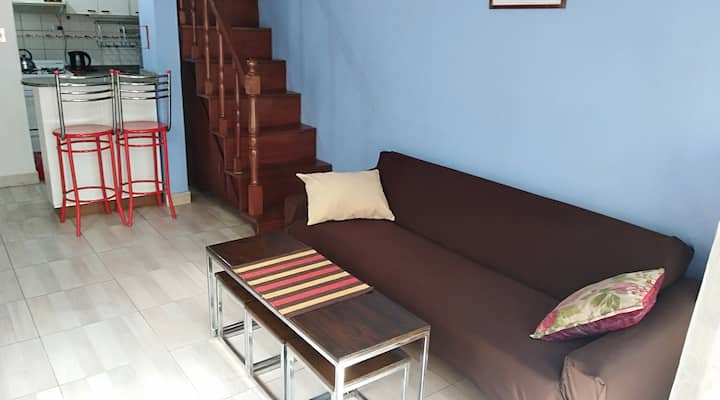 Departamento penthouse en Ramos Mejía, orientado al sector interno de un patio de uso común con 3 unidades. Cuenta con 3 dormitorios, uno en planta alta con escritorio y aire acondicionado, y 2 baños completos en total, más un baño adicional en la planta baja. En la planta baja tiene living-comedor con aire acondicionado, cocina equipada, cama sofa y barra desayunadora. Incluye patio con espacio exterior, terraza con lavarropas y parrilla. Se encuentra cerca de comercios y líneas de colectivos y