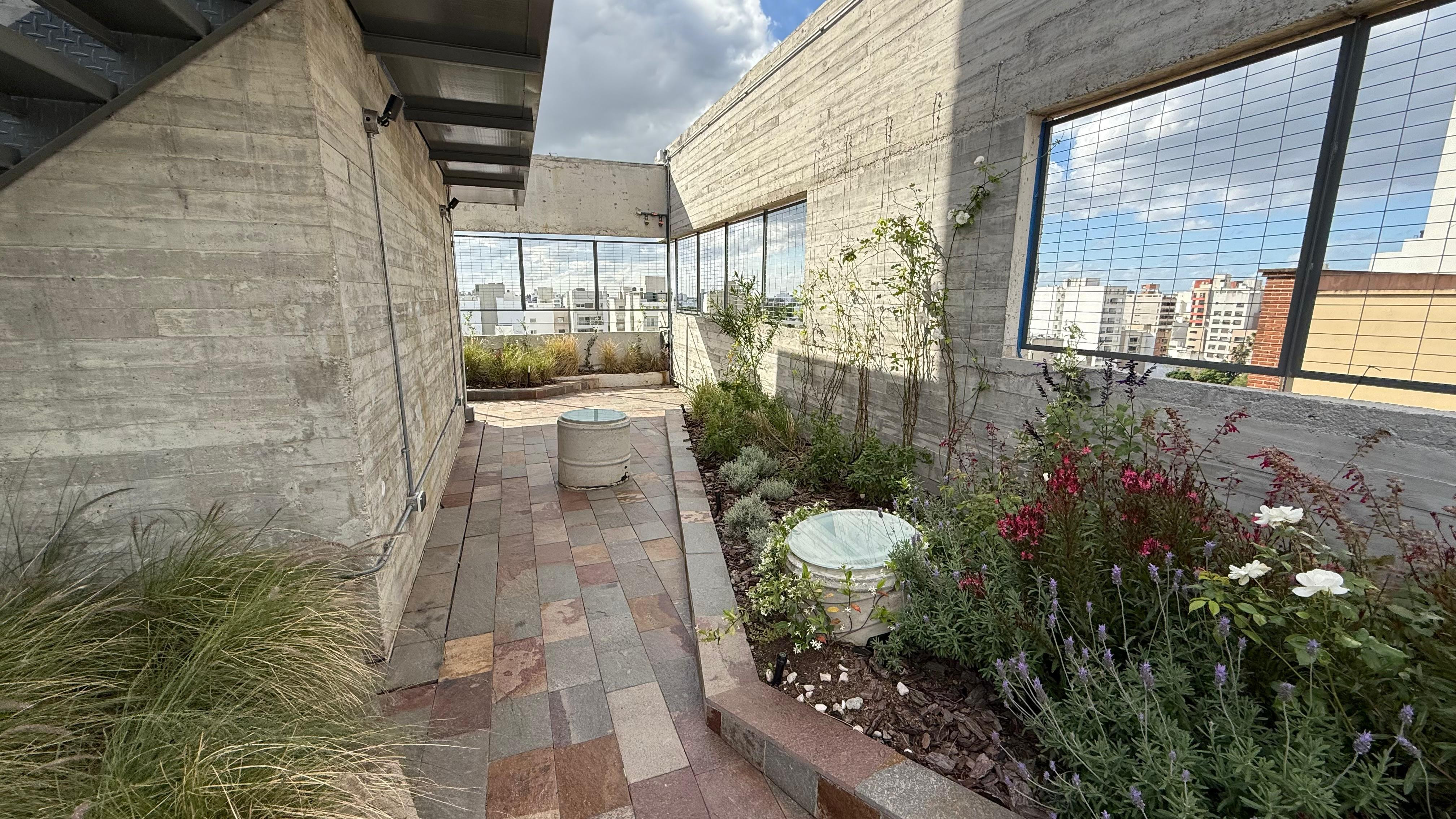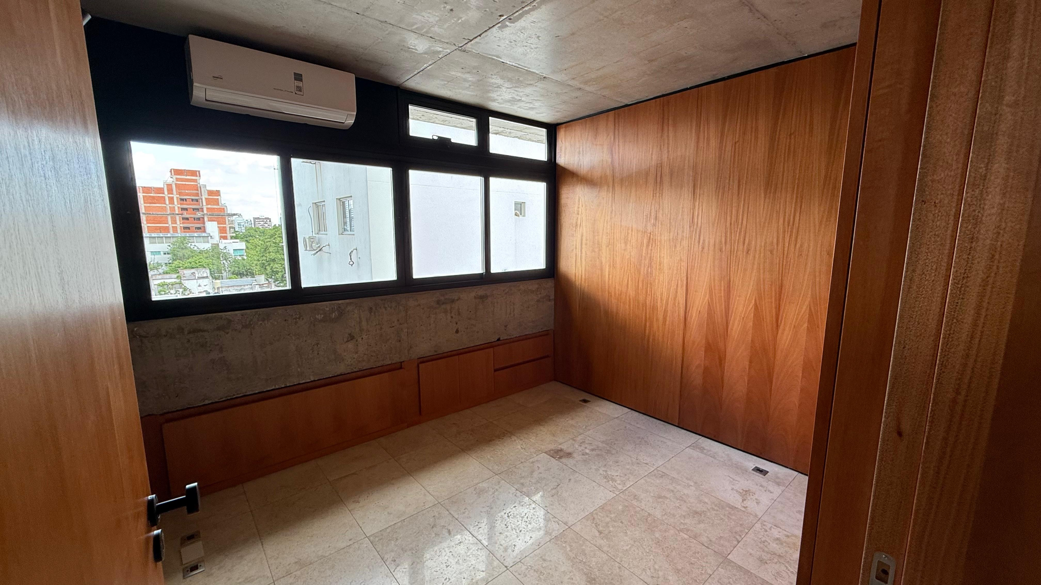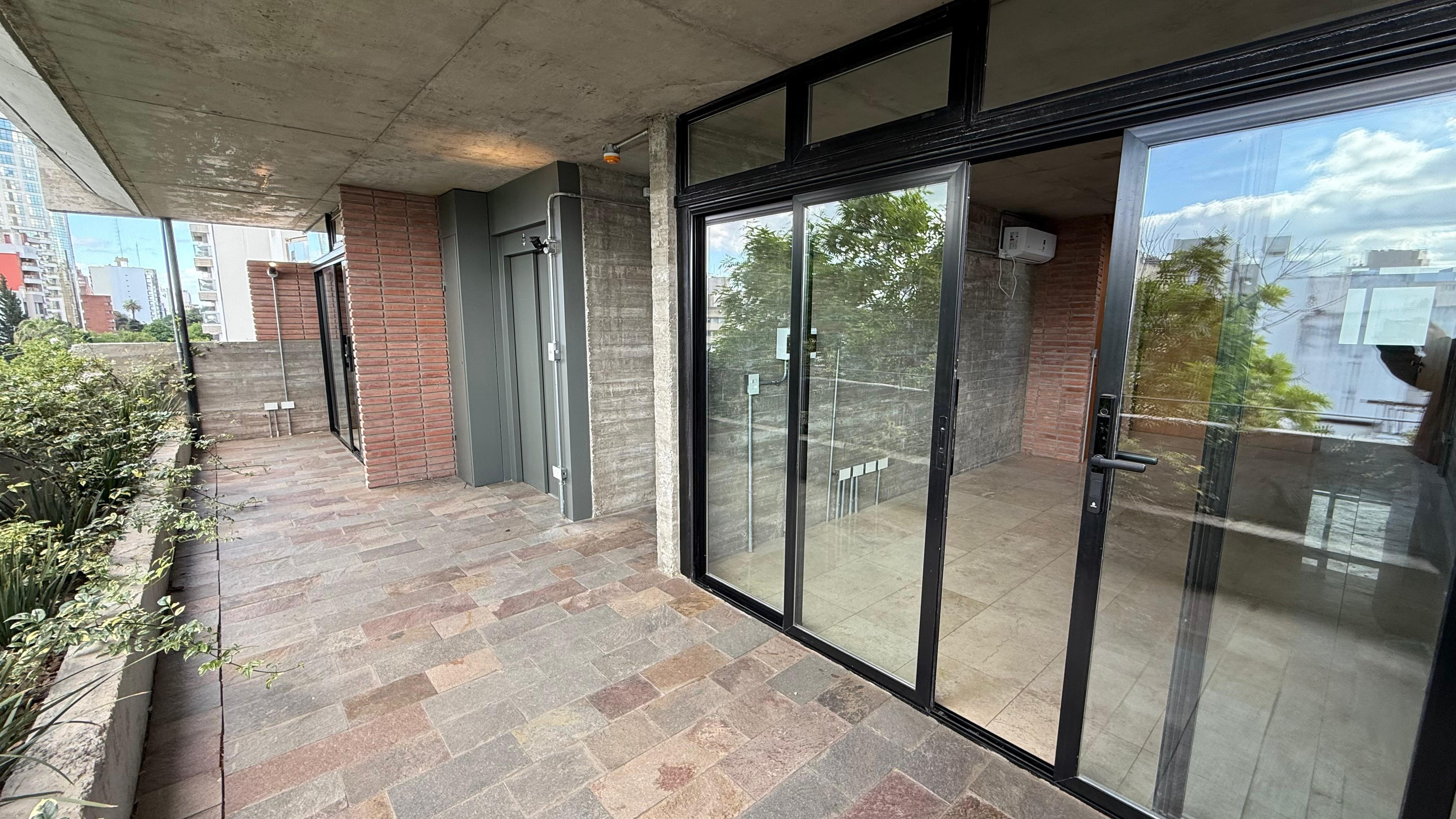 Departamento de 2 dormitorios con 115 m² totales, 89 m² cubiertos y 26 m² semicubiertos, al frente y contrafrente, con balcón aterrazado y patio cubierto. Se entrega con 4 equipos de aire acondicionado. Cocina con horno eléctrico empotrado, anafe vitrocerámico y campana extractora; instalación para lavarropas con puerta corrediza. Edificio con estética industrial, doble vidriado hermético, pisos de travertino y orientación noroeste; agua caliente por termotanque eléctrico por unidad.