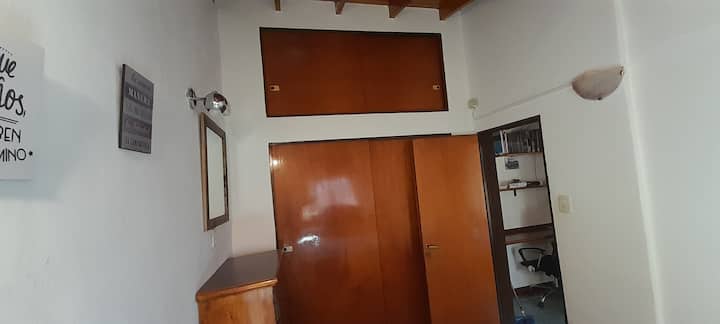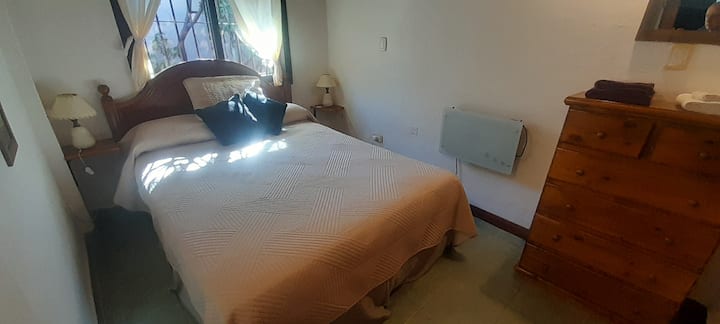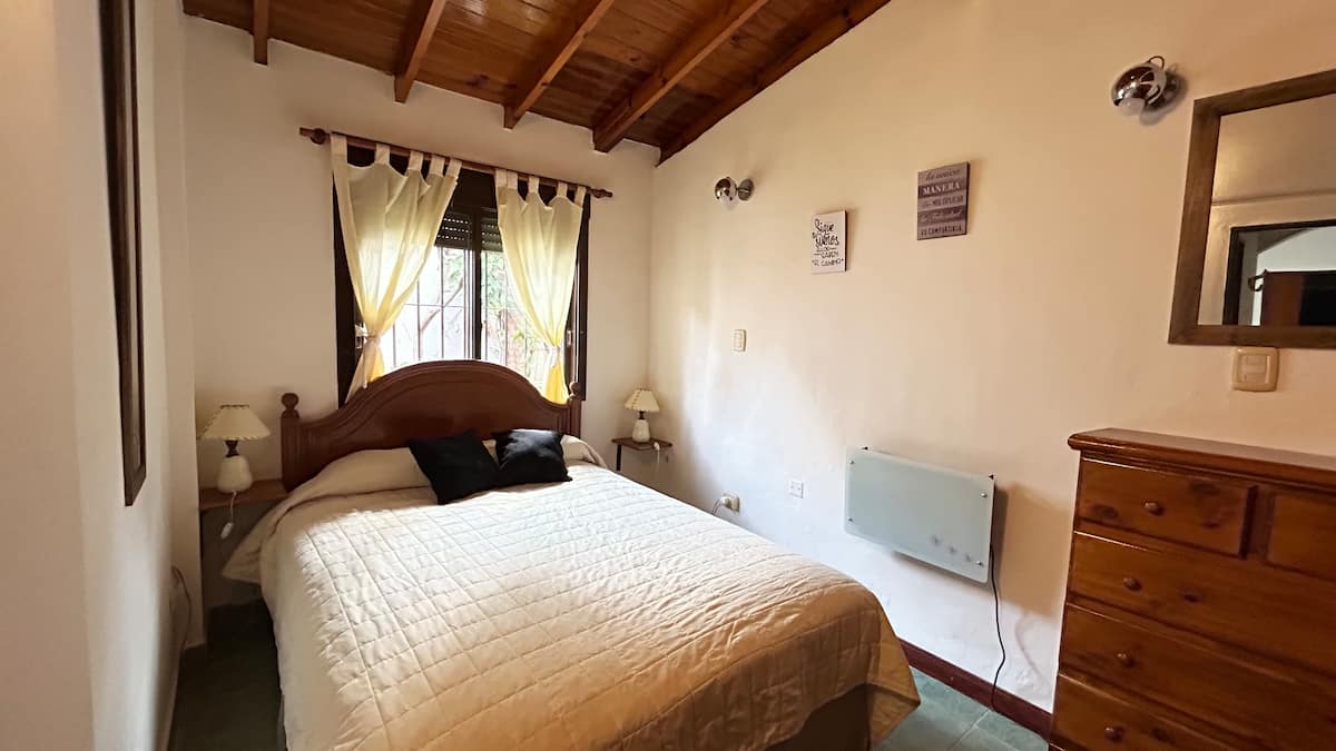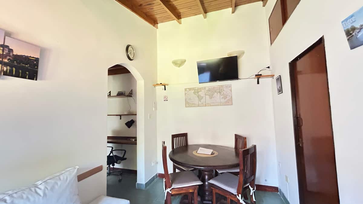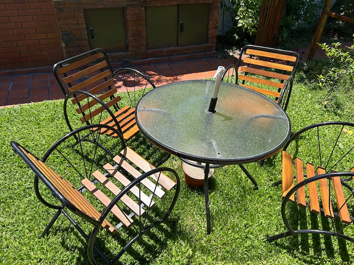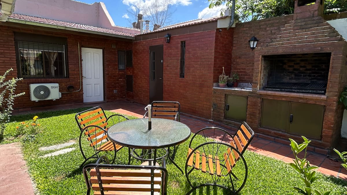 Casa tipo PH en el fondo del lote, con sol de mañana. Cuenta con jardín, parrilla y un lavadero con ingreso independiente dentro del lote, con acceso compartido desde la calle. En planta principal hay cocina abierta con living-comedor, mesa, sofá cama, TV y aire acondicionado, además de un dormitorio con cama y otro con cama queen y placard amplio; el baño completo tiene bañera y bidet. El lavadero incluye lavarropas y tender. Hay estacionamiento en la calle o cochera dentro del predio. Está a 2