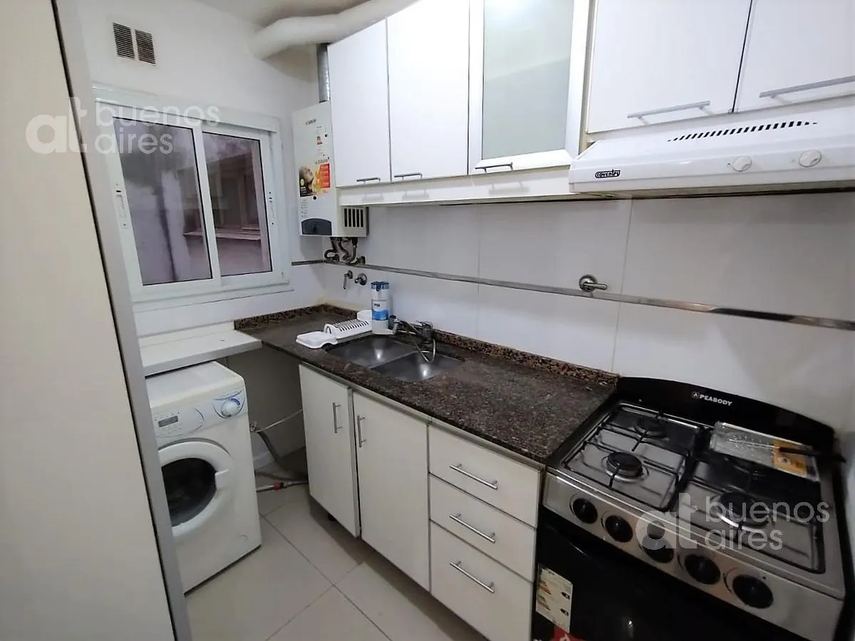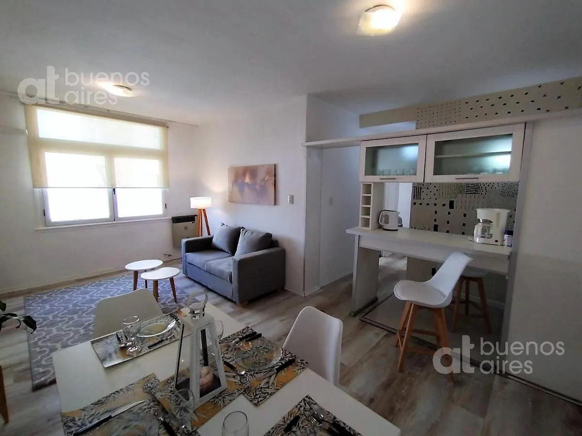 Departamento de 3 ambientes al frente, con enormes ventanas. Living comedor con pisos vinílicos. La unidad tiene 3 aires acondicionado y carpintería de aluminio con doble vidrio. Dormitorio principal con 2 camas individuales que pueden unirse y amplio placard; segundo dormitorio con cama tipo carrito. Cocina con barra desayunadora y lavarropas; baño completo. Disponible a partir del 15/4/2026. El valor publicado incluye expensas y servicios (luz, gas y agua); incluye internet y ABL.