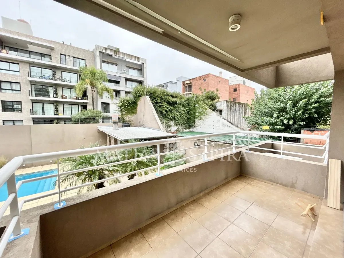 Departamento de 3 ambientes en Castelar Norte. Cuenta con living-comedor con salida a balcón con vista abierta a la piscina, cocina semi integrada con barra desayunadora y 2 dormitorios. Dispone de 2 baños completos, uno en suite con vestidor, y cochera cubierta. El edificio tiene piscina y parrilla, y cuenta con laundry. Requiere comprobantes de ingresos y seguro de caución o garantía propietaria.