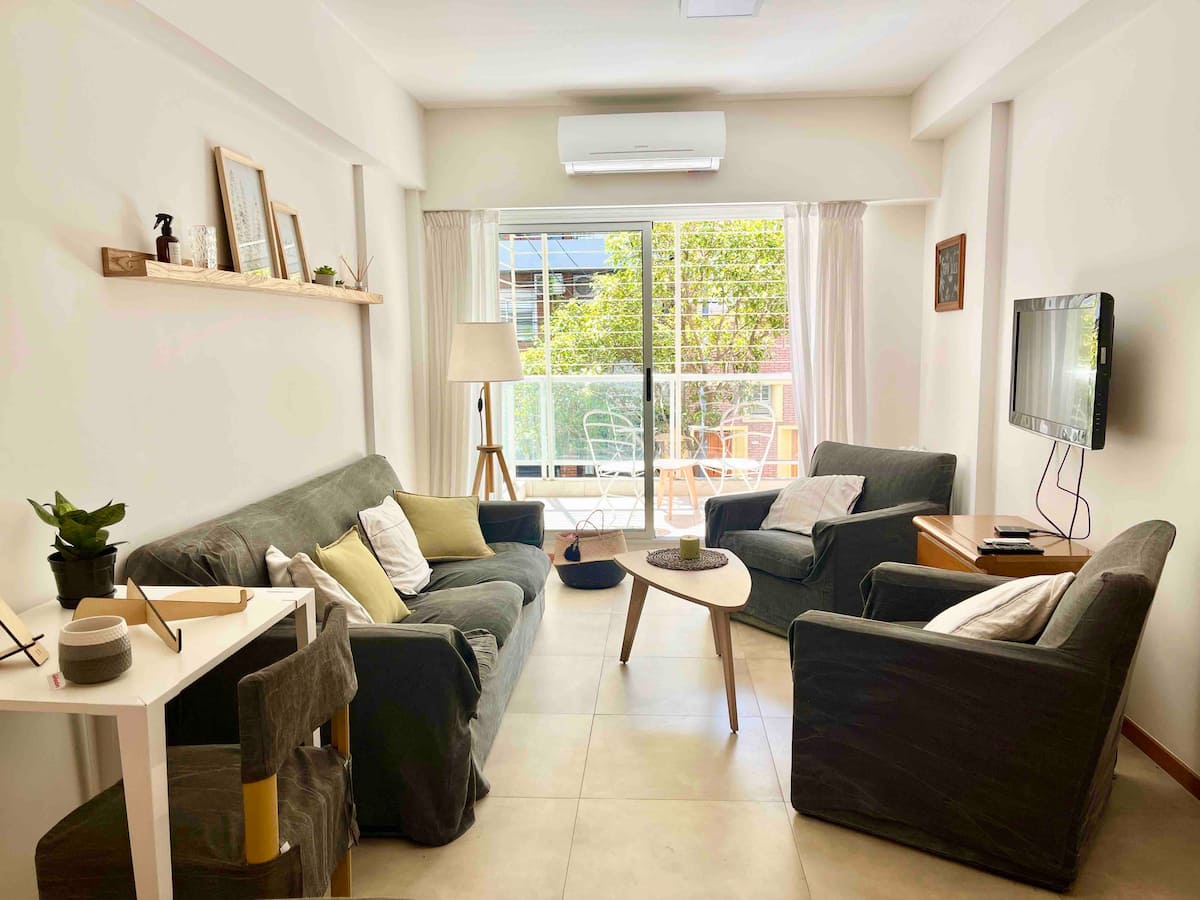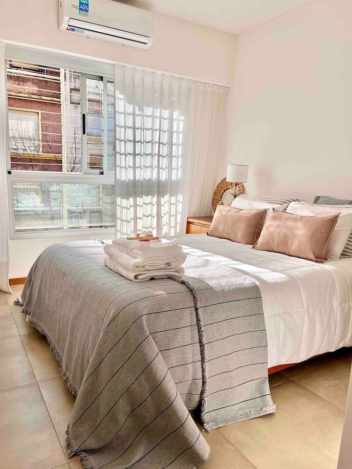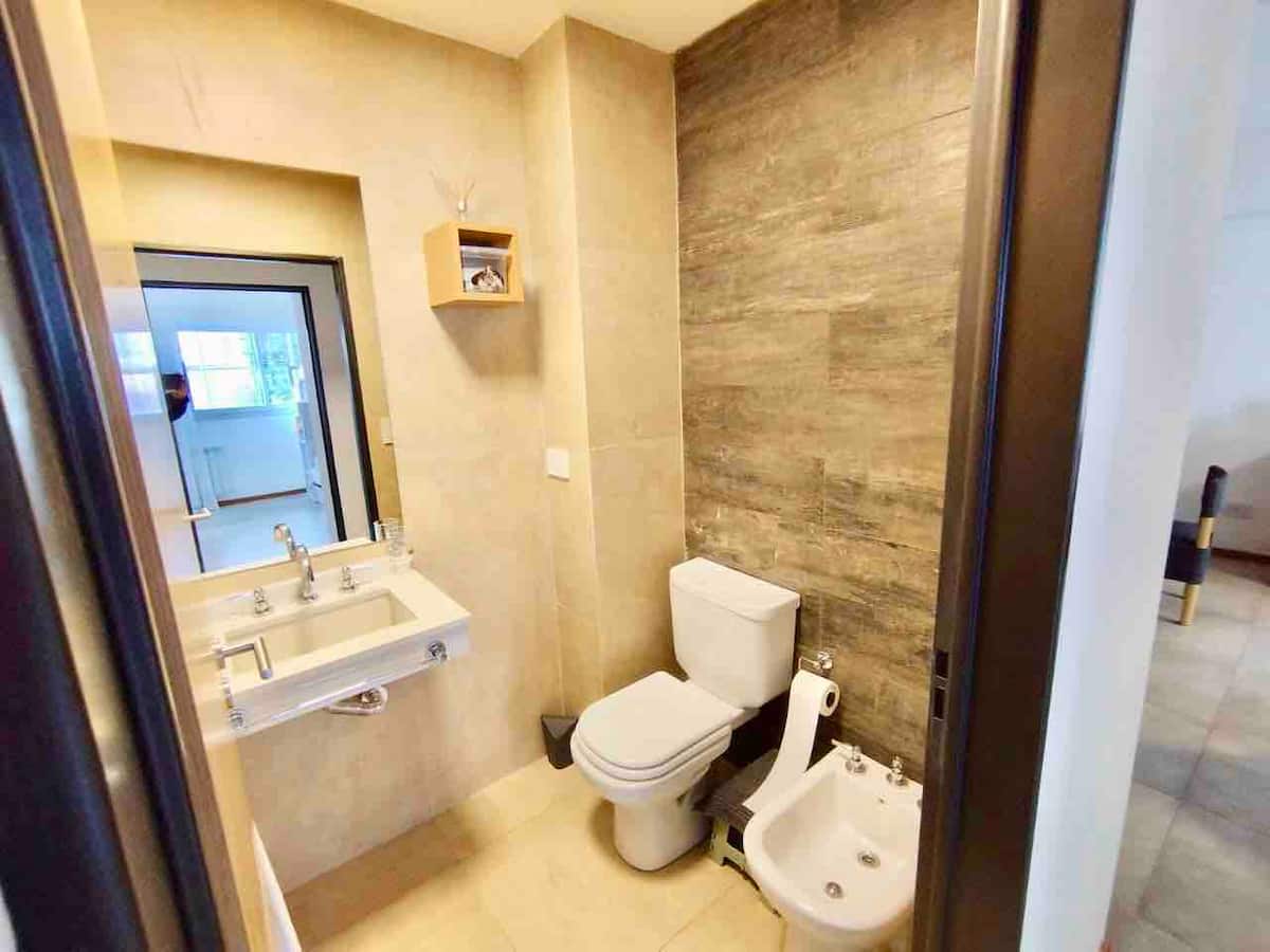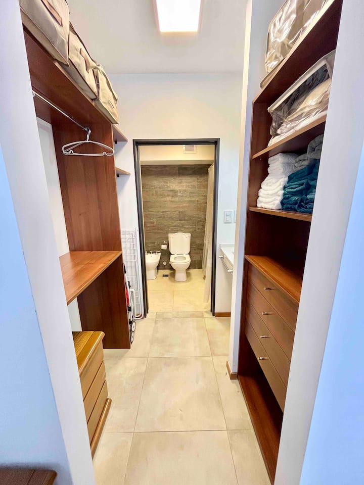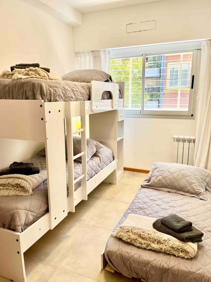Departamento de 3 ambientes en Parque Chacabuco, con cocina integrada, comedor y living. Tiene 2 dormitorios: el principal con cama doble, vestidor y baño en suite completo; el segundo con cama cucheta de 3 plazas. Incluye 2 baños completos y balcón.