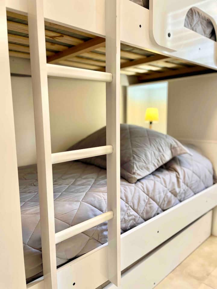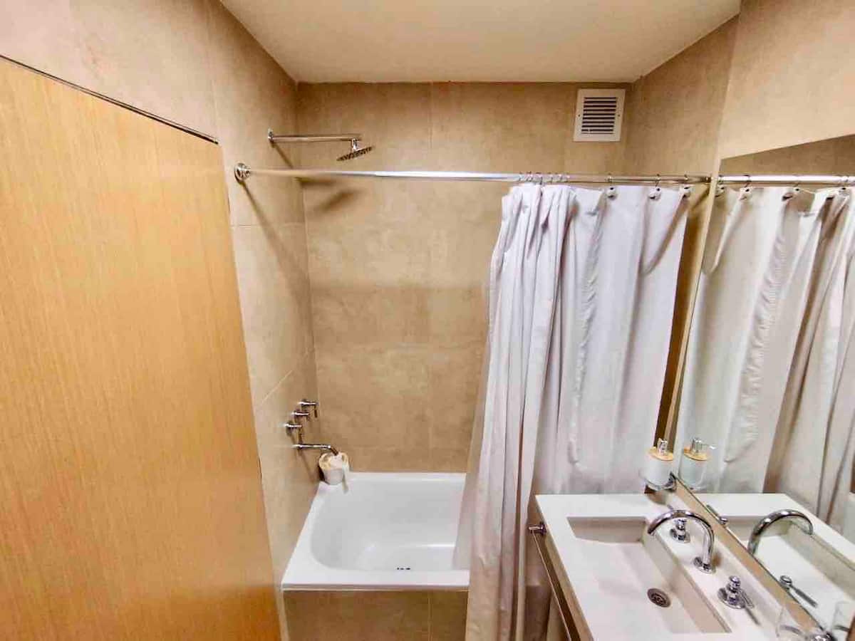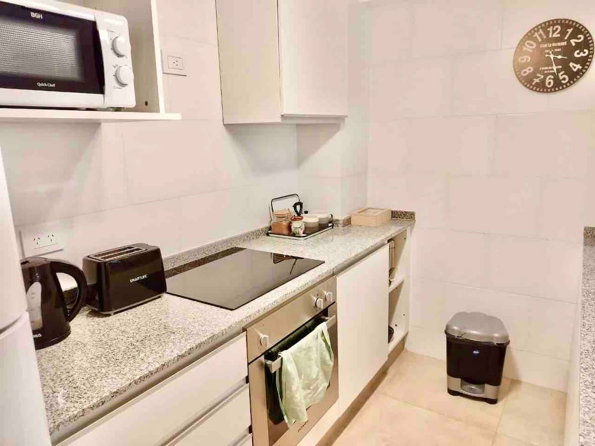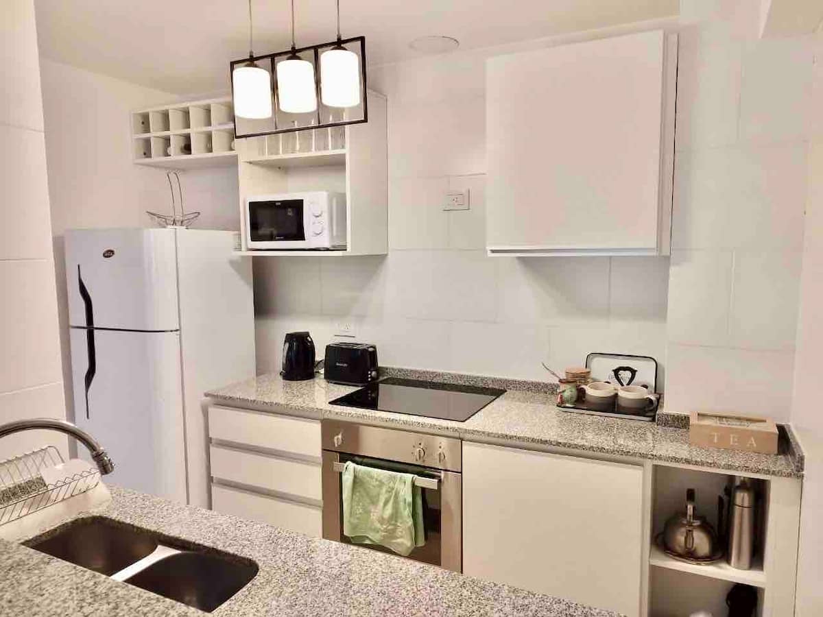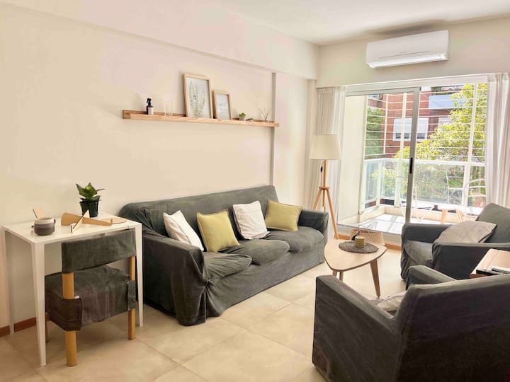 Departamento de 3 ambientes en Parque Chacabuco, con cocina integrada, comedor y living. Tiene 2 dormitorios: el principal con cama doble, vestidor y baño en suite completo; el segundo con cama cucheta de 3 plazas. Incluye 2 baños completos y balcón.