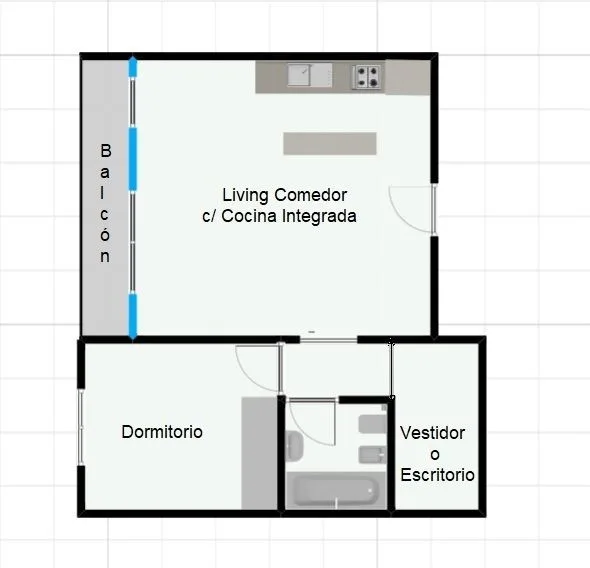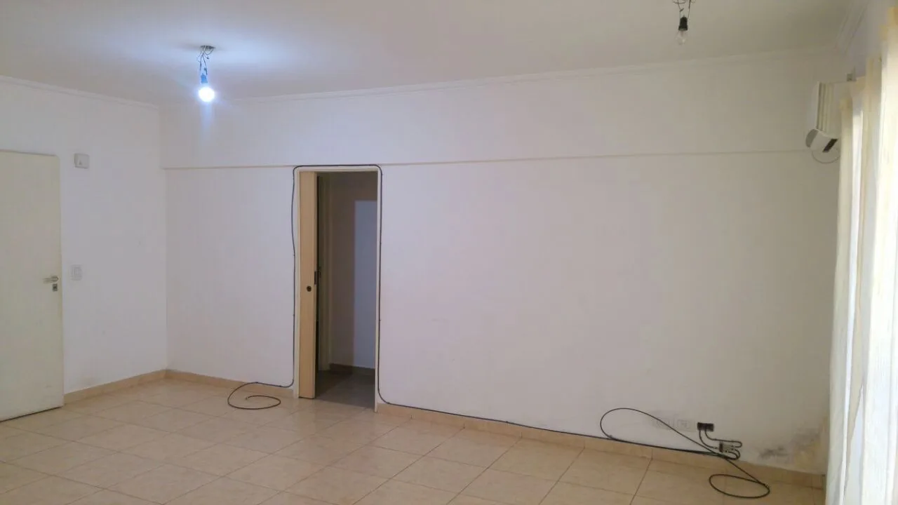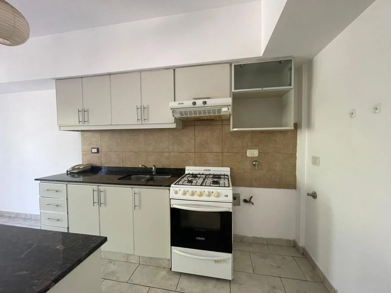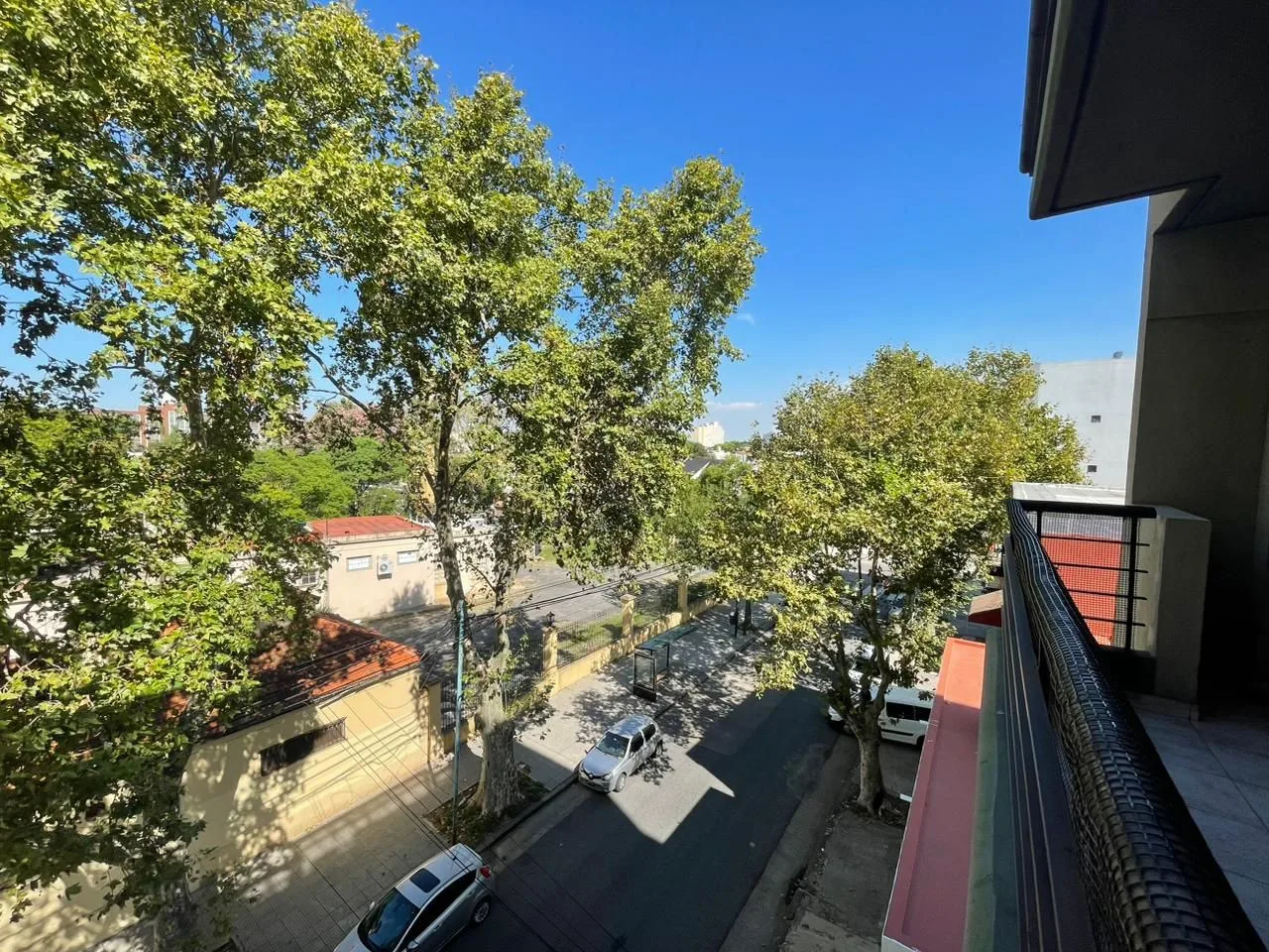 Departamento de 2 ambientes con escritorio o vestidor, al frente, en 3er piso. 62 m² de superficie total (56,50 m² cubiertos y 5,50 m² de balcón). Living-comedor con salida al balcón, cocina integrada con horno a gas y barra desayunadora, dormitorio principal de 3x3 con placard, persiana y aire acondicionado frío/calor, y segundo dormitorio pequeño de 2x2 que puede usarse como escritorio o vestidor. Baño completo con ventilación natural. Apto mascotas y posibilidad de alquiler de cochera. Cercan