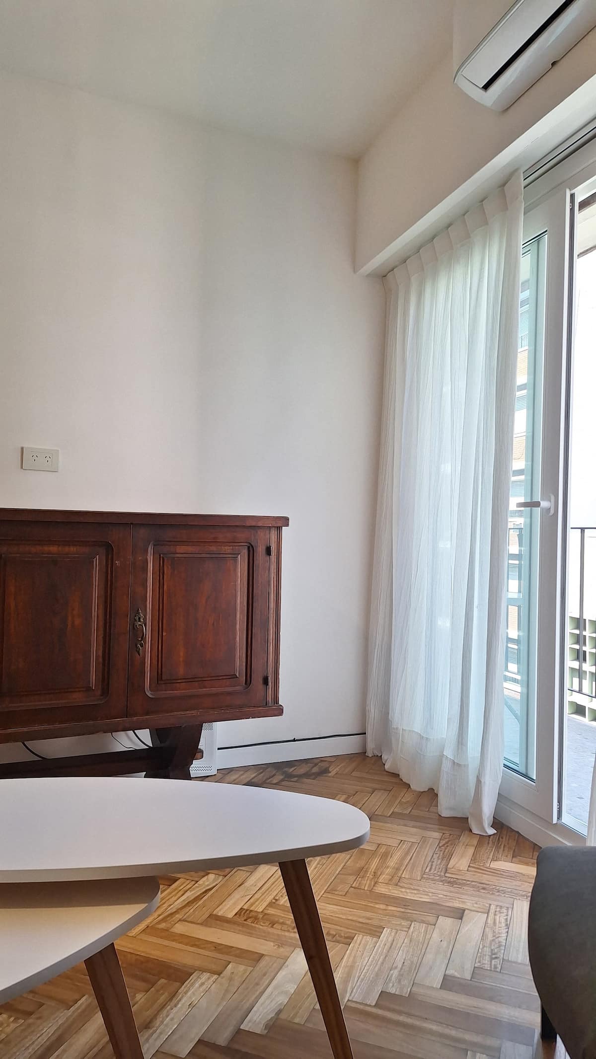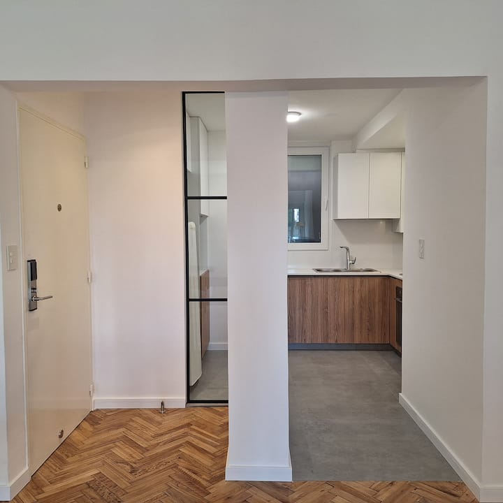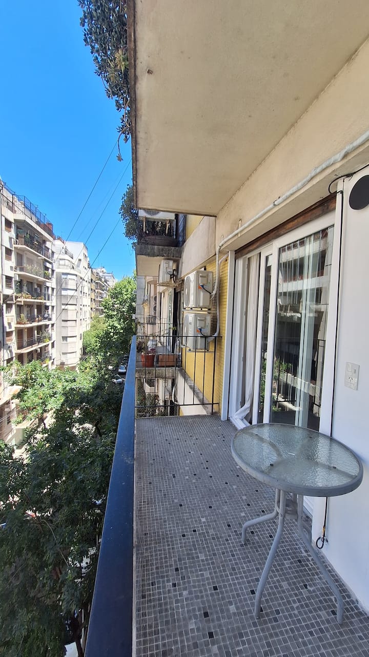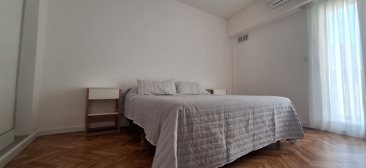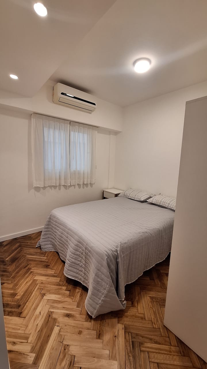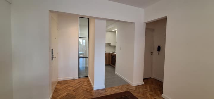 Departamento en Recoleta con 2 dormitorios, recientemente reciclado y remodelado en diciembre de 2024. Cuenta con pisos de madera restaurados y aberturas de aluminio con doble vidriado para aislamiento térmico y acústico, con persianas de madera motorizadas en cada ventana y cerradura digital en la puerta de ingreso. Dispone de 3 equipos de aire acondicionado tipo mini-split frío/calor, uno en cada dormitorio y uno en el living. El balcón tiene acceso desde el living y desde el dormitorio princi