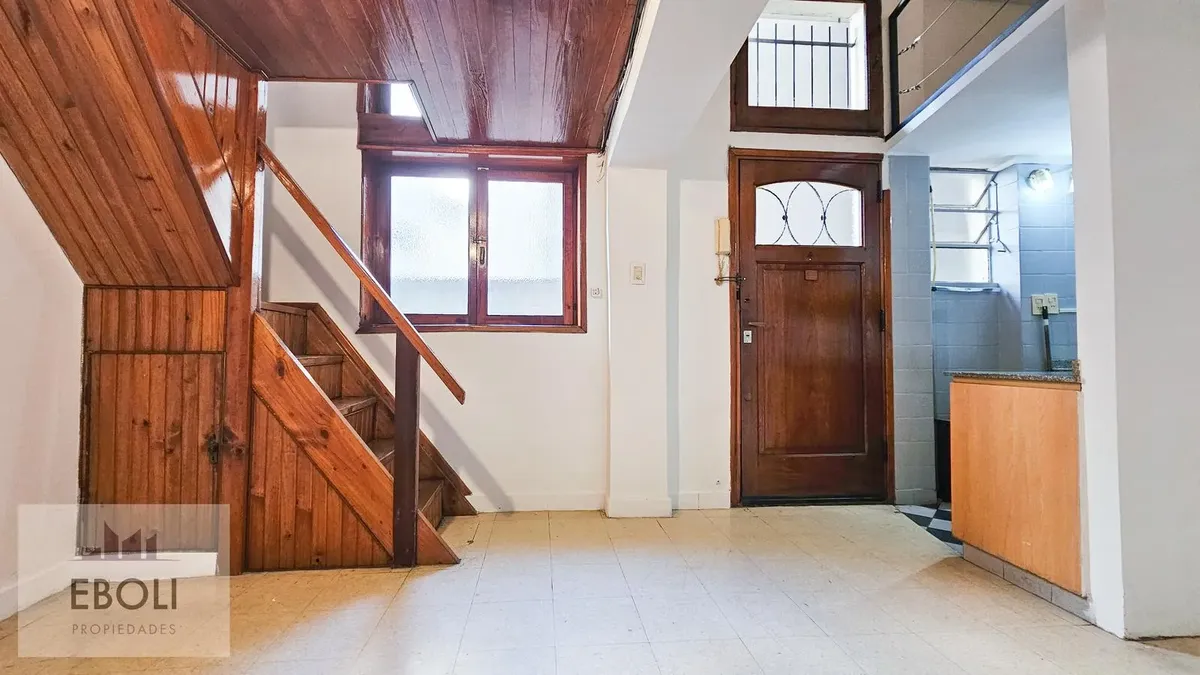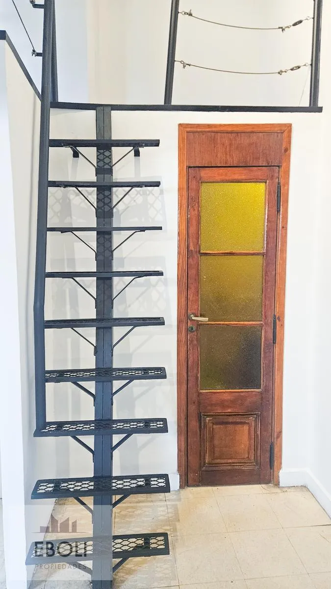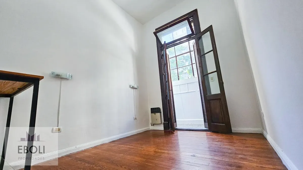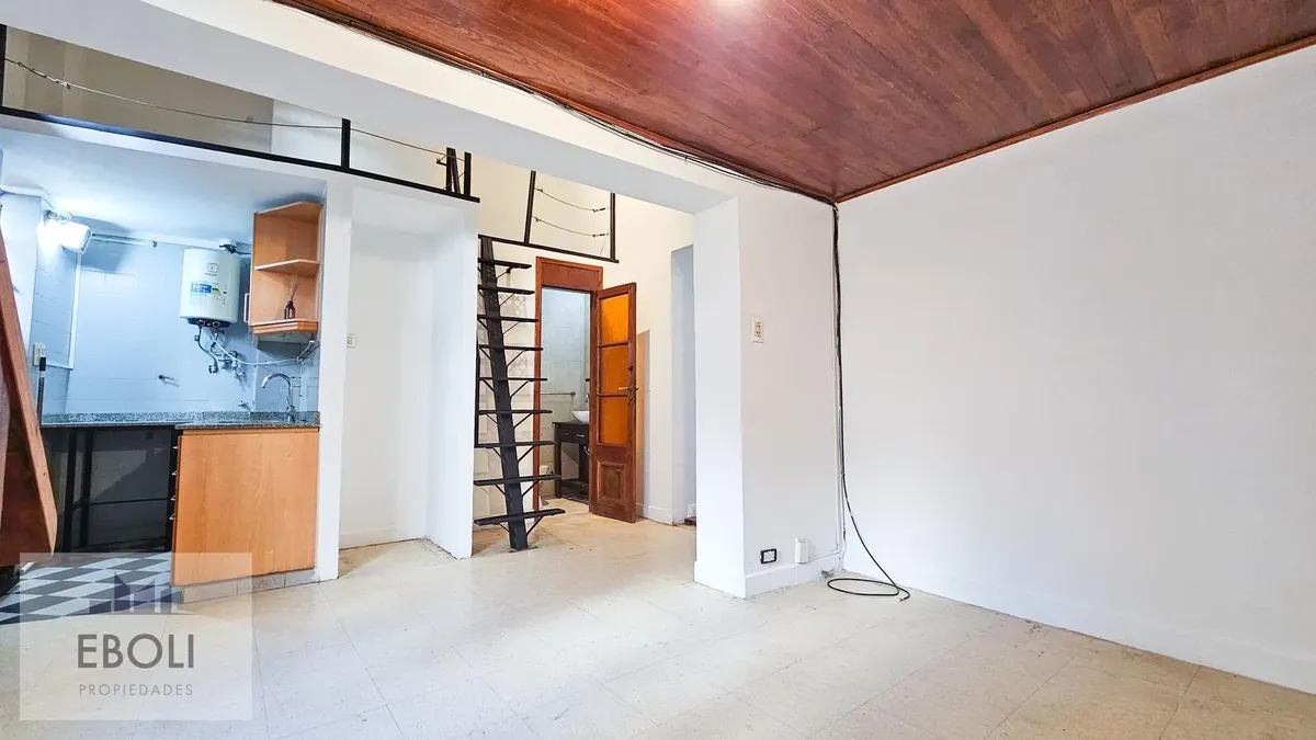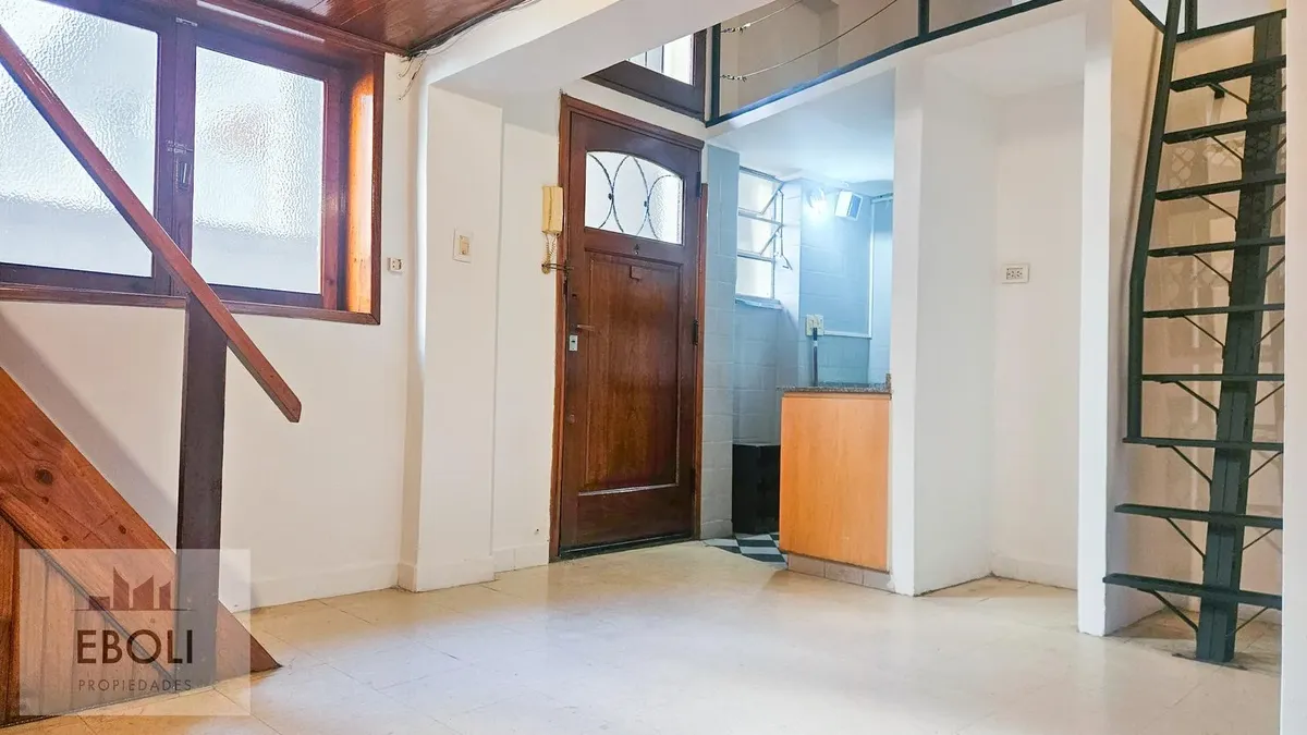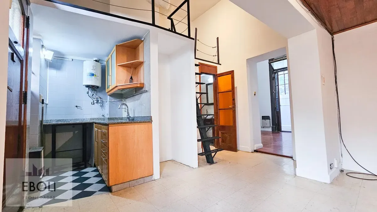 Departamento de 3 ambientes en Recoleta, en el 1er piso, unidad 1L, sobre calle Juncal al 1900. Cuenta con ascensor. Cocina integrada, living con escalera de metal y baño; un entrepiso que puede usarse como escritorio. La habitación principal se ubica al fondo y da a un patio con instalación de lavarropas y tender con poleas, con vista a un pulmón verde; la segunda habitación en entrepiso tiene aire acondicionado. Se renovaron cañerías de baño y cocina en 2017 y ese mismo año se actualizó el bañ