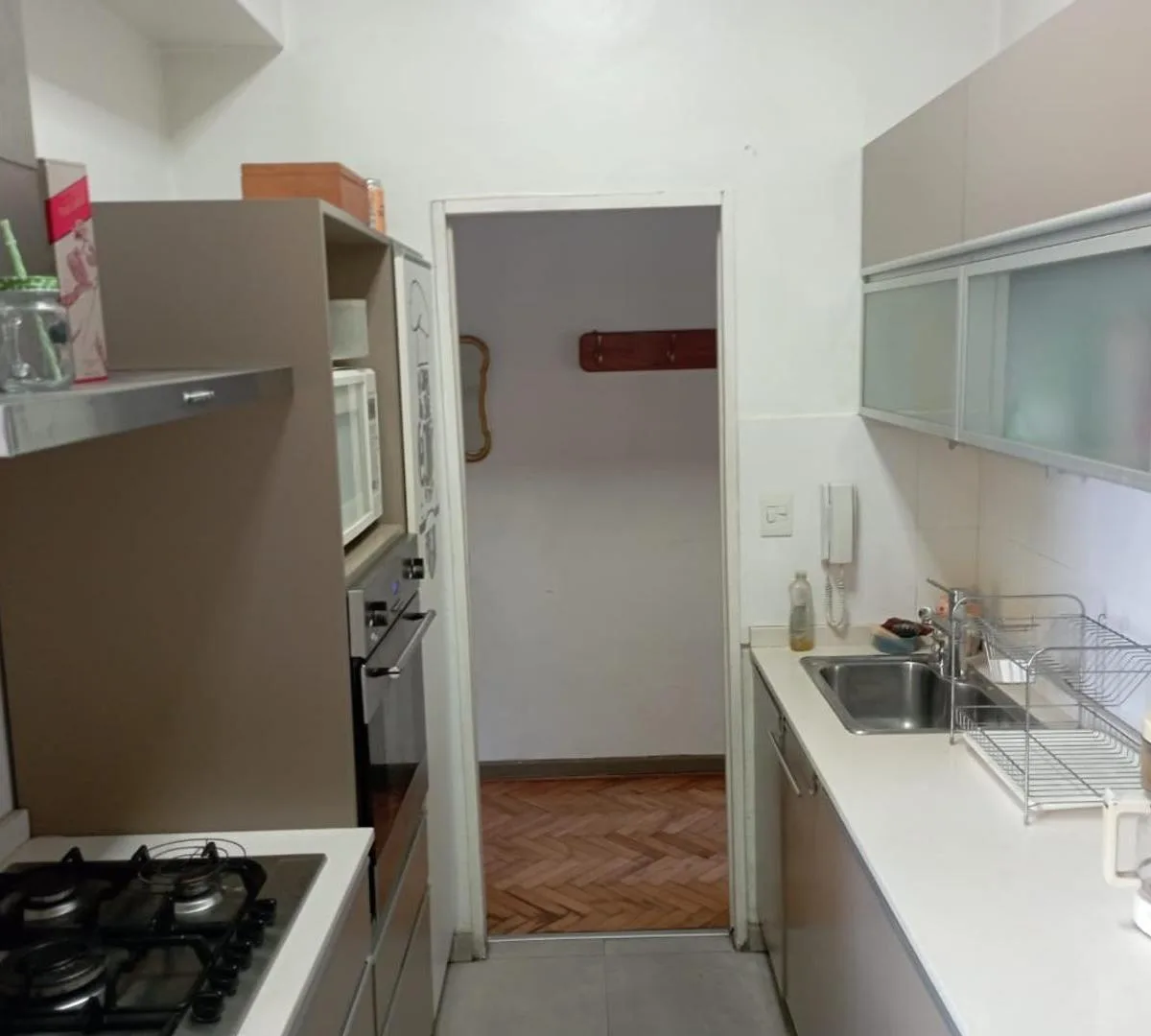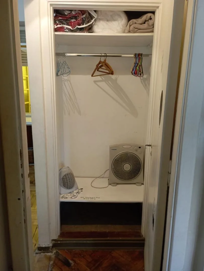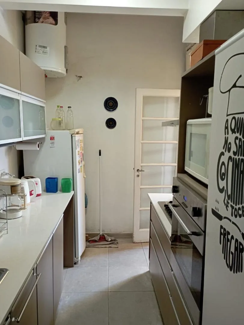 Departamento de 3 ambientes y medio (espacio estudio) en Buenos Aires, con balcón al frente. Cuenta con living comedor, cocina equipada con 5 hornallas, horno, microondas, heladera, freezer y cafetera, y sector lavadero con lavarropas y tender. Dispone de dormitorio principal con cama matrimonial, 2 placards y maquillador, segundo dormitorio con cama individual, escritorio y placard, más sector estudio con escritorio largo y mueble organizador. Incluye 1 baño completo con ducha y 1 toilette, air