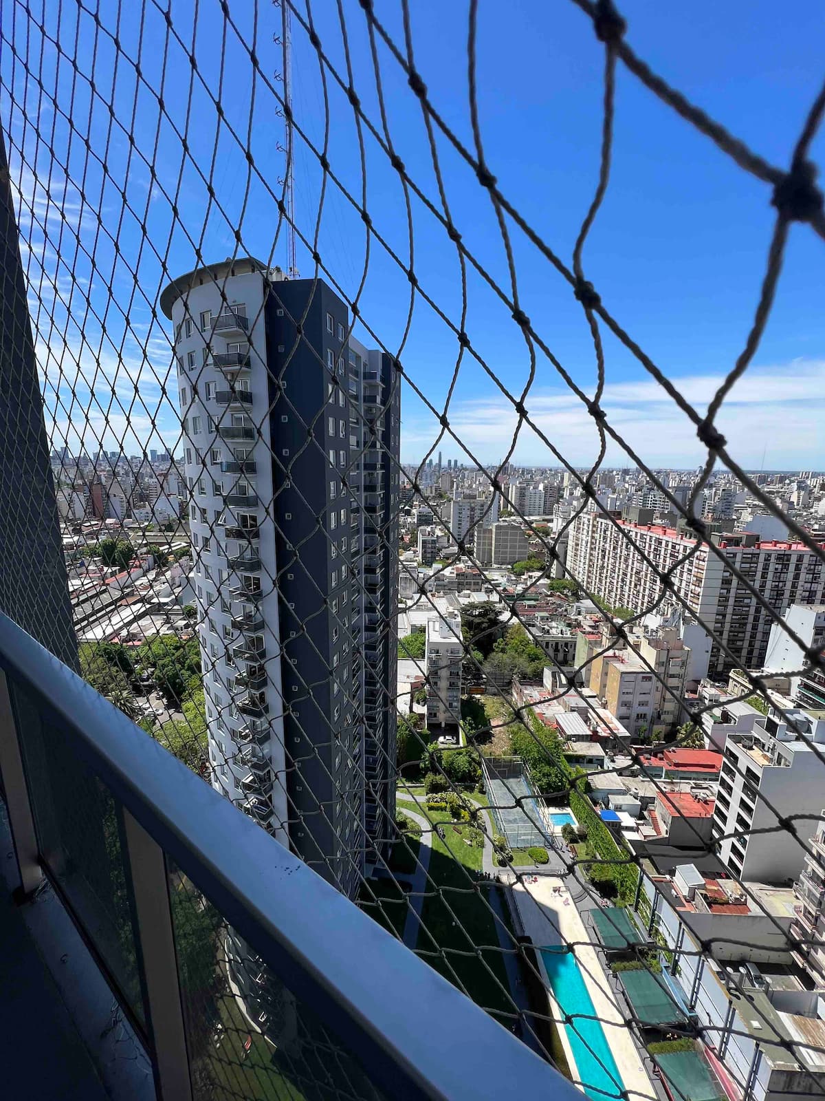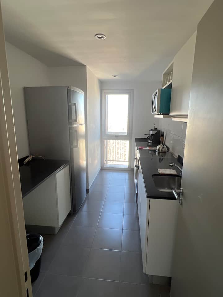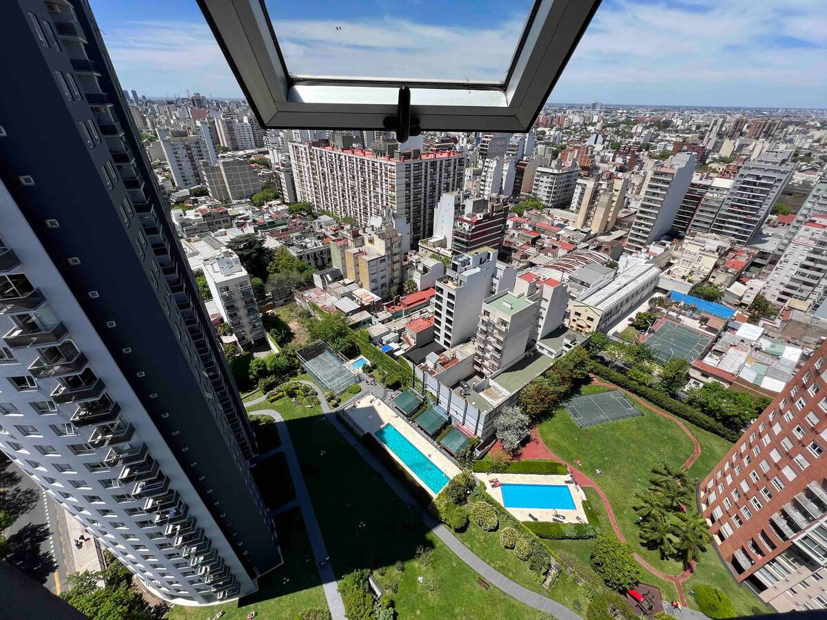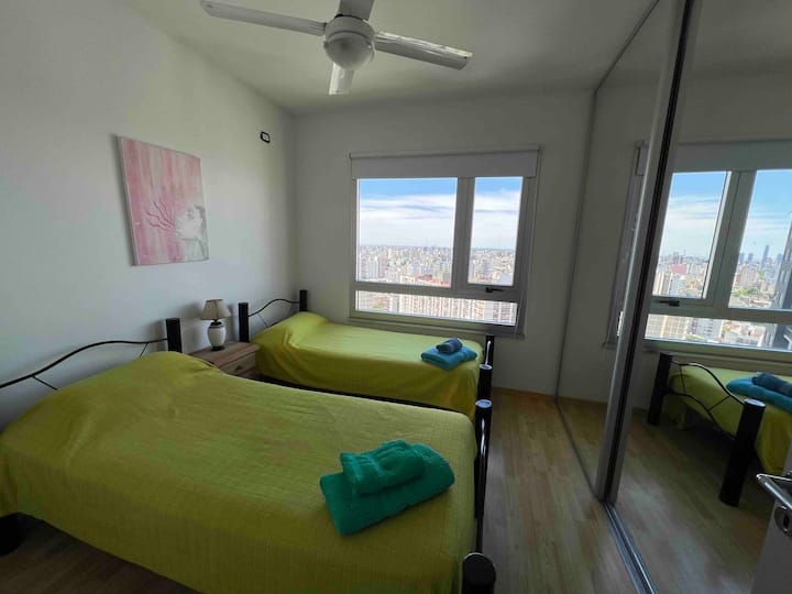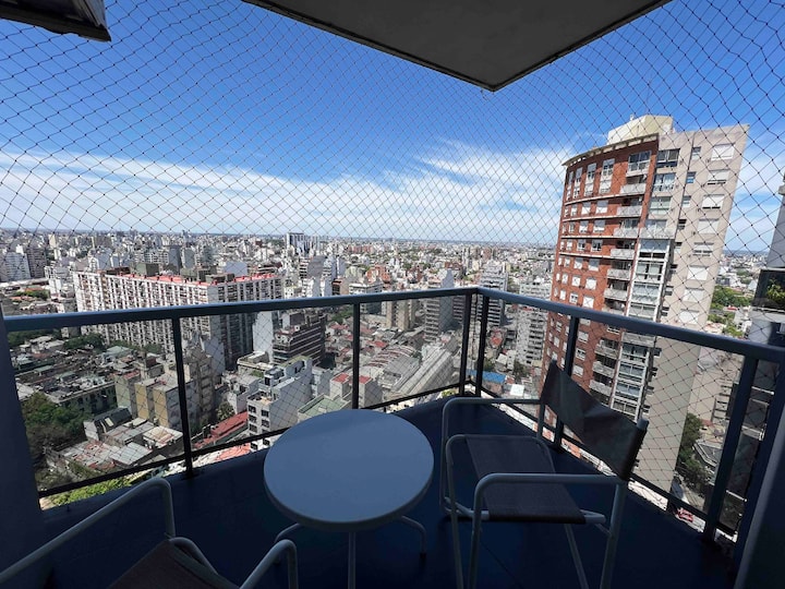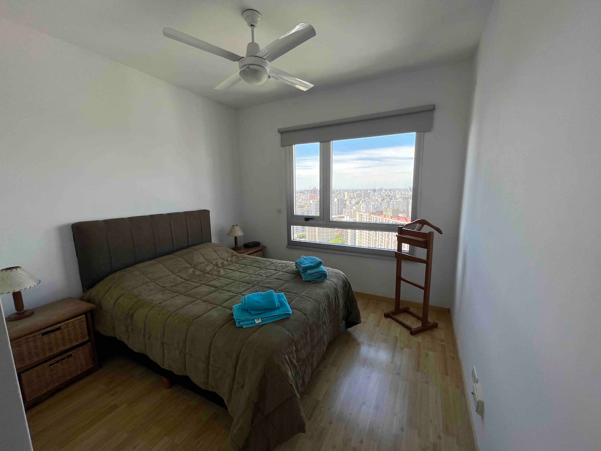 Departamento de 3 ambientes en el 23° piso, con vista panorámica. Cuenta con 1 dormitorio en suite y 1 dormitorio con baño con ducha, cocina completa y living con balcón y TV de 55”. El edificio tiene parque de 7500 m², pileta, parrilla, gimnasio y laundry, con seguridad las 24 horas.
