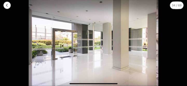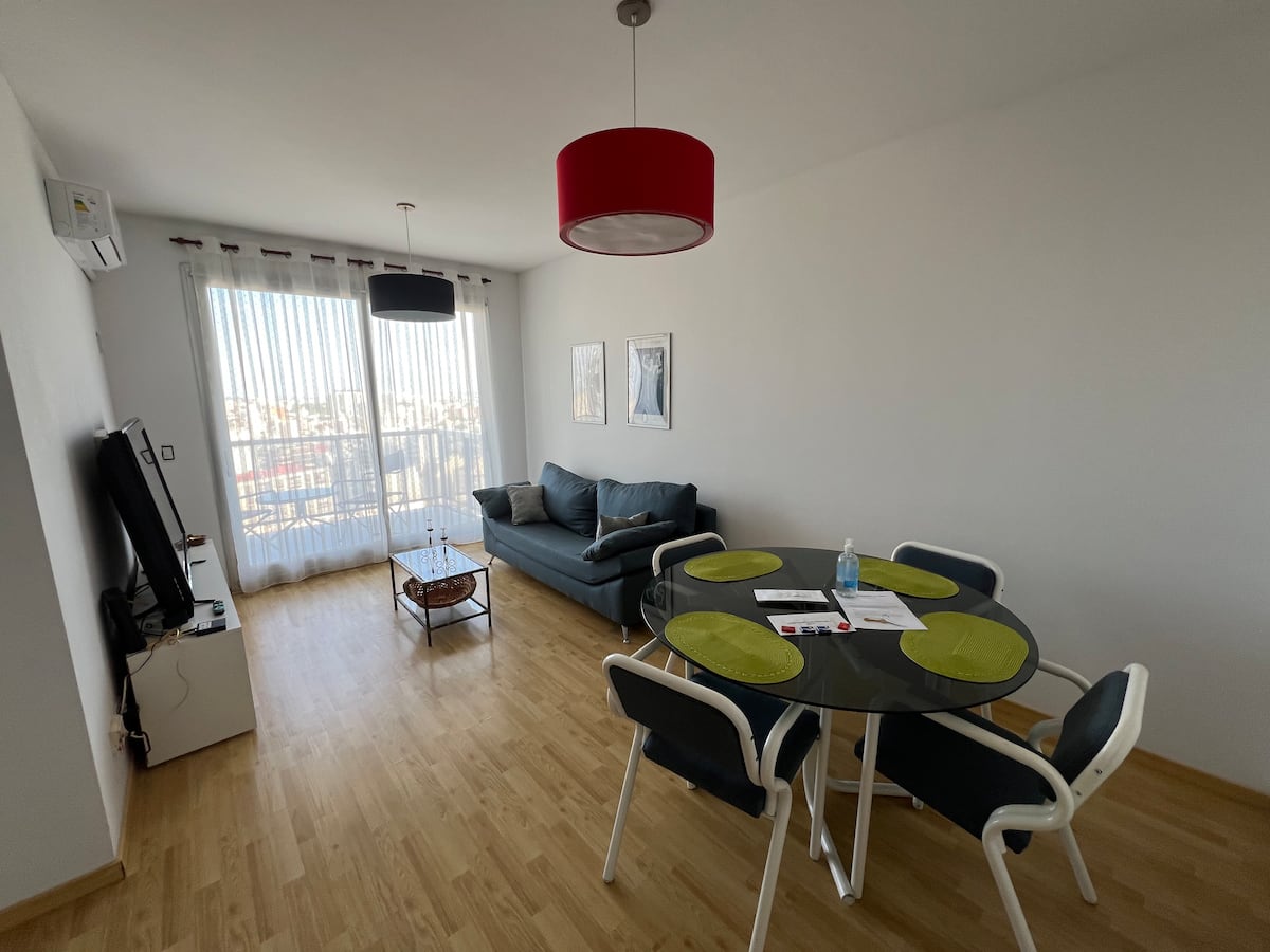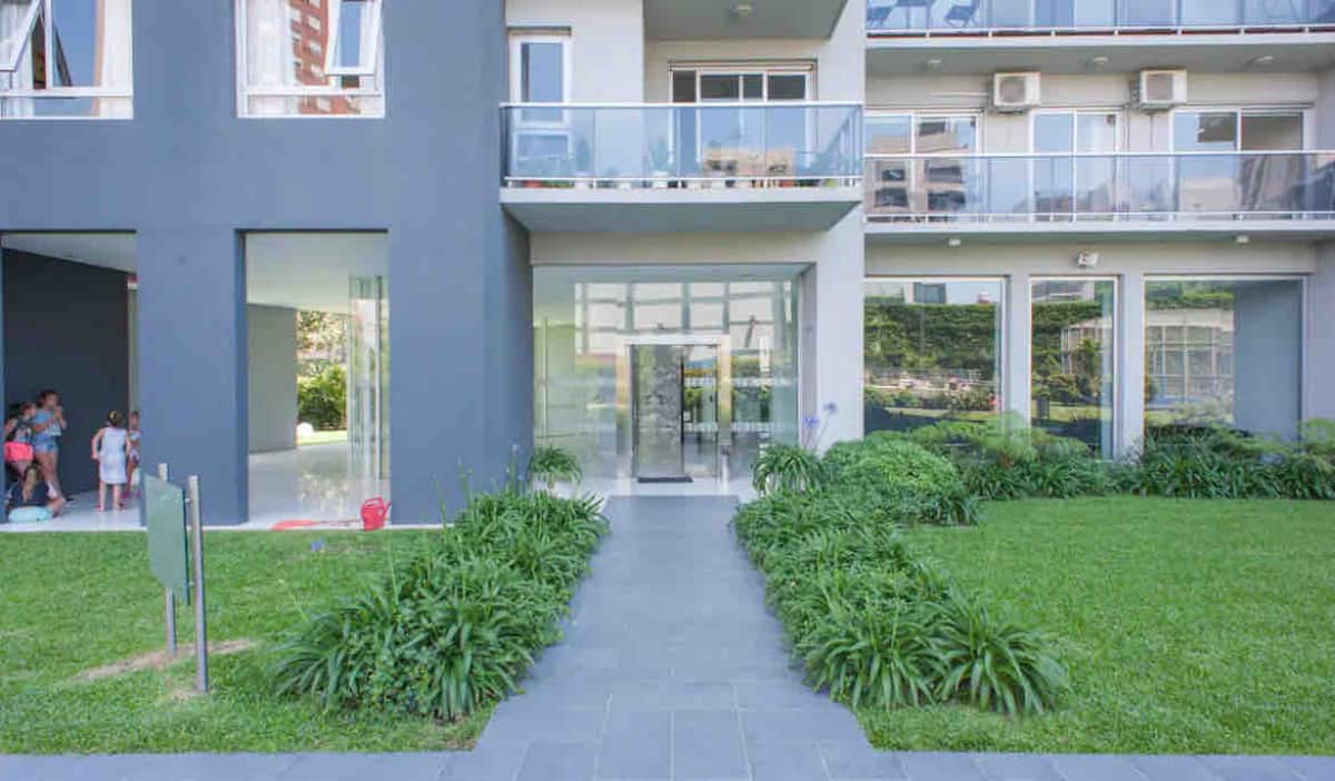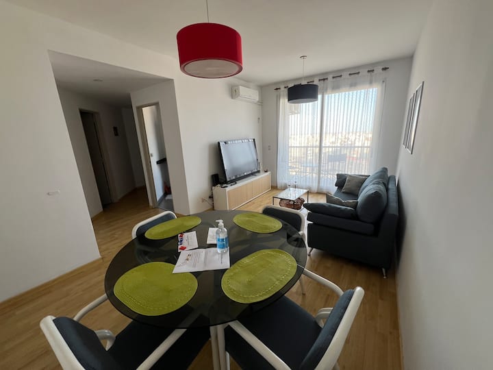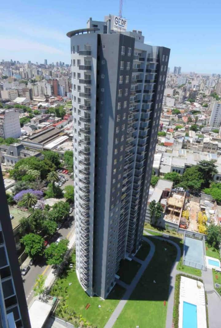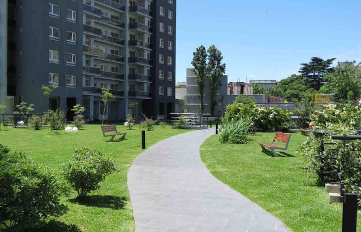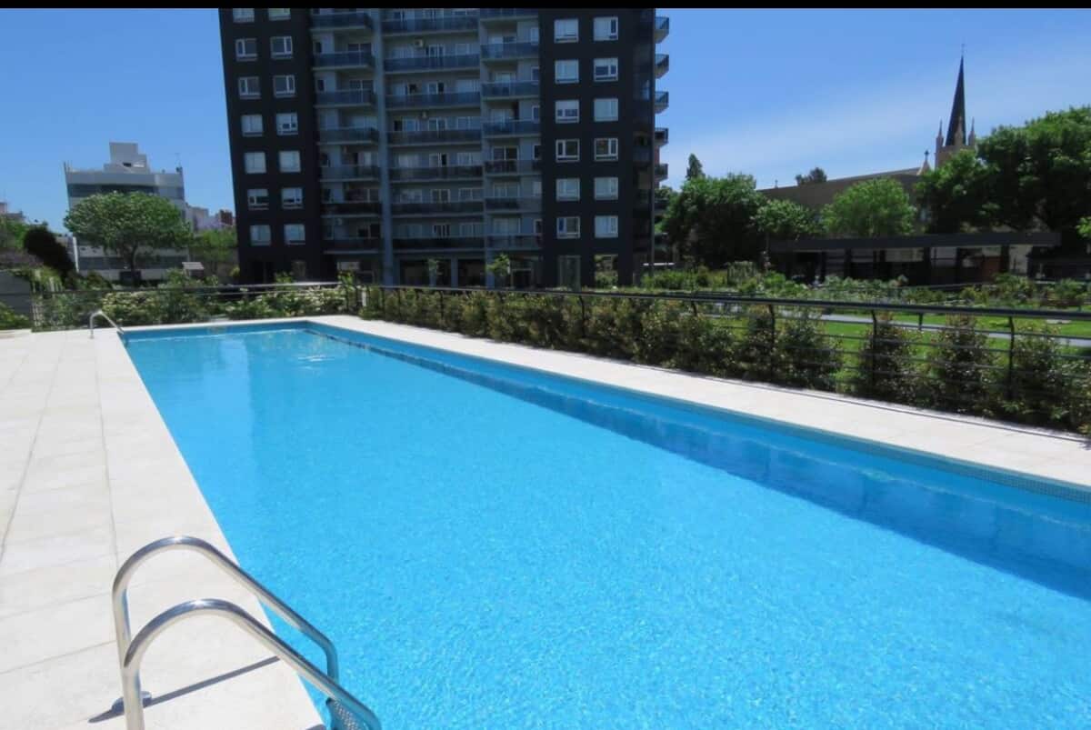 Departamento de 3 ambientes en el 23° piso, con vista panorámica. Cuenta con 1 dormitorio en suite y 1 dormitorio con baño con ducha, cocina completa y living con balcón y TV de 55”. El edificio tiene parque de 7500 m², pileta, parrilla, gimnasio y laundry, con seguridad las 24 horas.