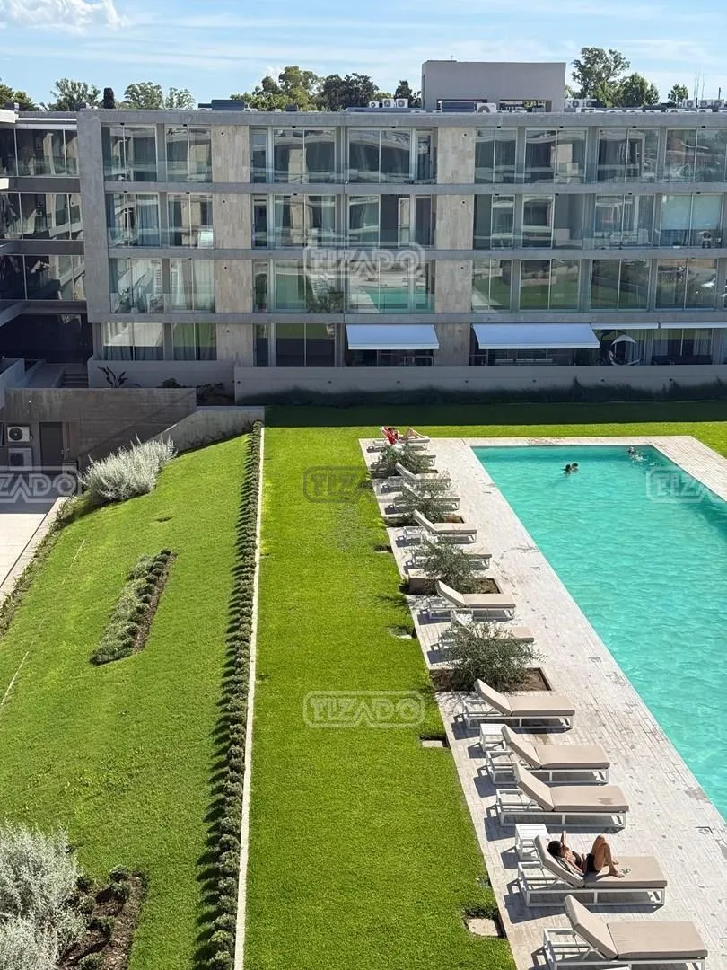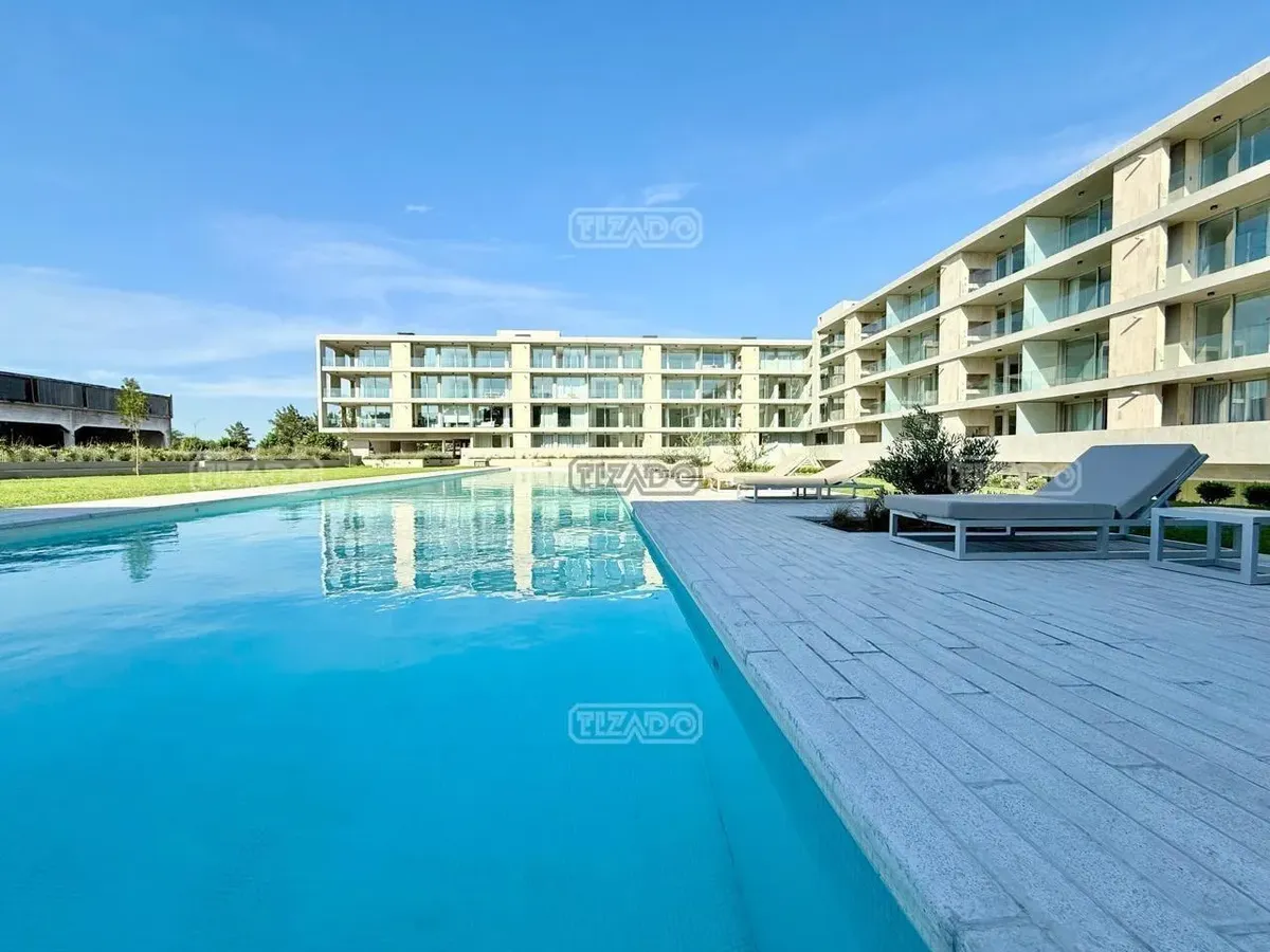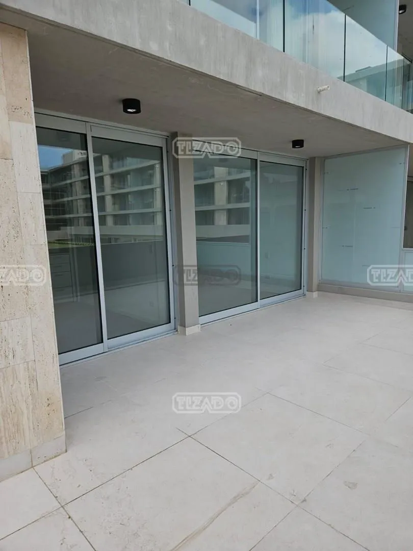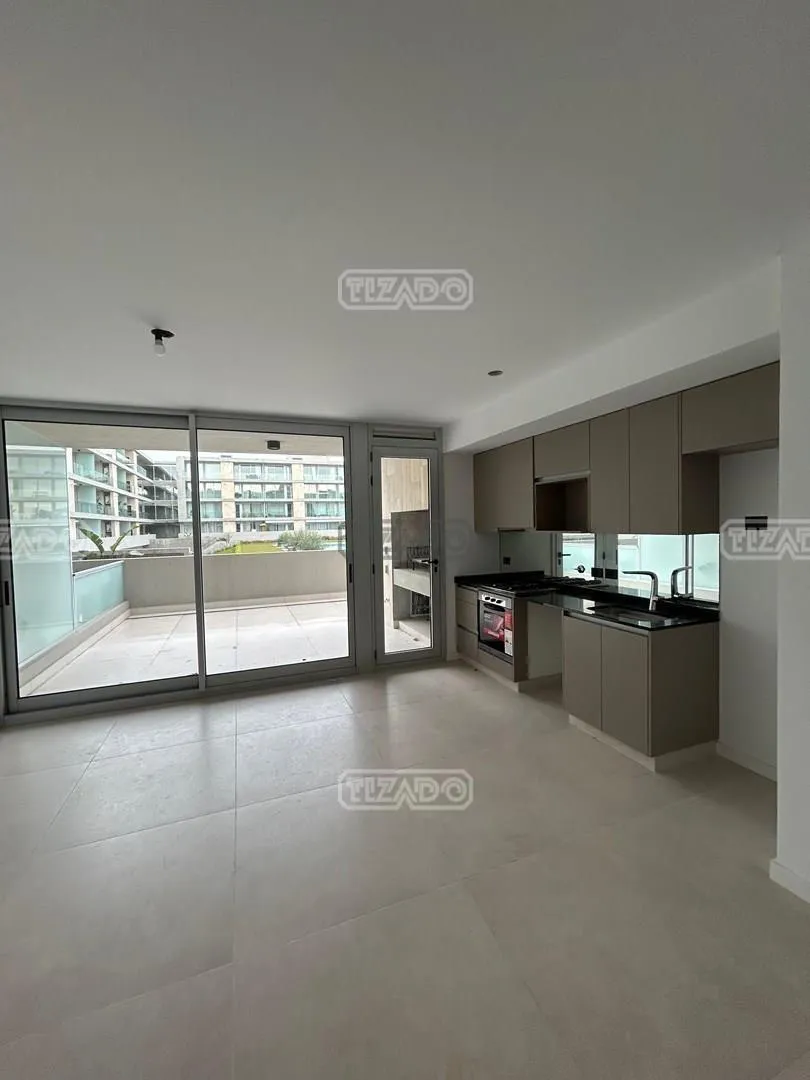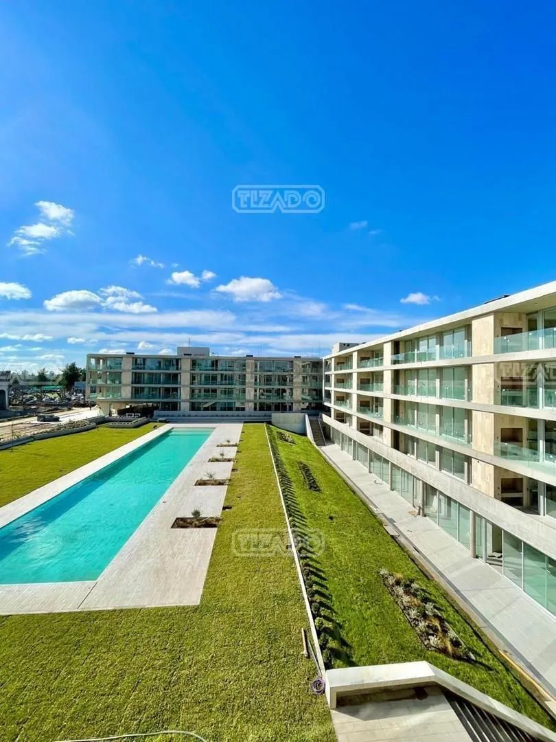 Departamento de 3 ambientes a estrenar con terraza privada de casi 100 m², de 10,90 m de ancho por 9 m de largo, con vista abierta al parque central y a la piscina del complejo. La unidad se desarrolla con living-comedor integrado a la cocina y acceso directo a la terraza, con ventanales de piso a techo. Cuenta con dormitorio principal con placard, baño completo y toilette, y calefacción por losa radiante con caldera dual Baxi. La cocina tiene anafe a gas y horno eléctrico; incluye 2 cocheras.