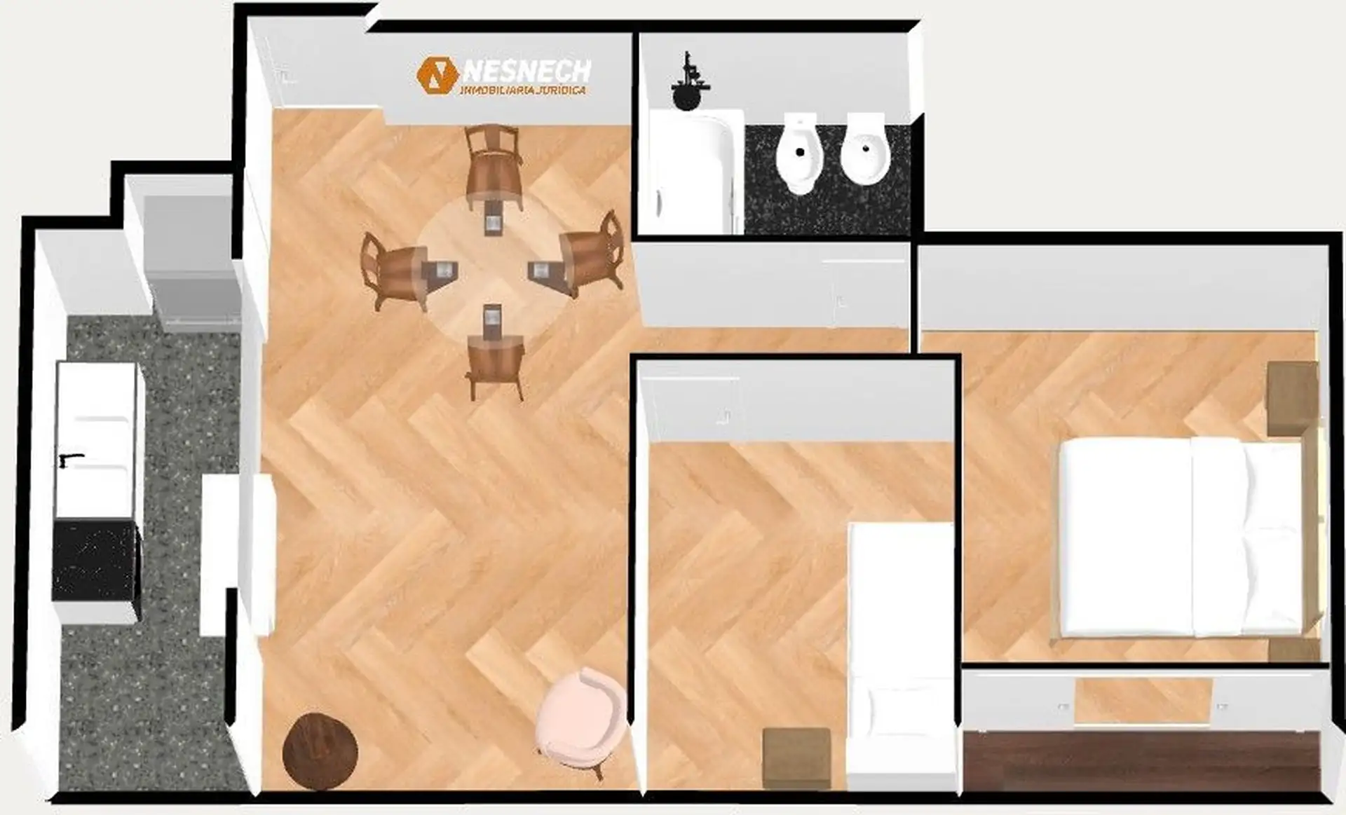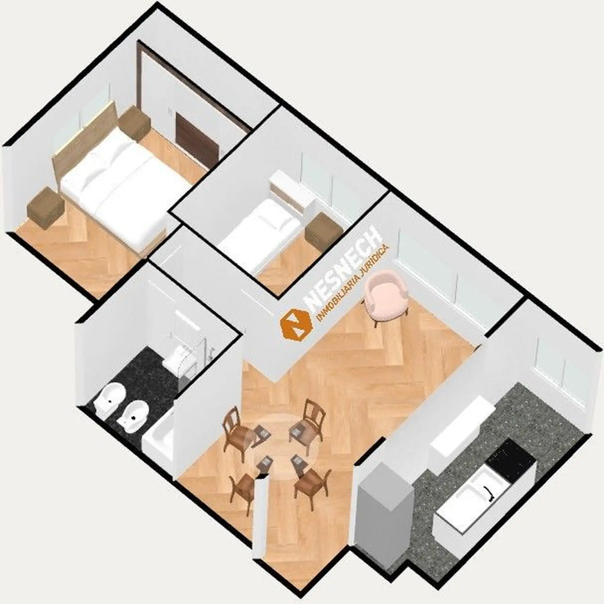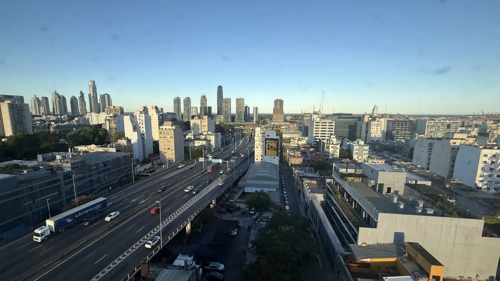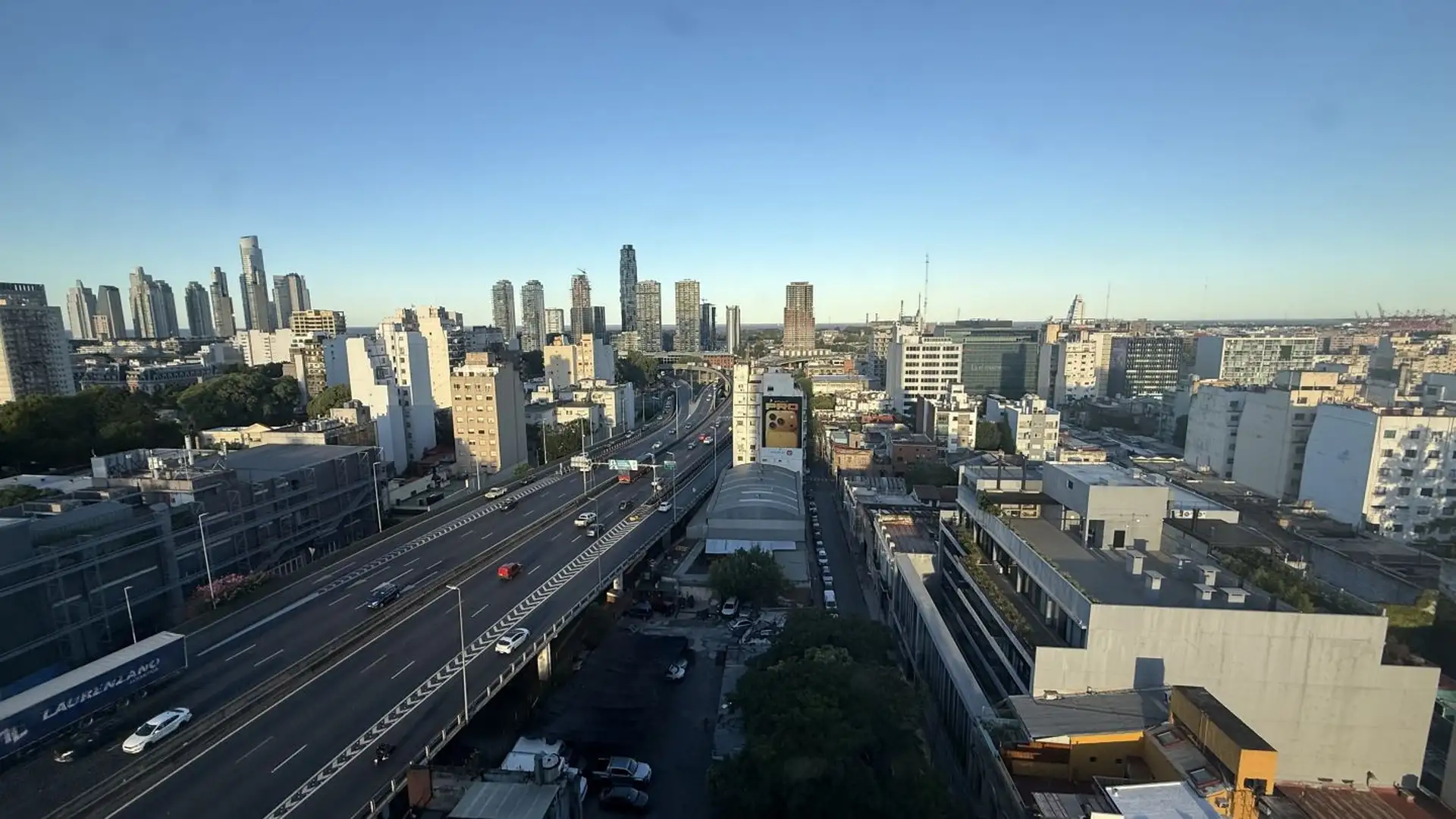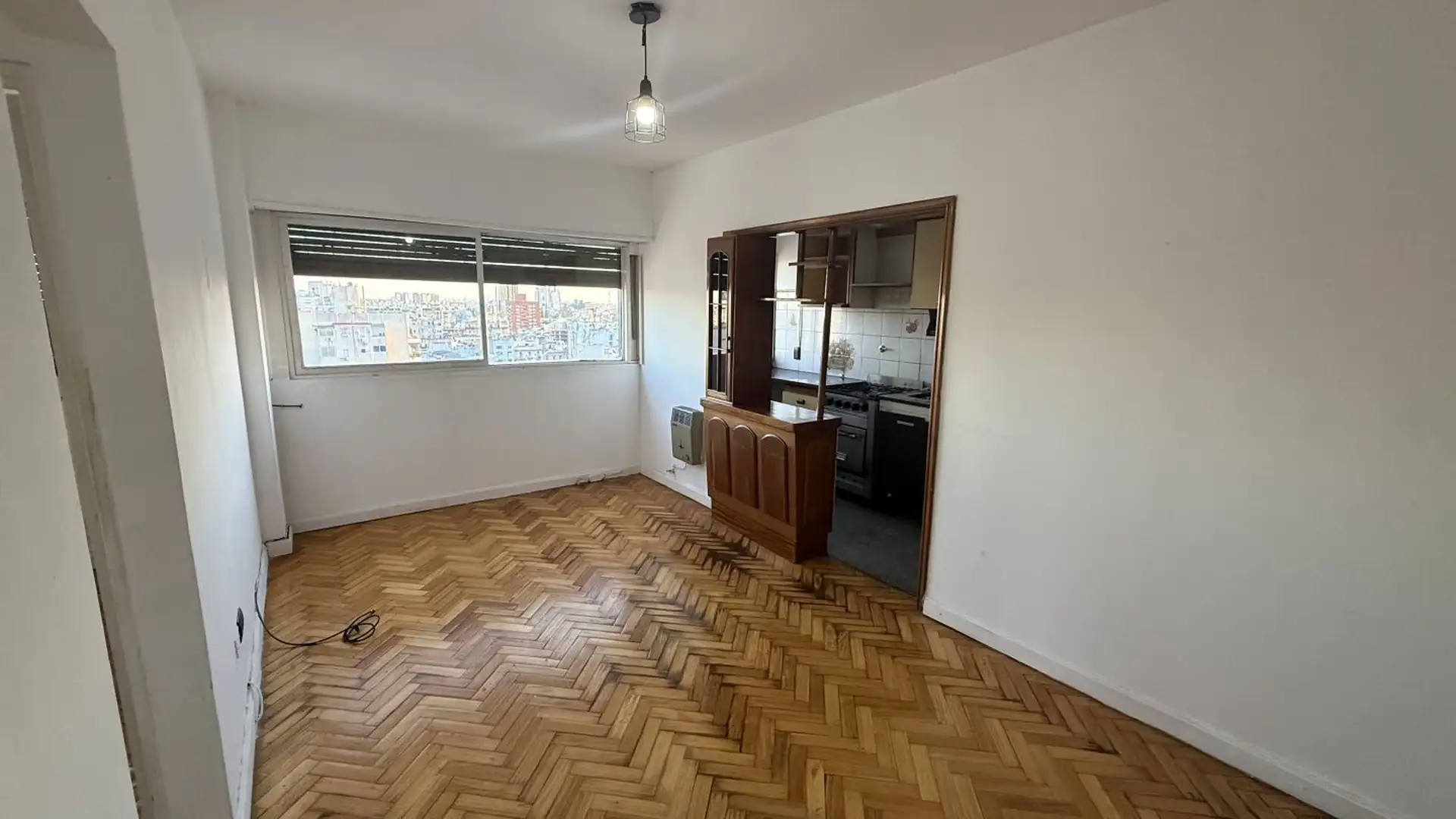 Departamento de 3 ambientes de 43 m² aprox. en el piso 14, con vista panorámica. Cuenta con living-comedor, cocina con desayunador y conexión para lavarropas, baño completo con bañera y 2 habitaciones con placar embutido. El edificio tiene 15 pisos y terraza, con 6 departamentos por piso. La dirección es Cochabamba 411, esquina Defensa; a una cuadra de Av. San Juan.