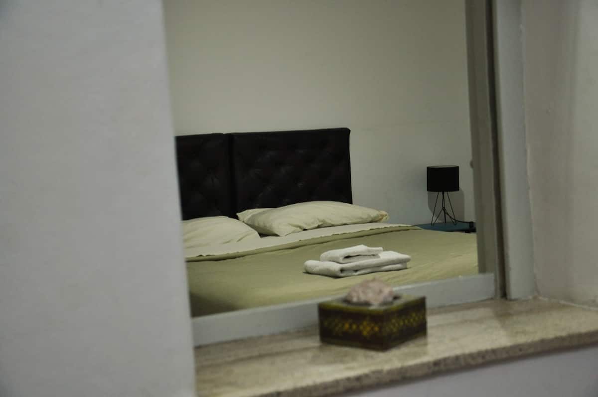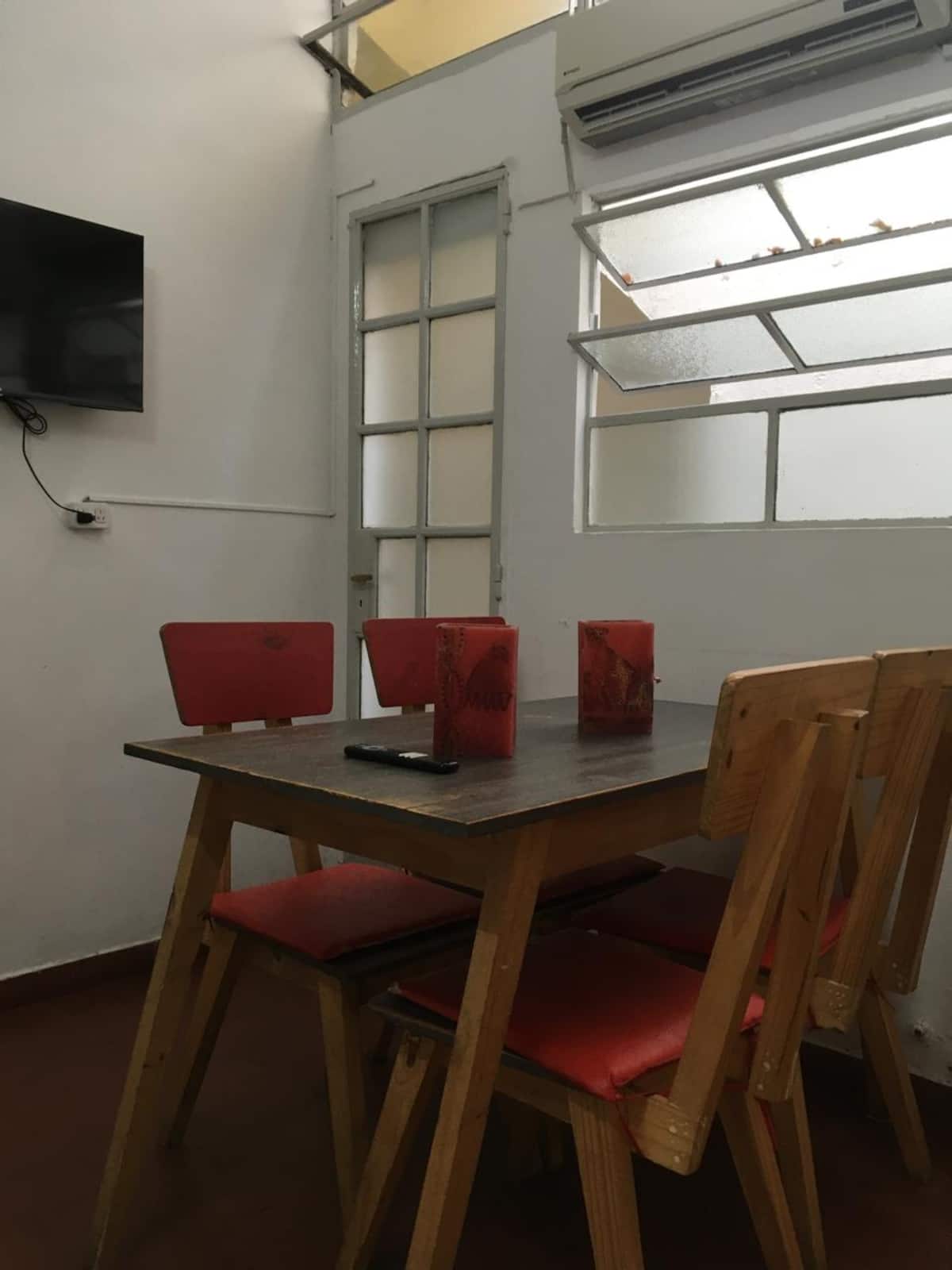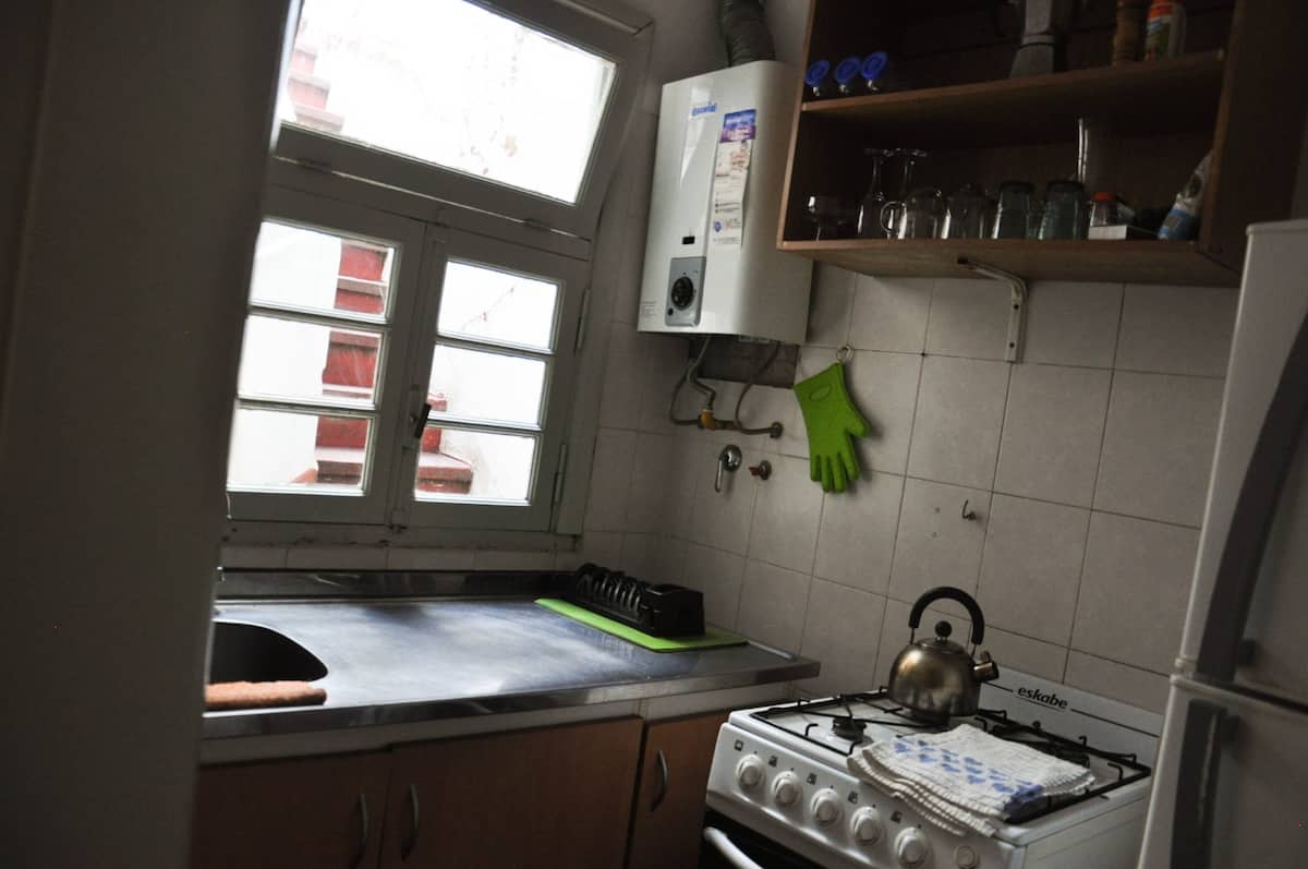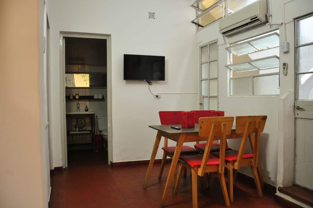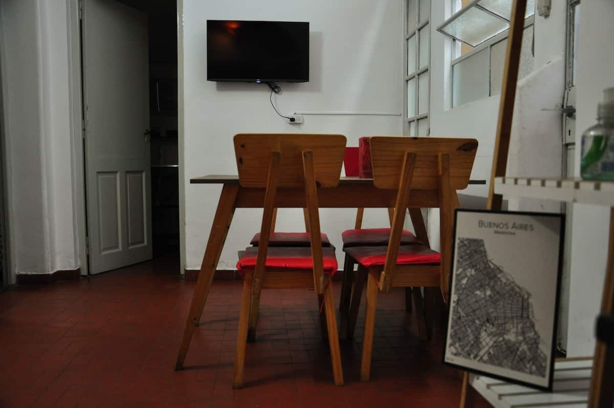 Departamento de 3 ambientes en San Telmo. Cuenta con living con TV por cable, internet y aire acondicionado, cocina equipada con heladera, microondas y vajilla, y 2 dormitorios con placares (una habitación con 2 camas twin y la otra con cama doble o 2 camas twin). Tiene baño completo con bañera, sector de lavadero con lavarropas automático y terraza privada con parrilla.