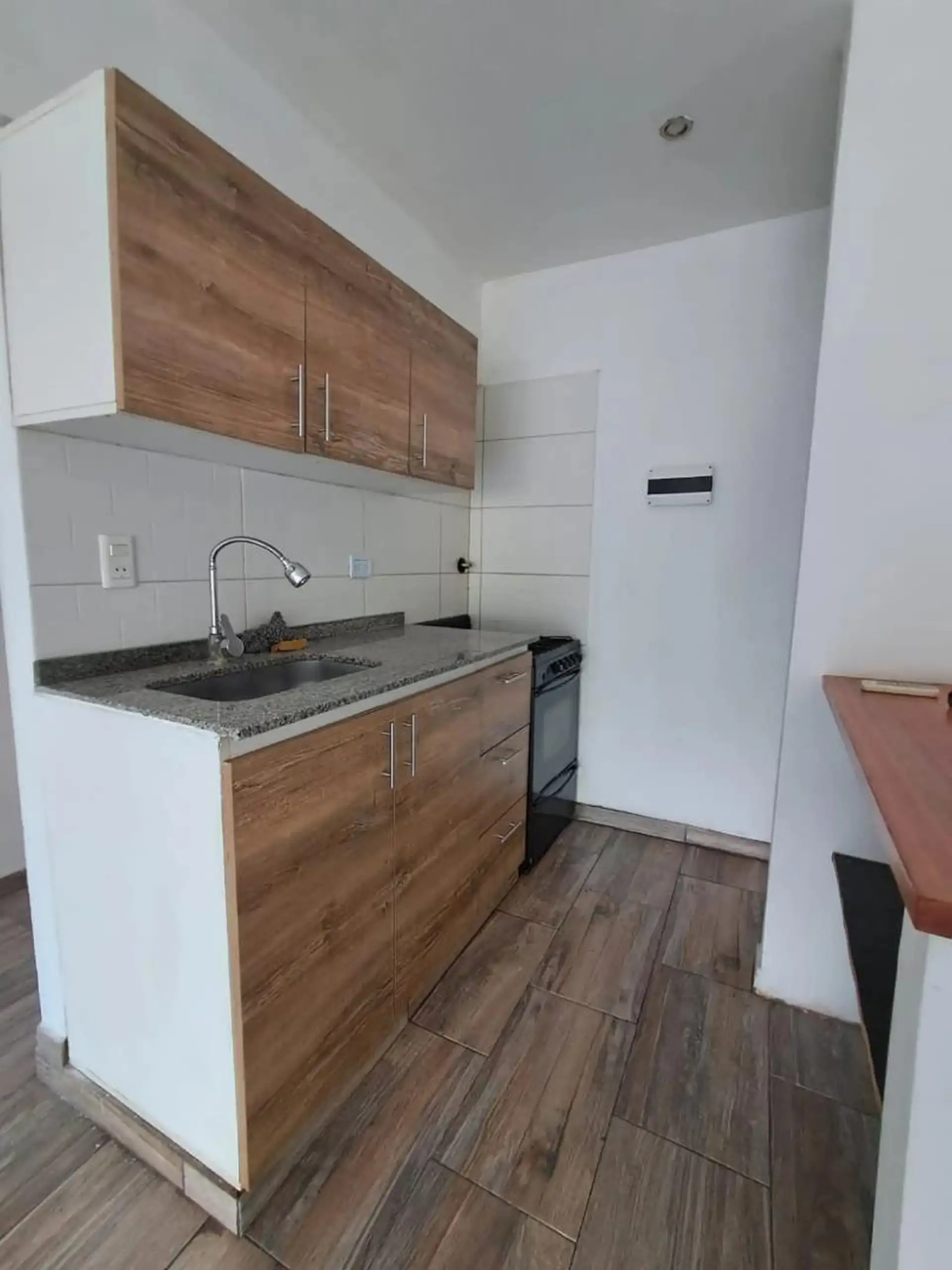 Departamento de 3 ambientes en primer piso por escalera, en Ciudadela. Living comedor con cocina integrada y desayunador, conexión para lavarropas y balcón corrido con vista a la Av. Gaona. Cuenta con baño completo con ducha y 2 habitaciones con placard. Incluye servicios de cloacas y gas; el depósito es de 1 mes e inquilino paga los impuestos.