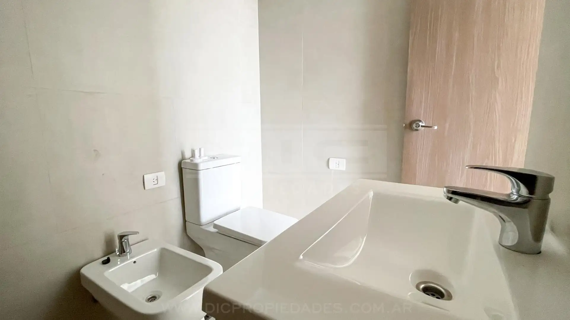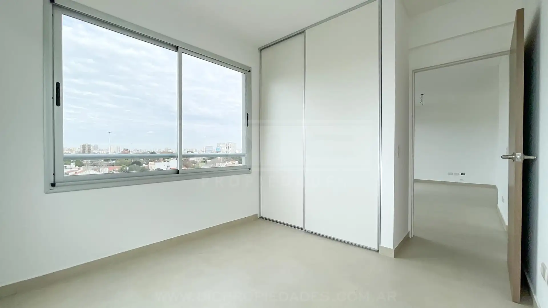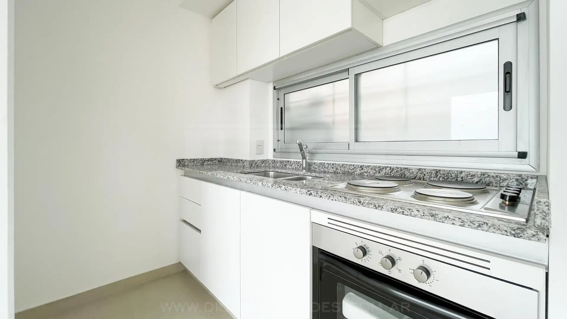 Departamento de 3 ambientes de 58,30 m² orientado al Este, con visuales a espacio verde. Cuenta con estar-comedor con salida al balcón, cocina integrada con mesada de granito natural y horno eléctrico, 2 dormitorios con placard y baño completo más toilette de recepción. Incluye pisos de porcelanato rectificado en todos los ambientes, aberturas con doble vidriado, amplios ventanales y preinstalación para aire tipo split, con sistema central de agua fría y caliente. Hay opción de alquilar cocheras