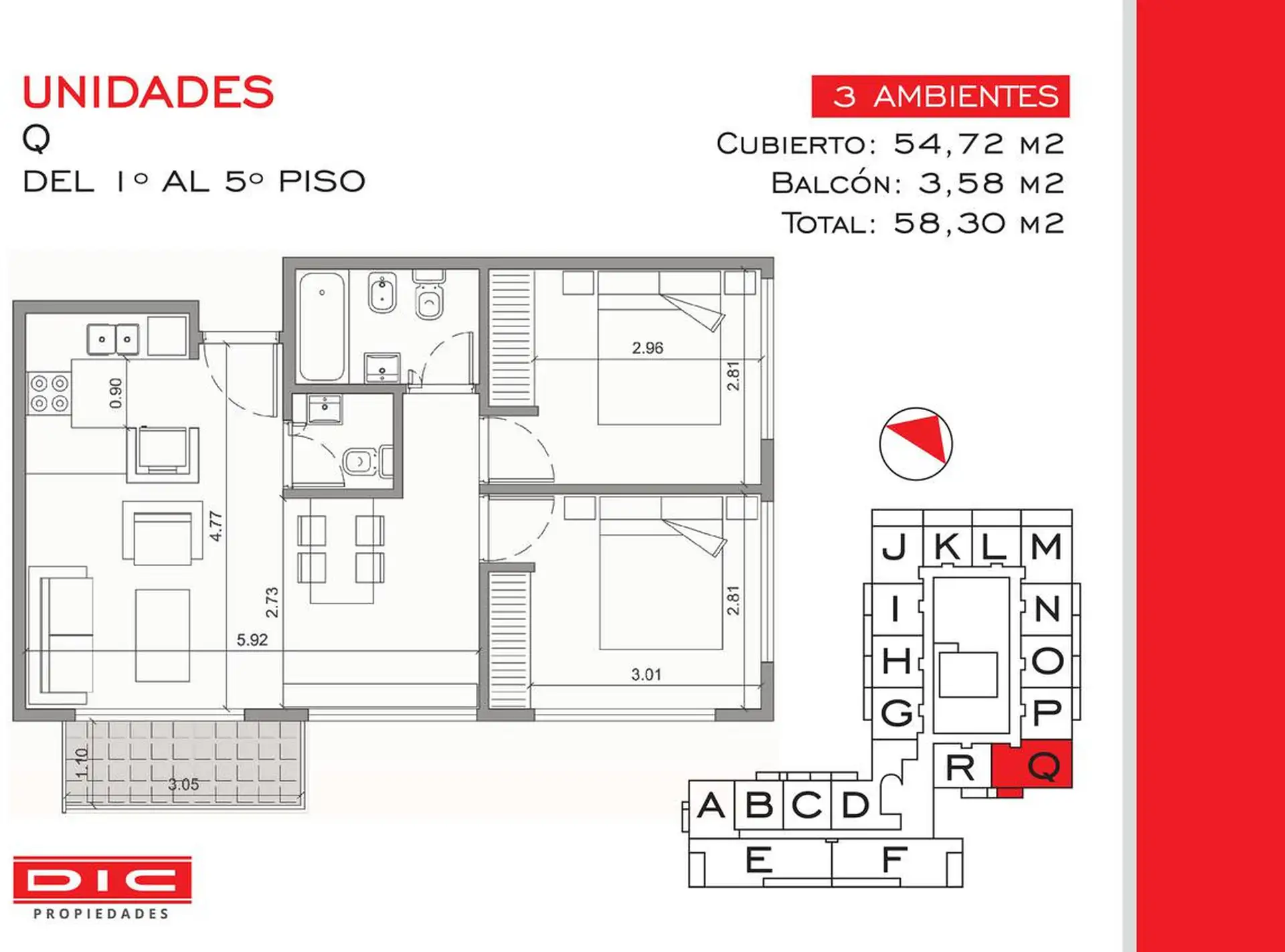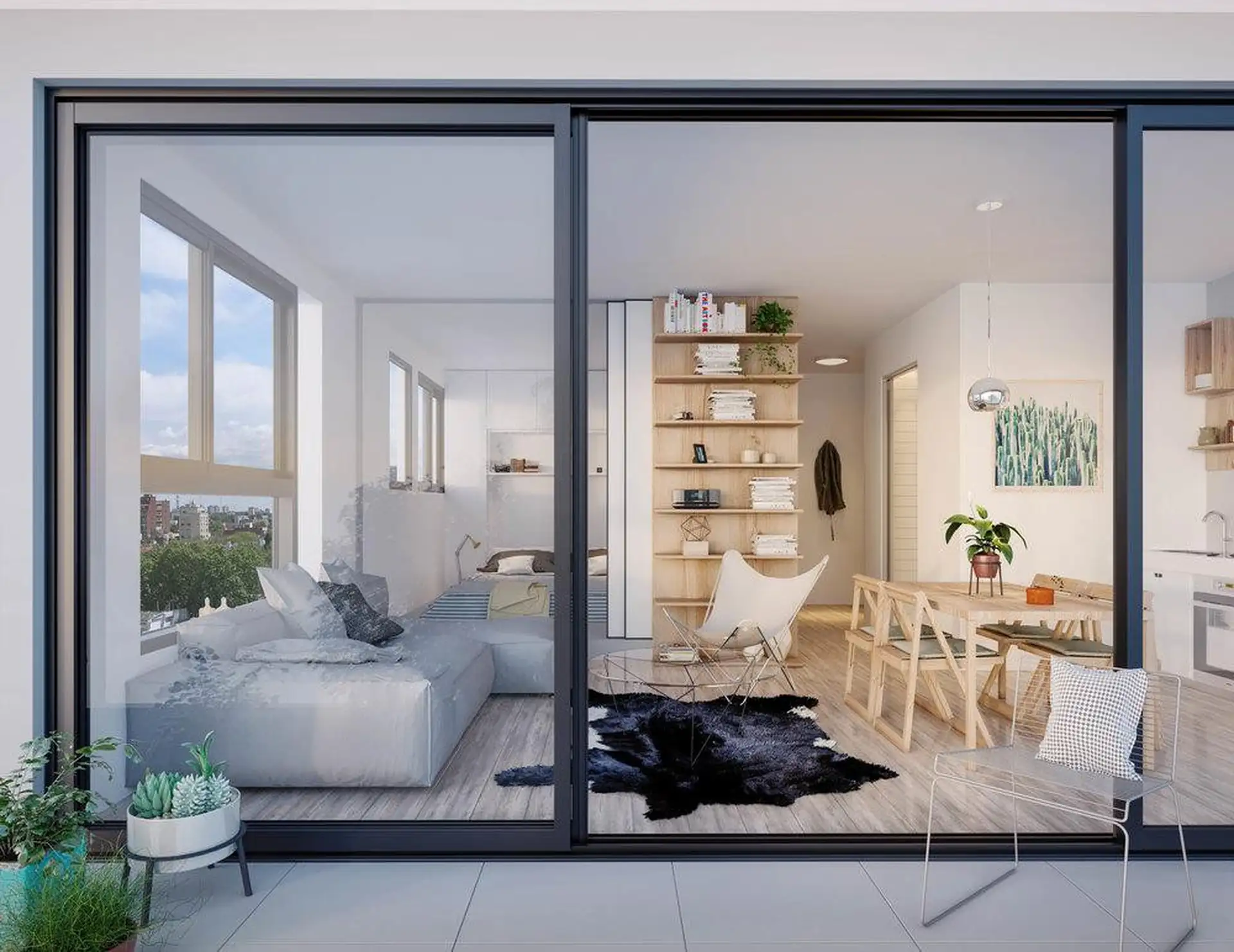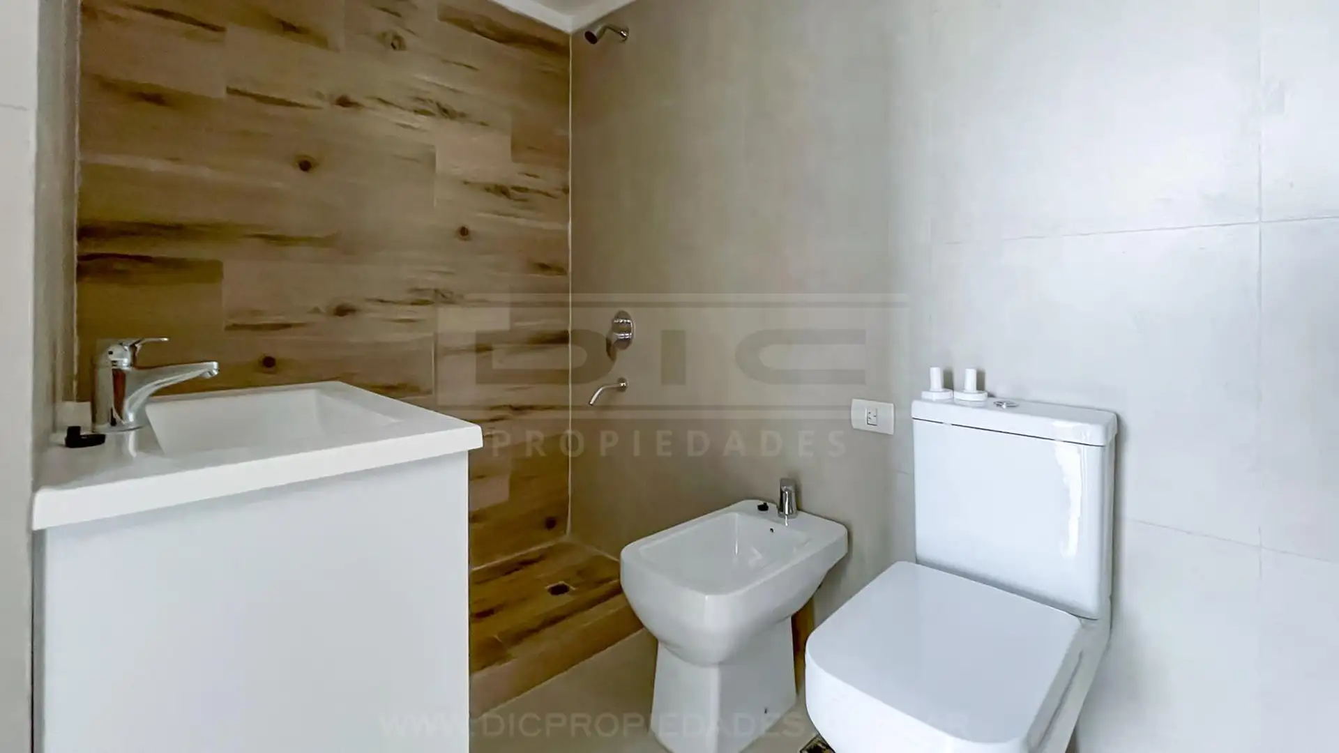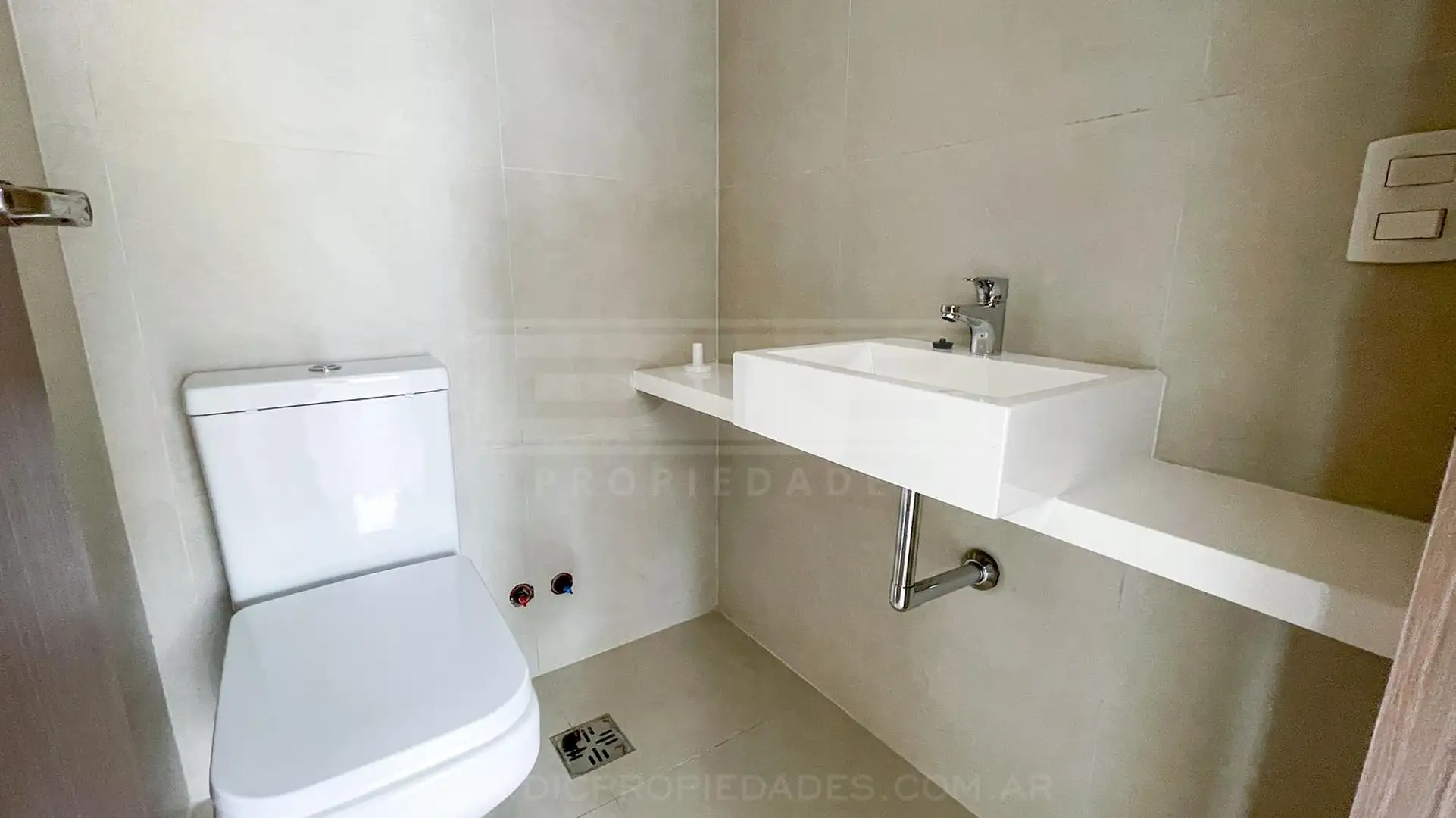 Departamento de 3 ambientes de 58,30 m² orientado al Este, con visuales a espacio verde. Cuenta con estar-comedor con salida al balcón, cocina integrada con mesada de granito natural y horno eléctrico, 2 dormitorios con placard y baño completo más toilette de recepción. Incluye pisos de porcelanato rectificado en todos los ambientes, aberturas con doble vidriado, amplios ventanales y preinstalación para aire tipo split, con sistema central de agua fría y caliente. Hay opción de alquilar cocheras