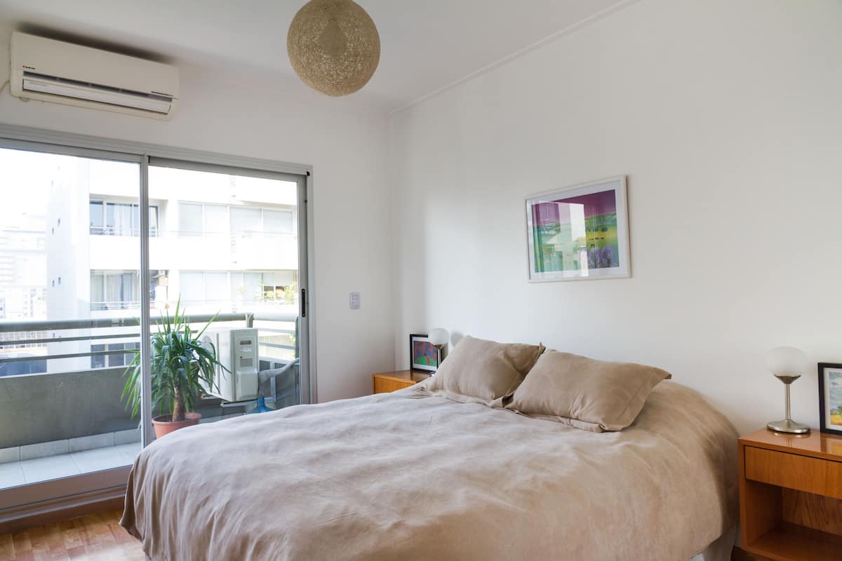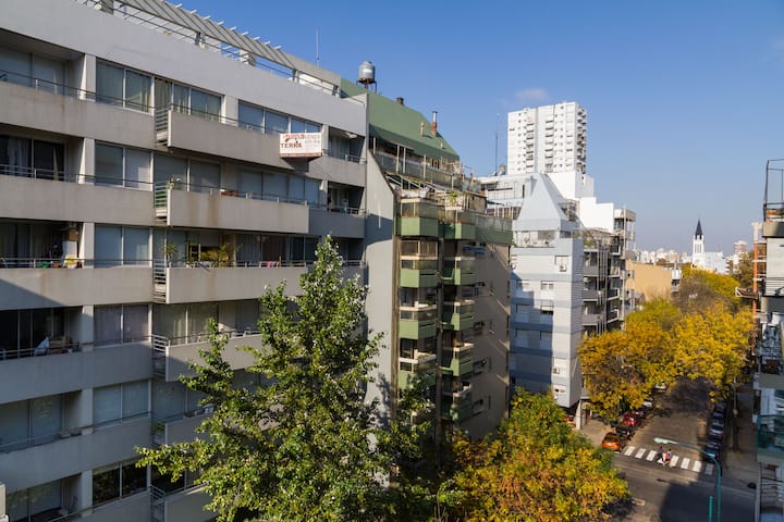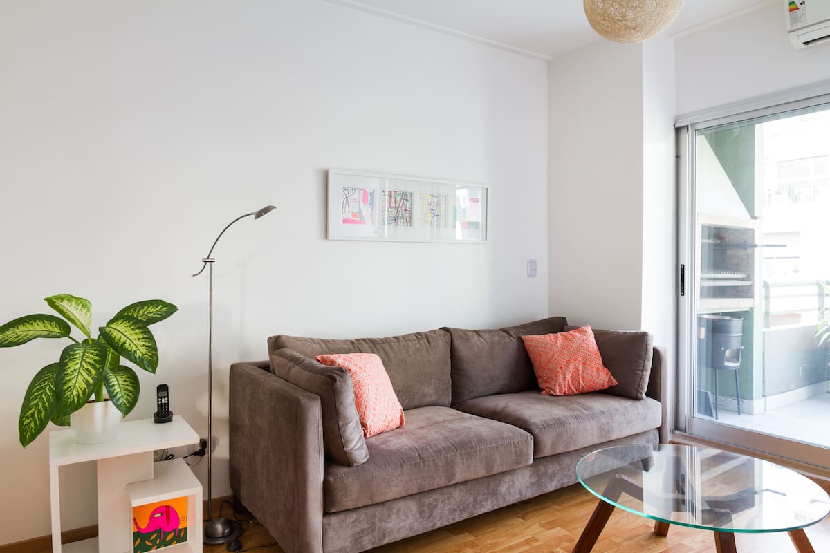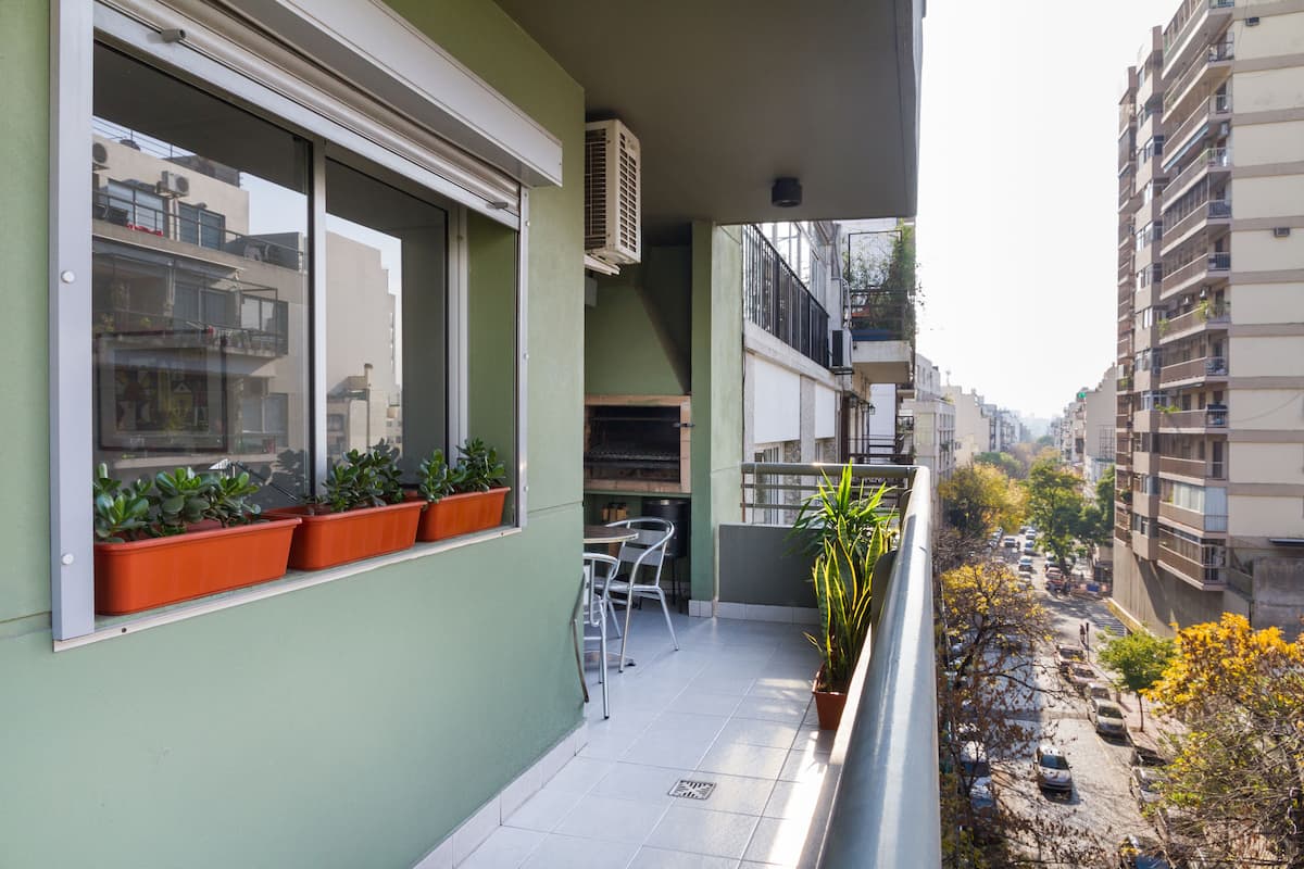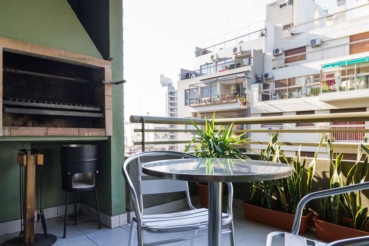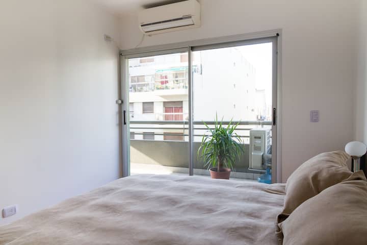 Departamento de 3 ambientes en Villa Crespo, con 2 dormitorios y balcón. El edificio tiene 5 años y el departamento fue recientemente pintado, amoblado y decorado. Cuenta con aire acondicionado y TV Smart de 42", WiFi de 12 MB/s, y cable Digital/HD. La cocina integrada incluye heladera y el balcón tiene parrilla; el dormitorio principal tiene baño en suite. El segundo dormitorio tiene 2 camas individuales y escritorio. Hay un baño adicional con ducha.