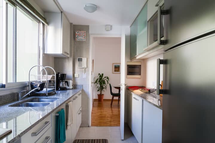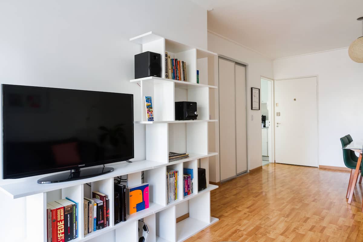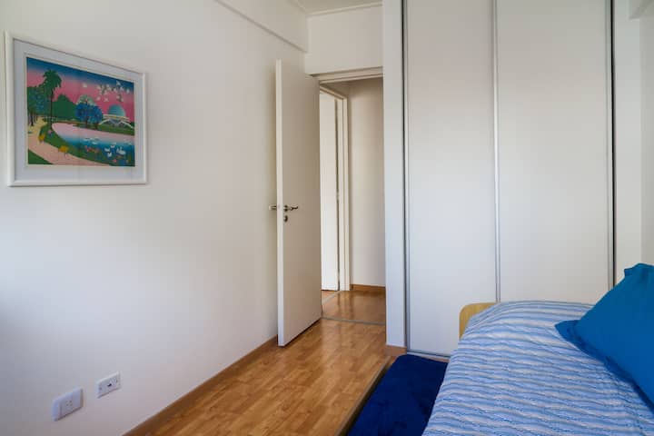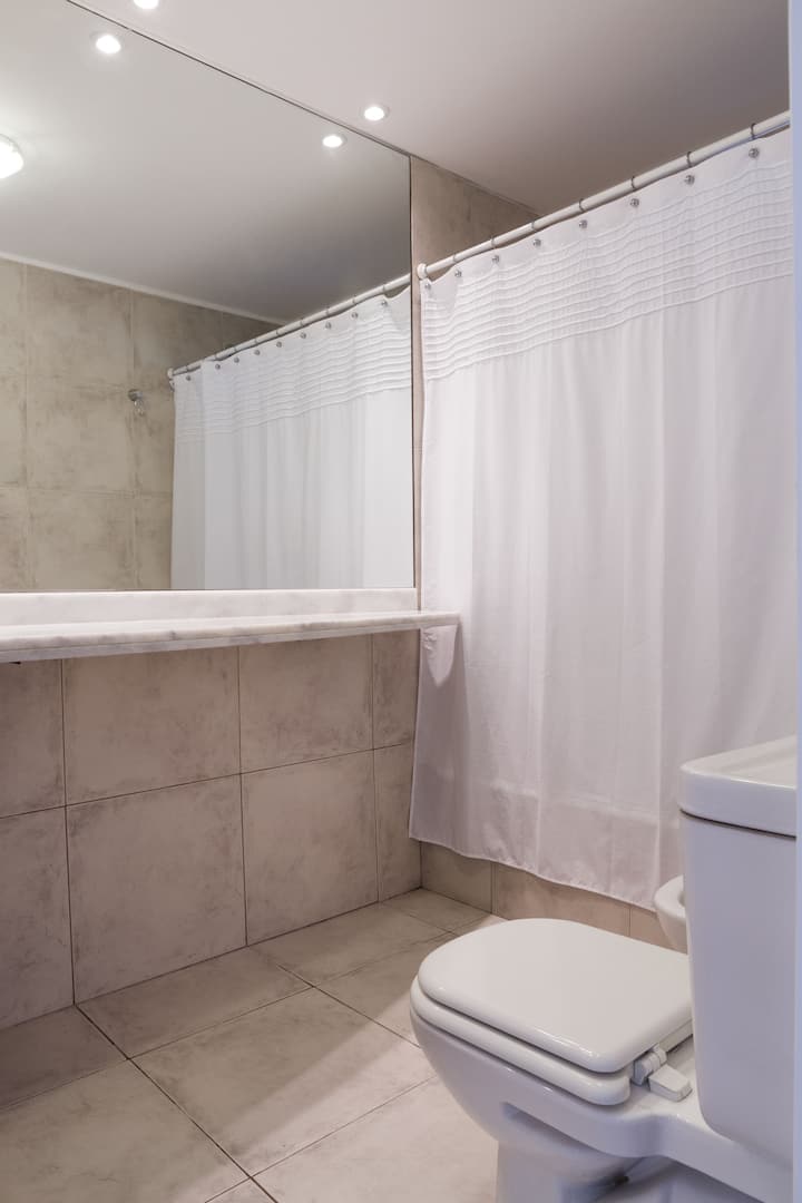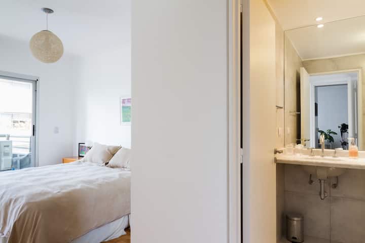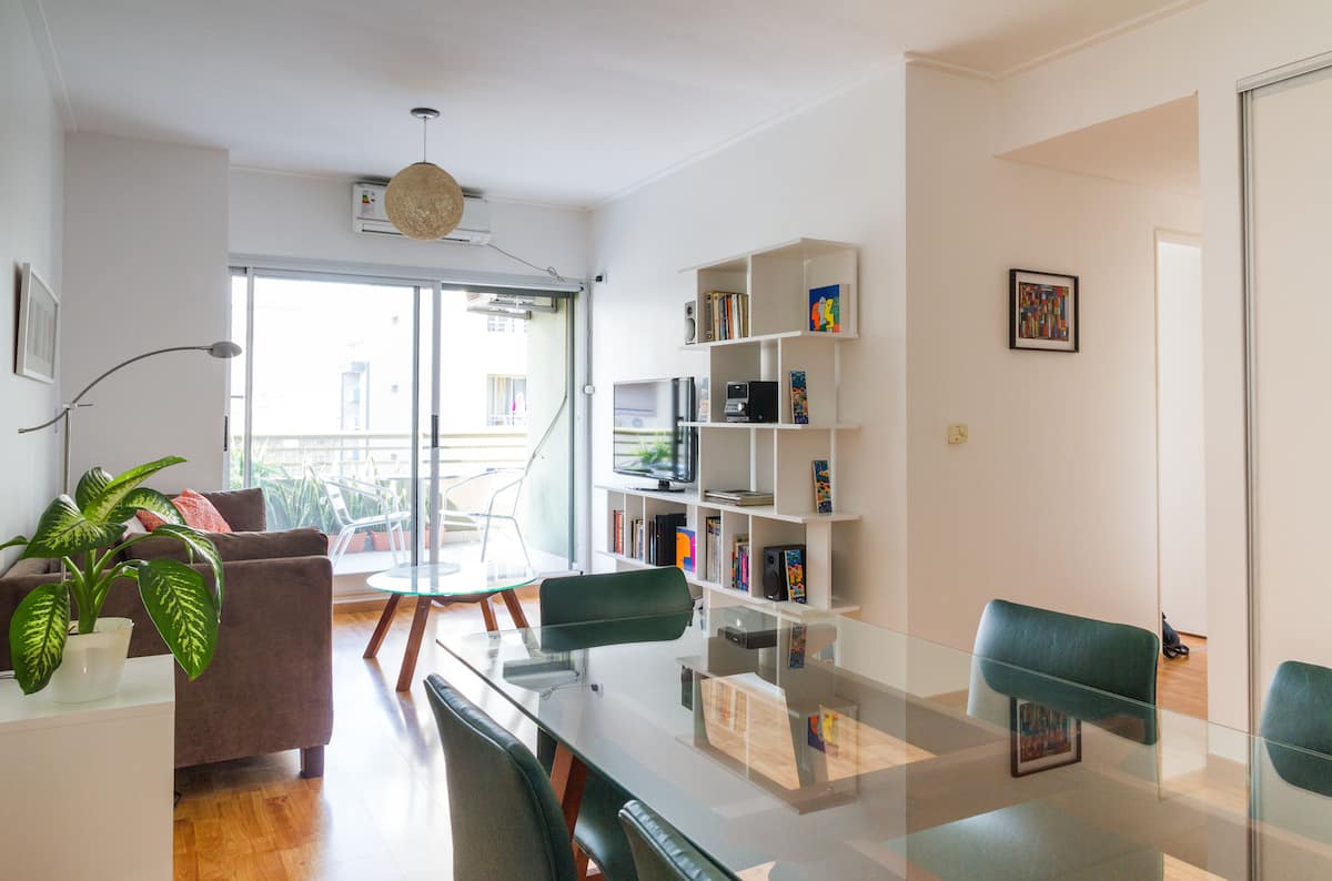 Departamento de 3 ambientes en Villa Crespo, con 2 dormitorios y balcón. El edificio tiene 5 años y el departamento fue recientemente pintado, amoblado y decorado. Cuenta con aire acondicionado y TV Smart de 42", WiFi de 12 MB/s, y cable Digital/HD. La cocina integrada incluye heladera y el balcón tiene parrilla; el dormitorio principal tiene baño en suite. El segundo dormitorio tiene 2 camas individuales y escritorio. Hay un baño adicional con ducha.
