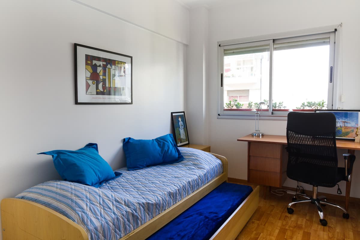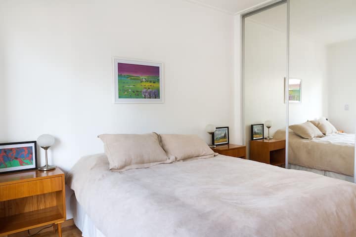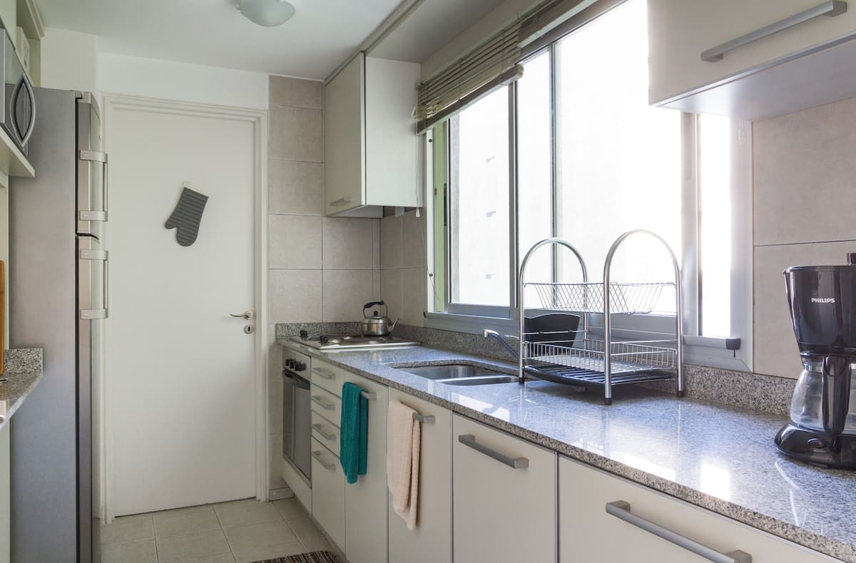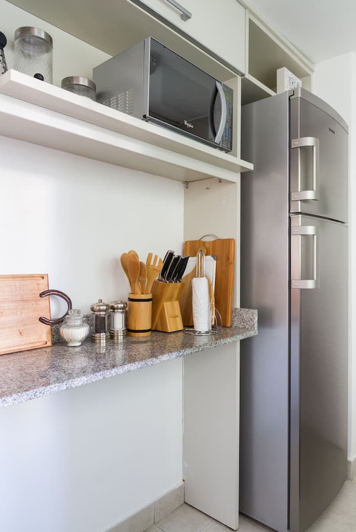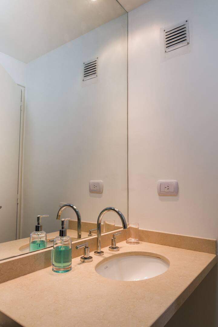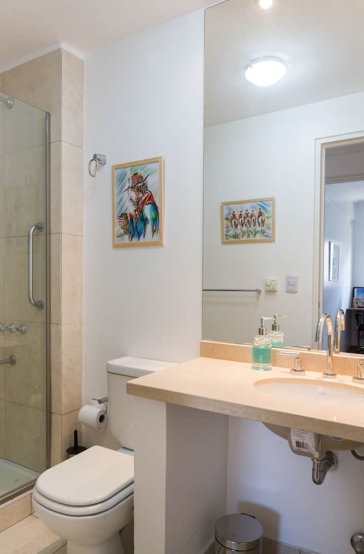 Departamento de 3 ambientes en Villa Crespo, con 2 dormitorios y balcón. El edificio tiene 5 años y el departamento fue recientemente pintado, amoblado y decorado. Cuenta con aire acondicionado y TV Smart de 42", WiFi de 12 MB/s, y cable Digital/HD. La cocina integrada incluye heladera y el balcón tiene parrilla; el dormitorio principal tiene baño en suite. El segundo dormitorio tiene 2 camas individuales y escritorio. Hay un baño adicional con ducha.